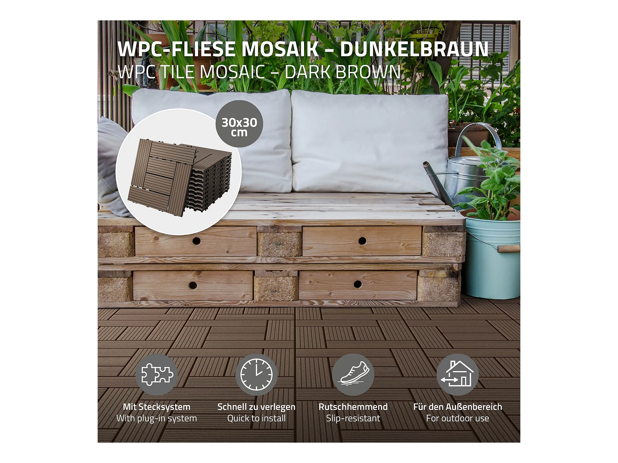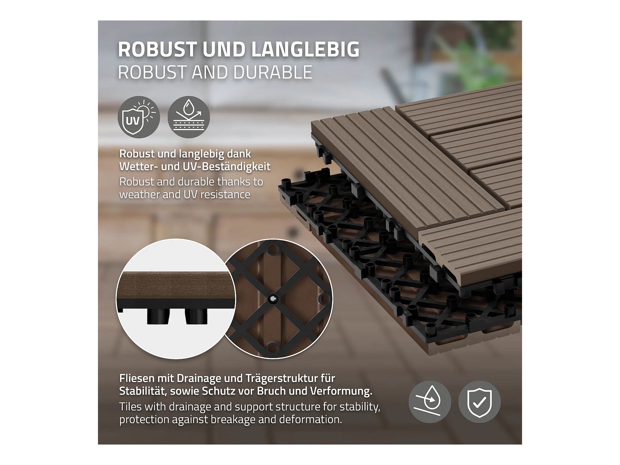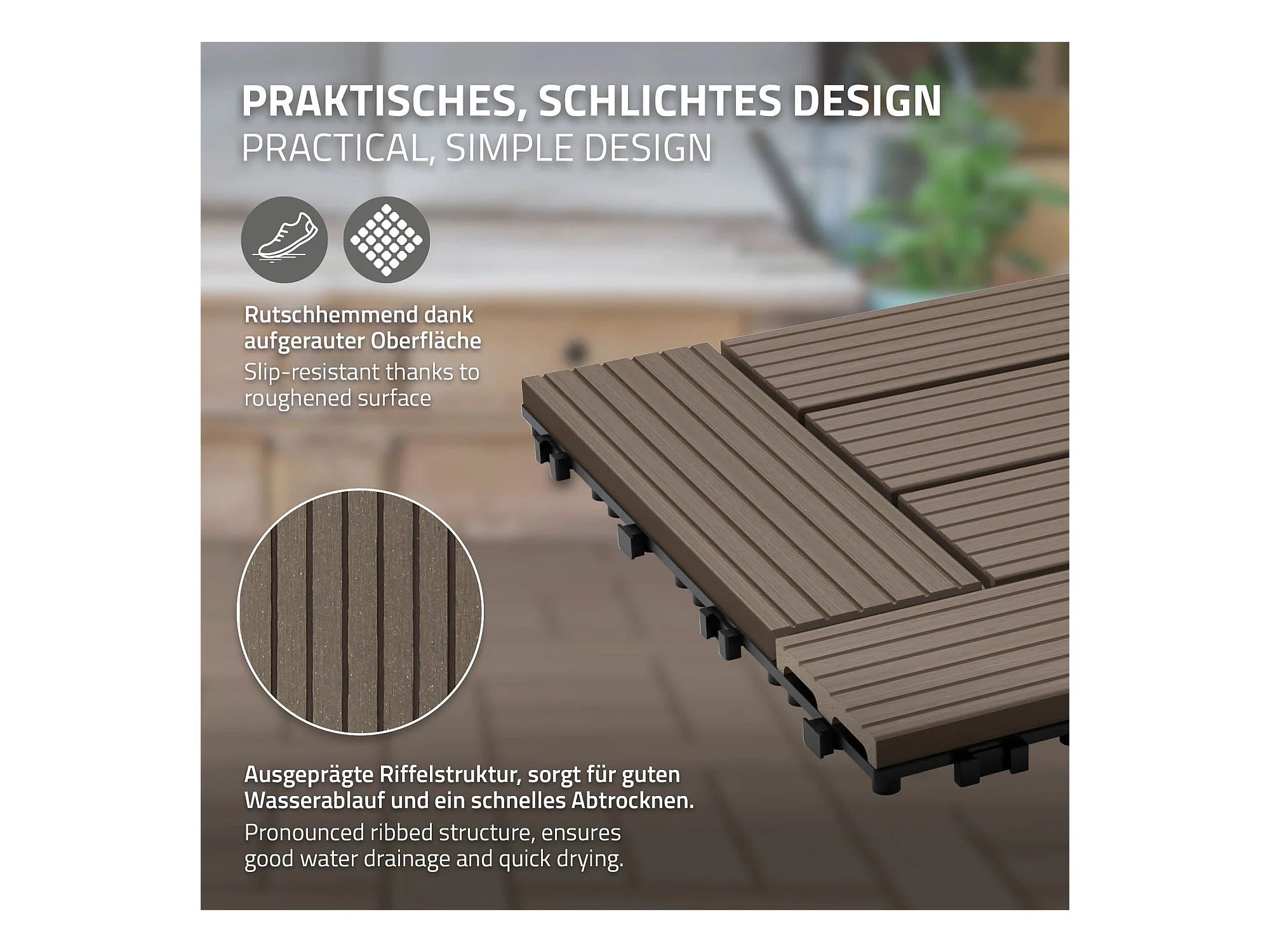 ECD Germany Piastrelle per terrazze wpc 30x30 cm marrone scuro set 22 pz 2 m² effetto legno con drenaggio clic per balconi giardini pavimenti esterni