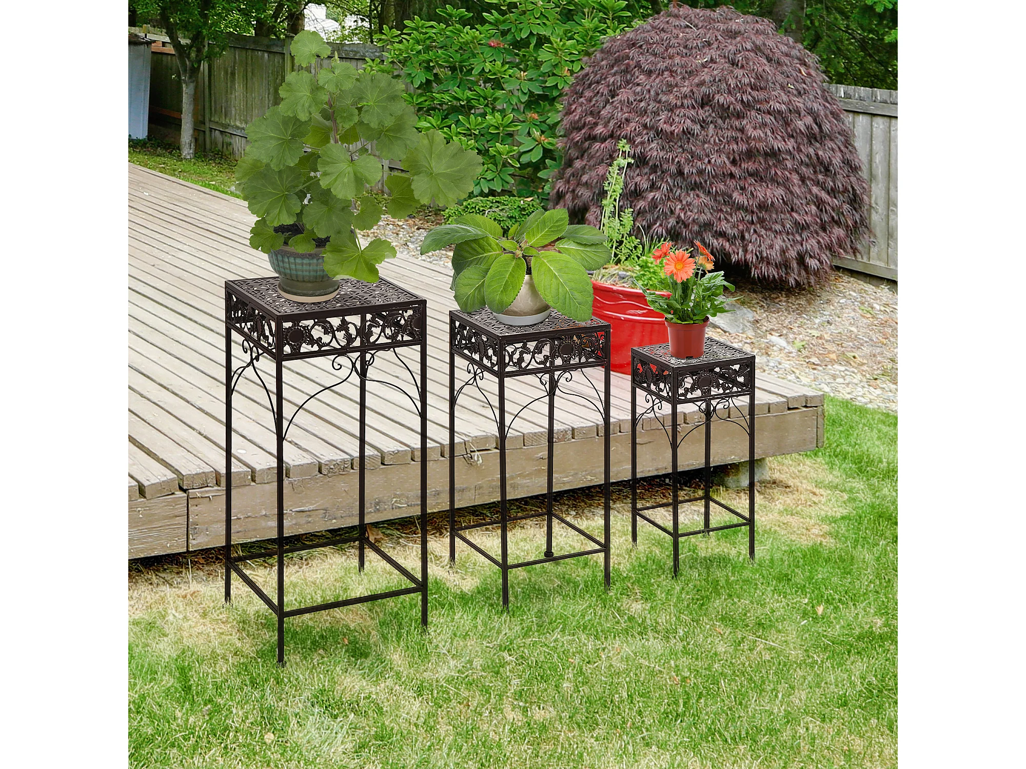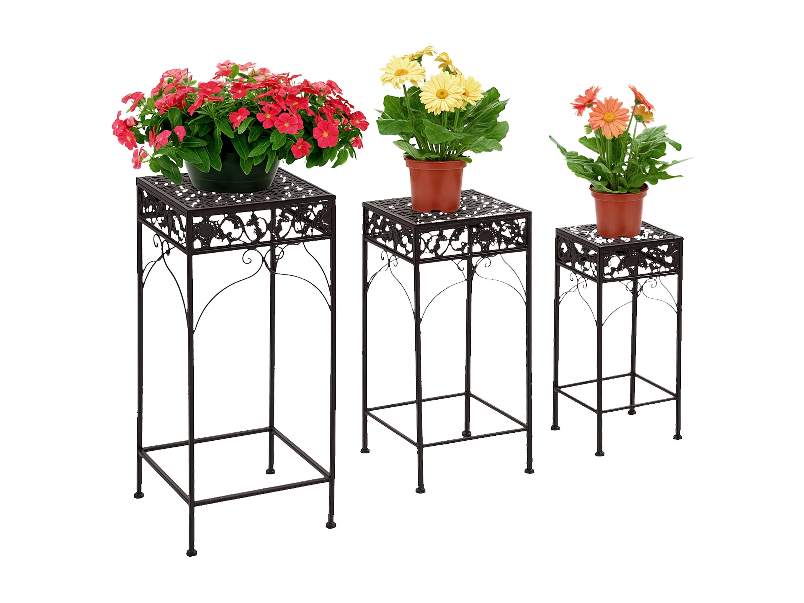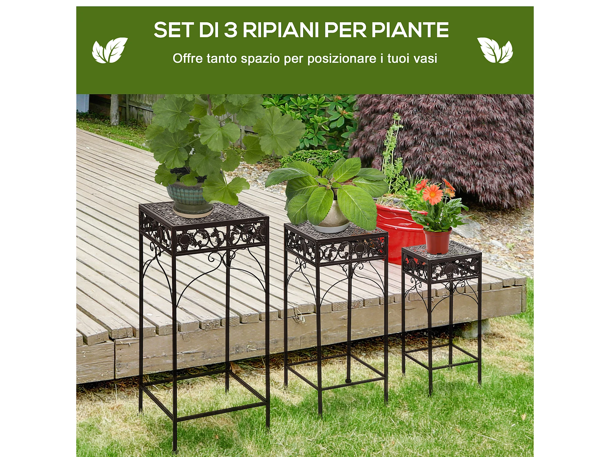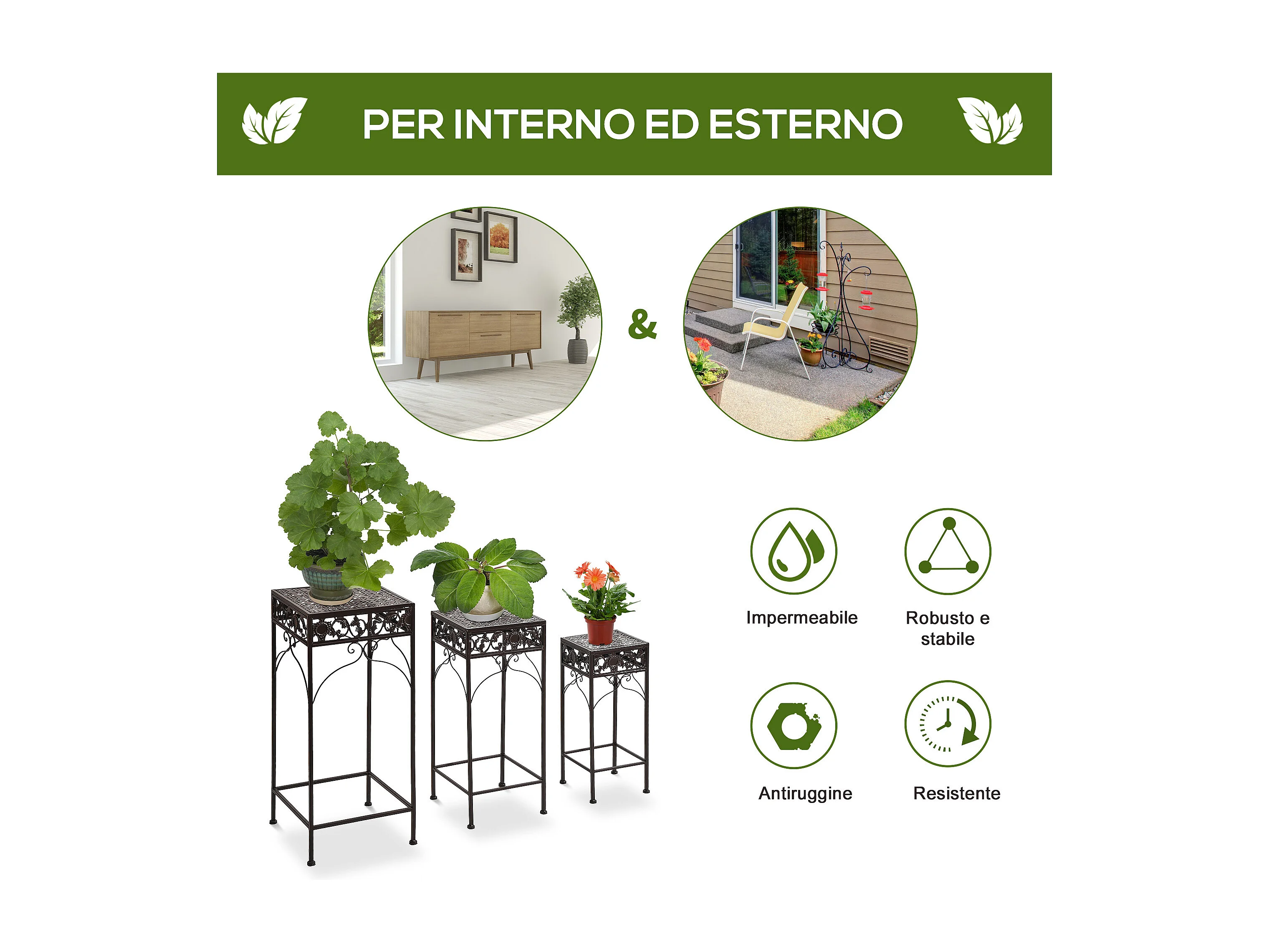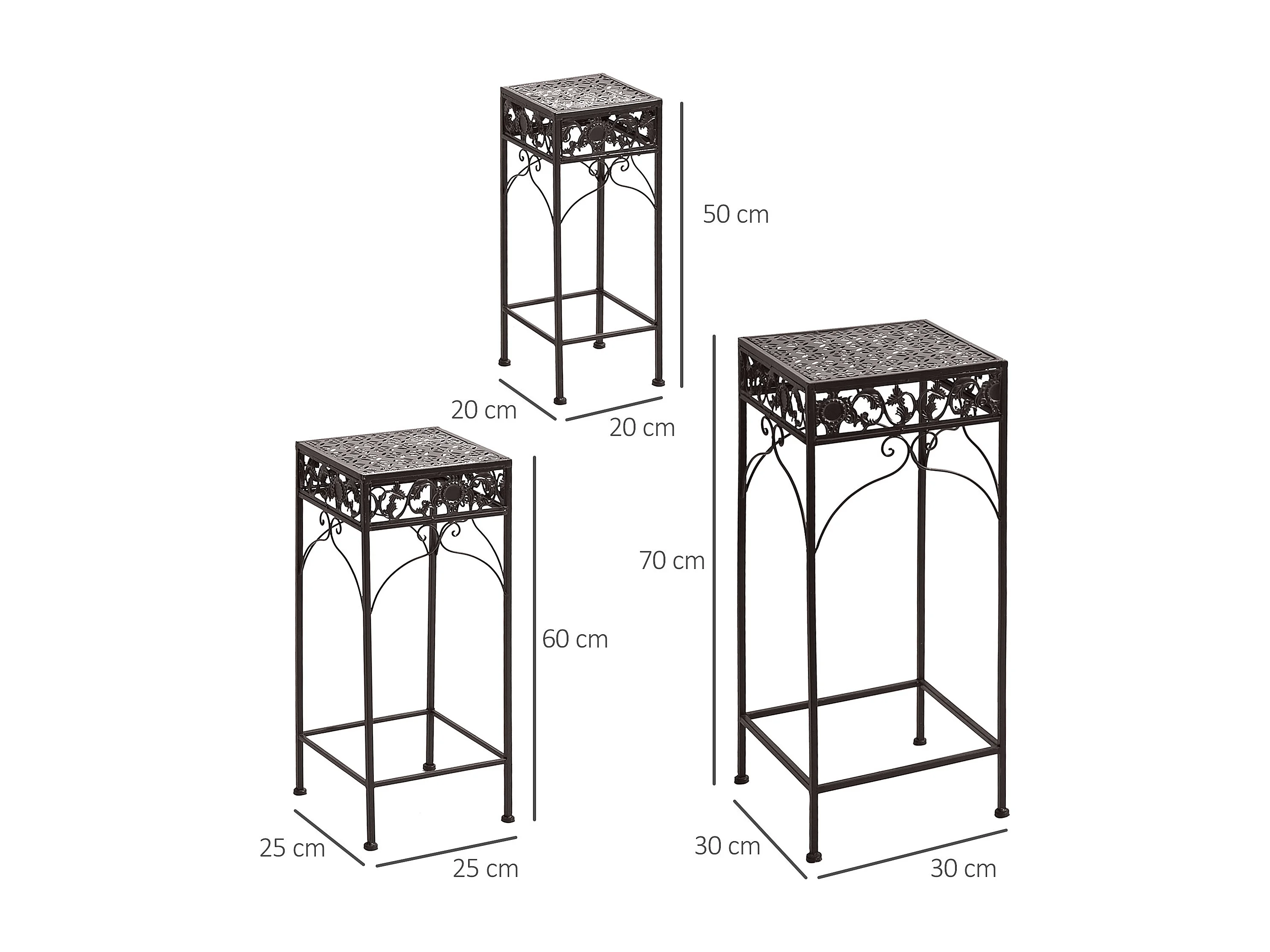 Set di 3 pezzi sgabelli supporto per piante classico in ferro marrone