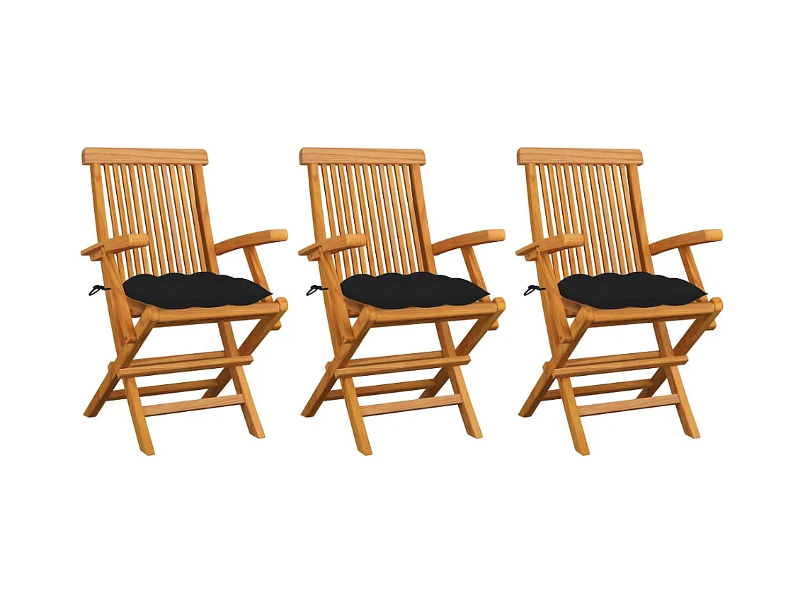 Set di 3 sedie da giardino con cuscini neri in legno massello di teak