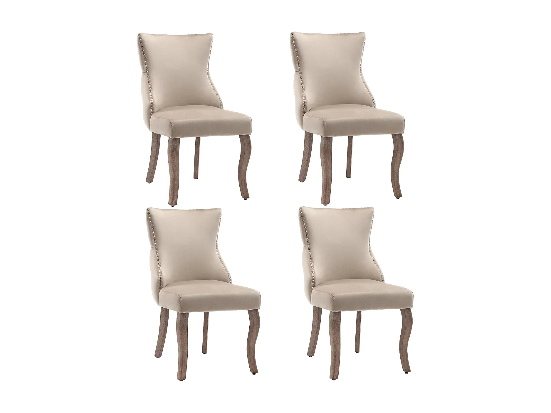 Set di 4 sedie da pranzo, sedia imbottita con finiture a borchie, tessuto in velluto, gambe in legno massello, beige.