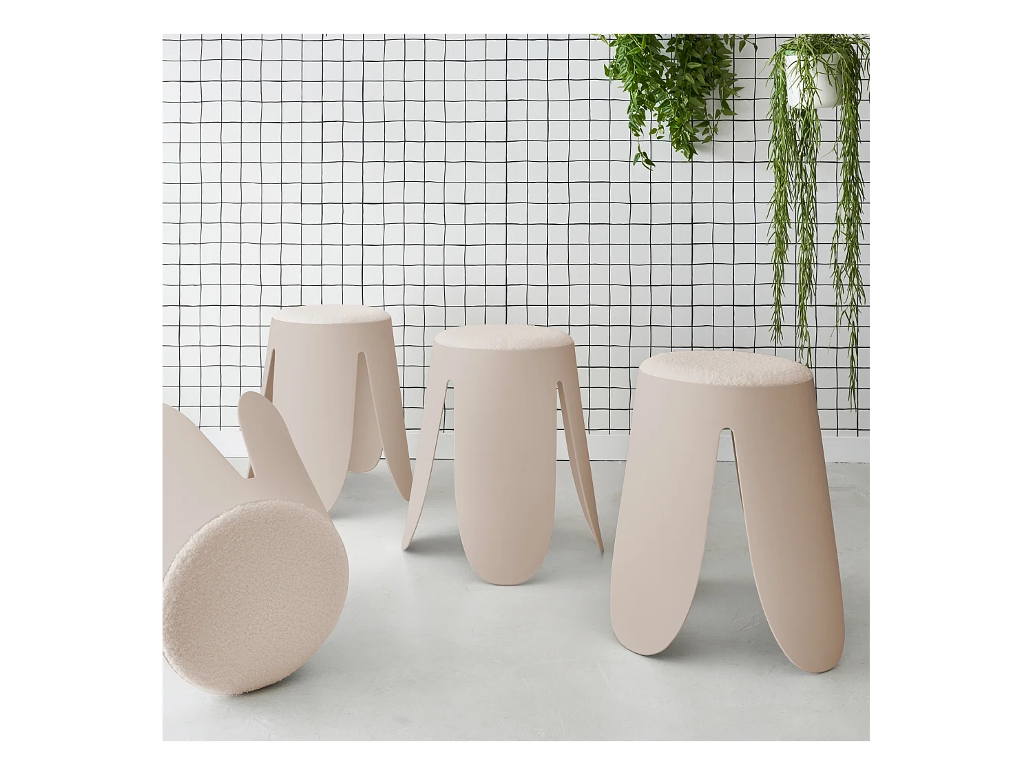 Set di 4 sgabelli impilabili in materiale bouclé, beige