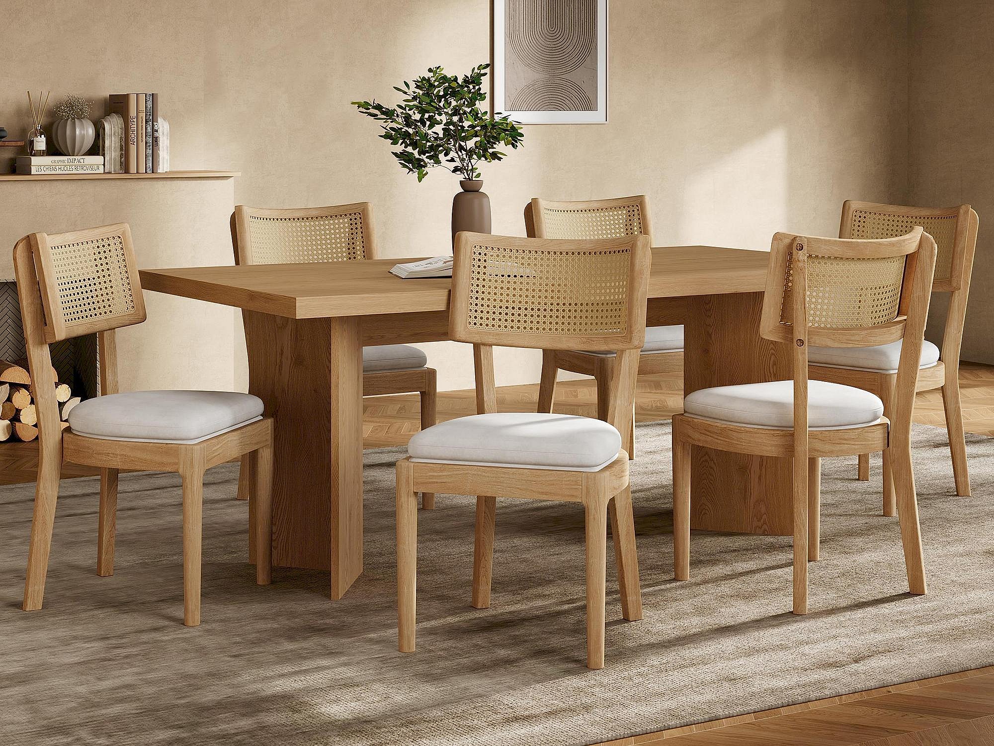 Set di 6 sedie da pranzo - Schienale in rattan - Seduta in velluto - Legno massello - Naturale