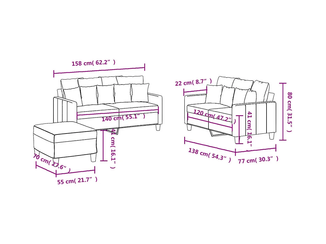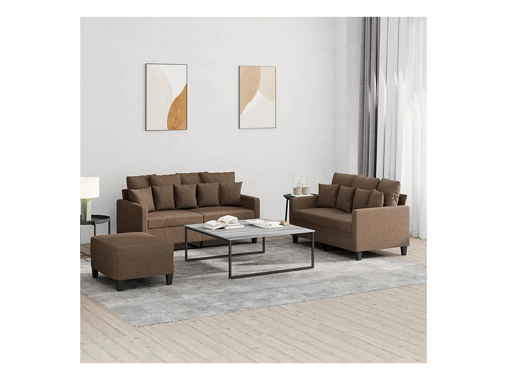 Set di divani 3 pezzi con cuscini in tessuto marrone