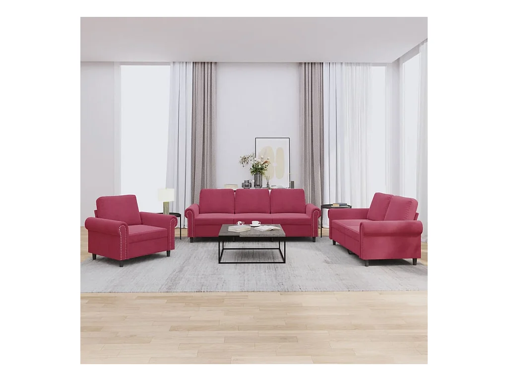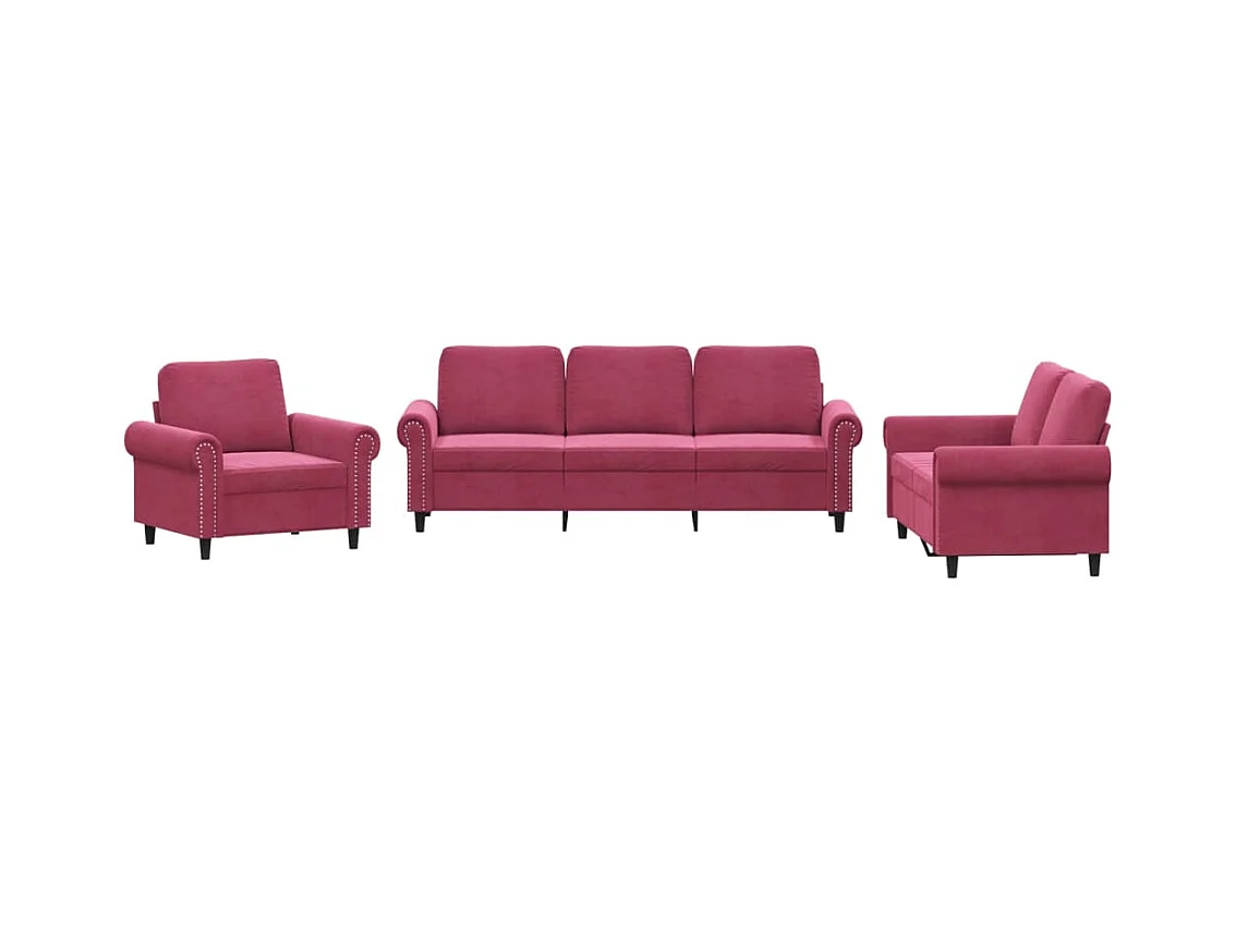Set di Divani 3 pz con Cuscini e Rinforzi Rosso Vino in Velluto
