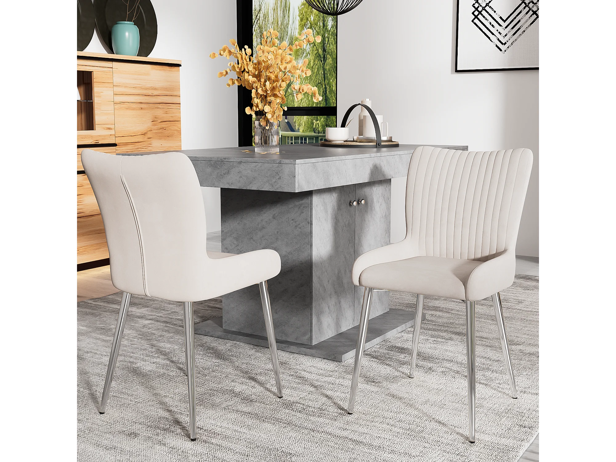Set di due sedie da pranzo - Velluto beige - Con gambe e schienale argentati - Per sala da pranzo e camera da letto