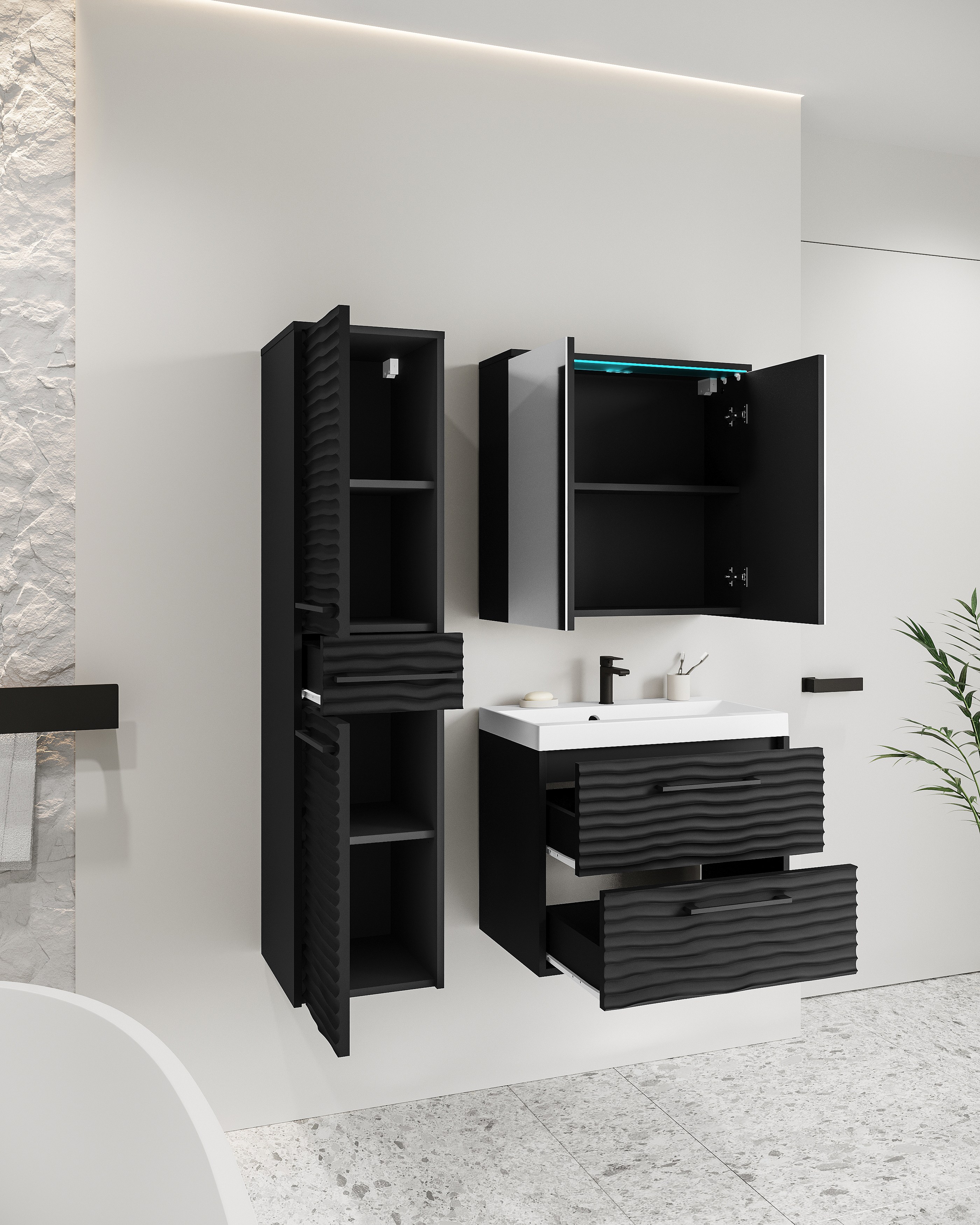 Mobili da bagno moderni, set sospeso con lavabo, specchio e colonna, frontali in MDF ondulato, nero opaco