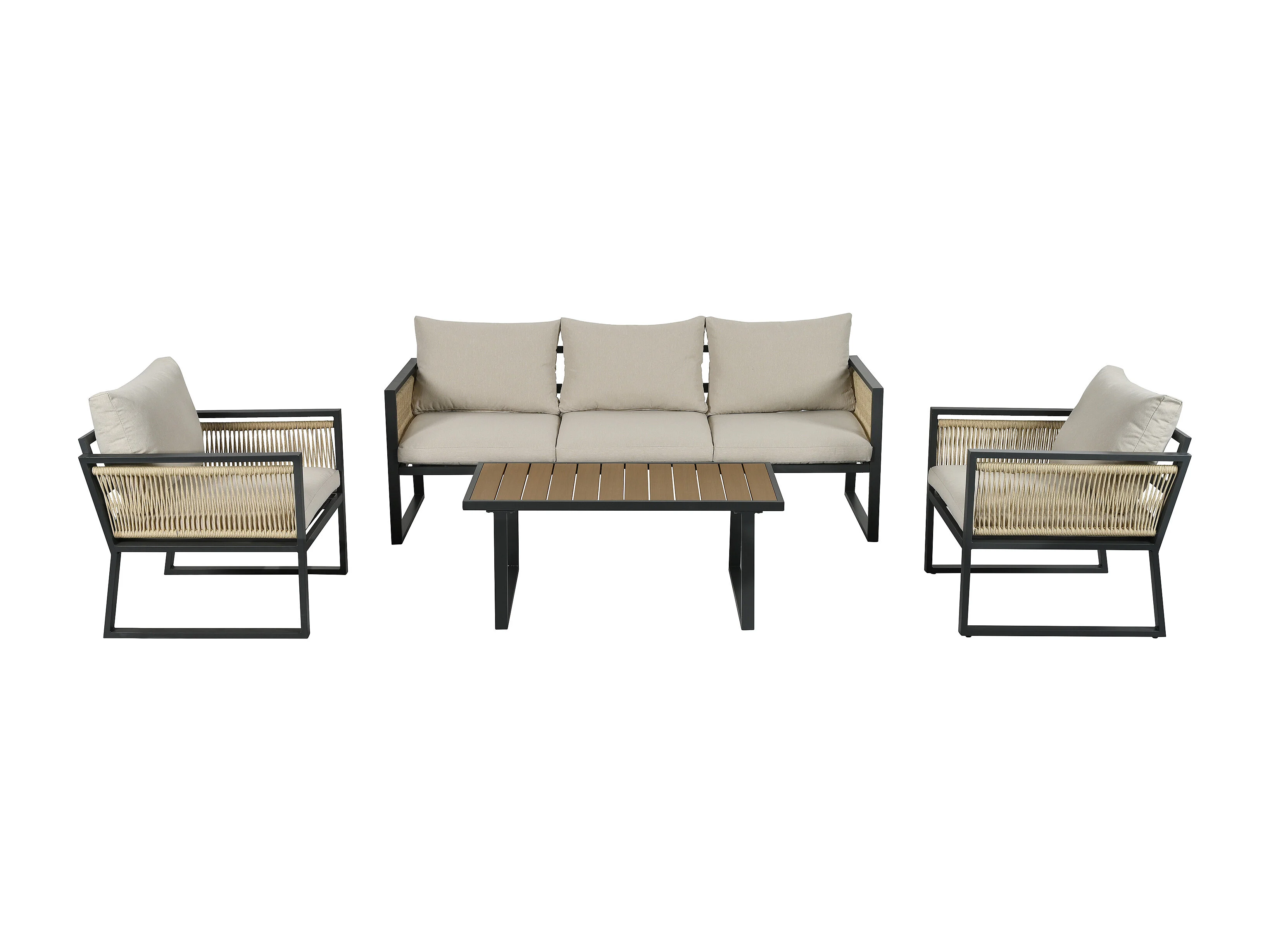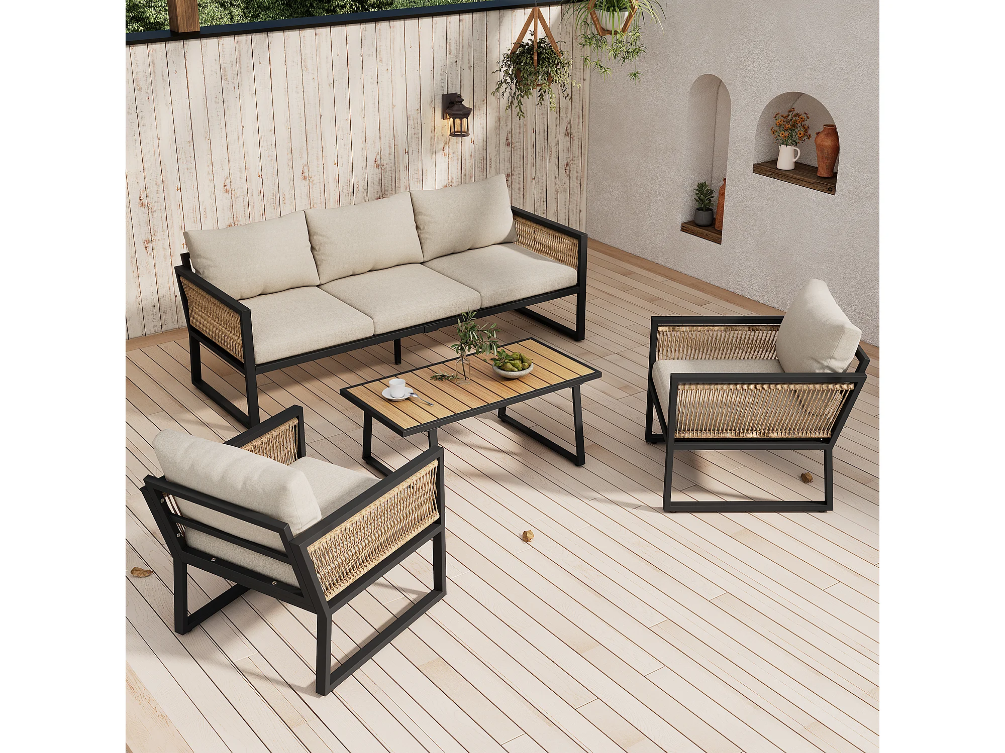 Set di mobili da giardino 4 pezzi, divano a 3 posti, 2 poltrone e tavolino, beige