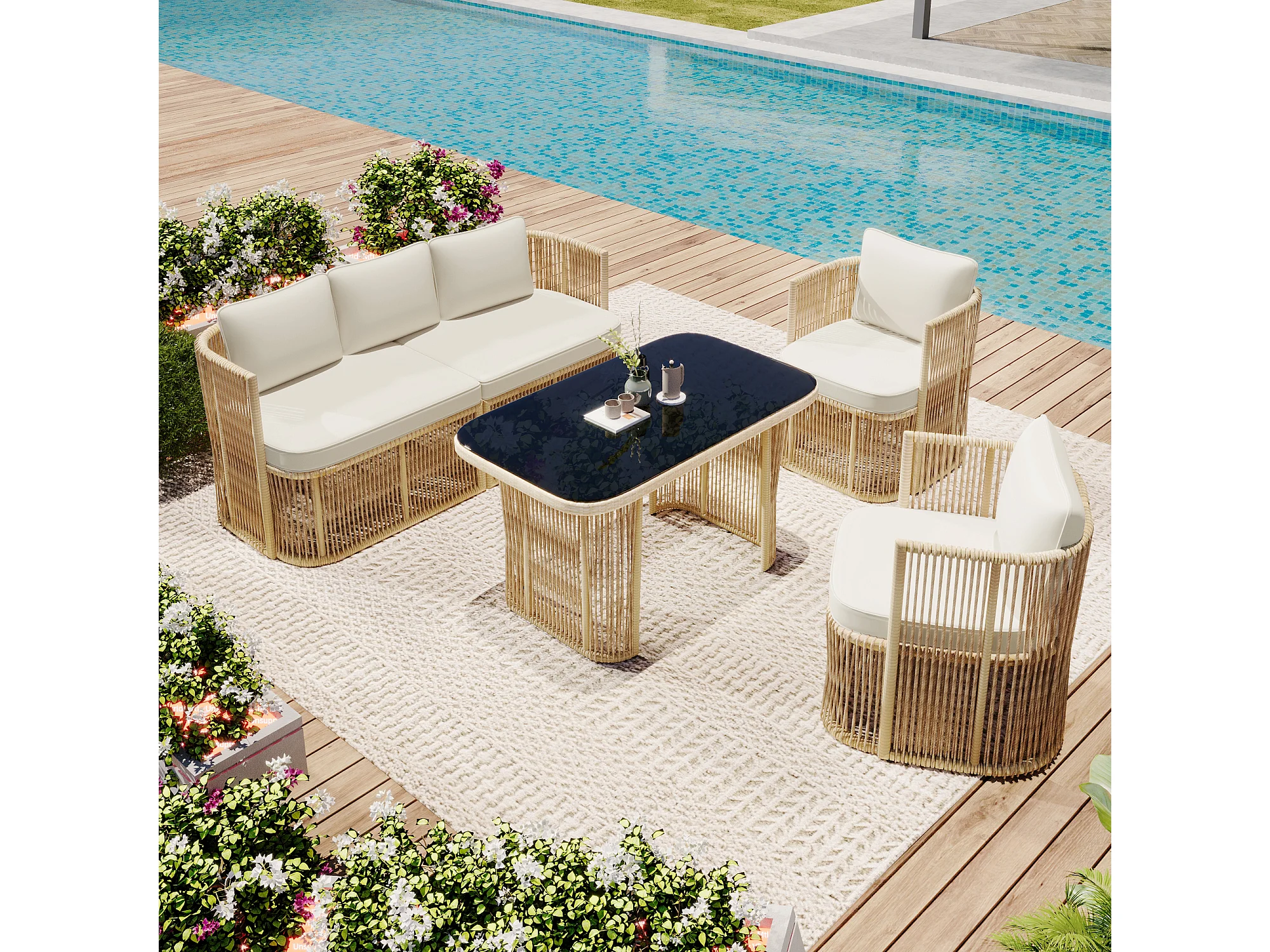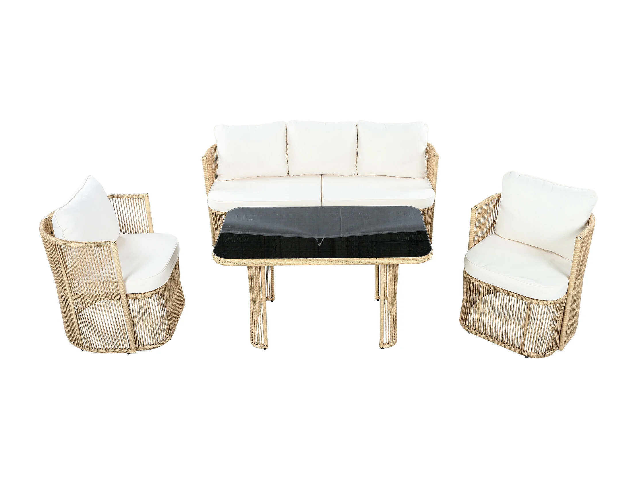 Set di mobili da giardino 5 pezzi, rattan PE, con cuscini in poliestere, struttura in acciaio e piano in vetro temperato, beige