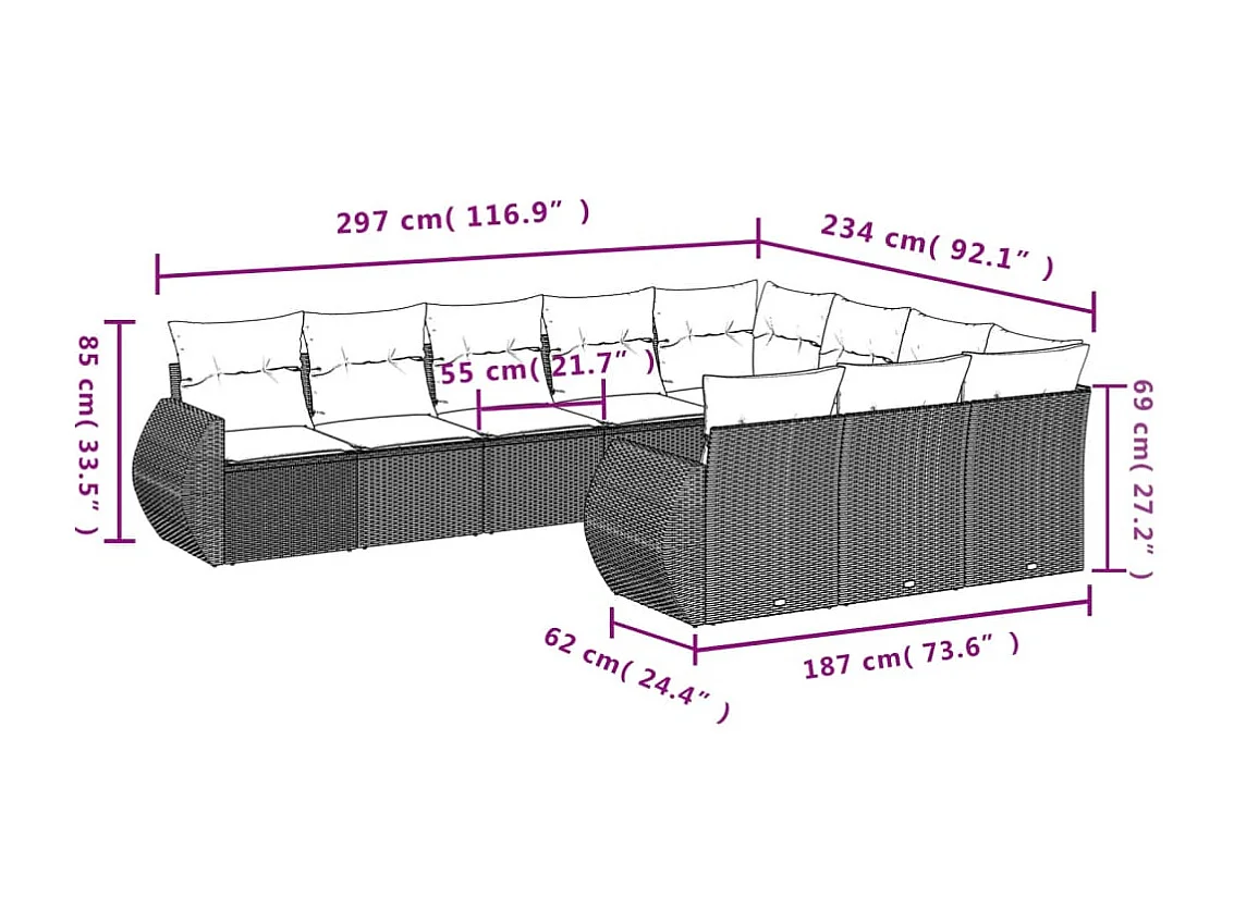 Set di mobili da giardino da 11 pezzi con cuscini in vimini di resina grigia