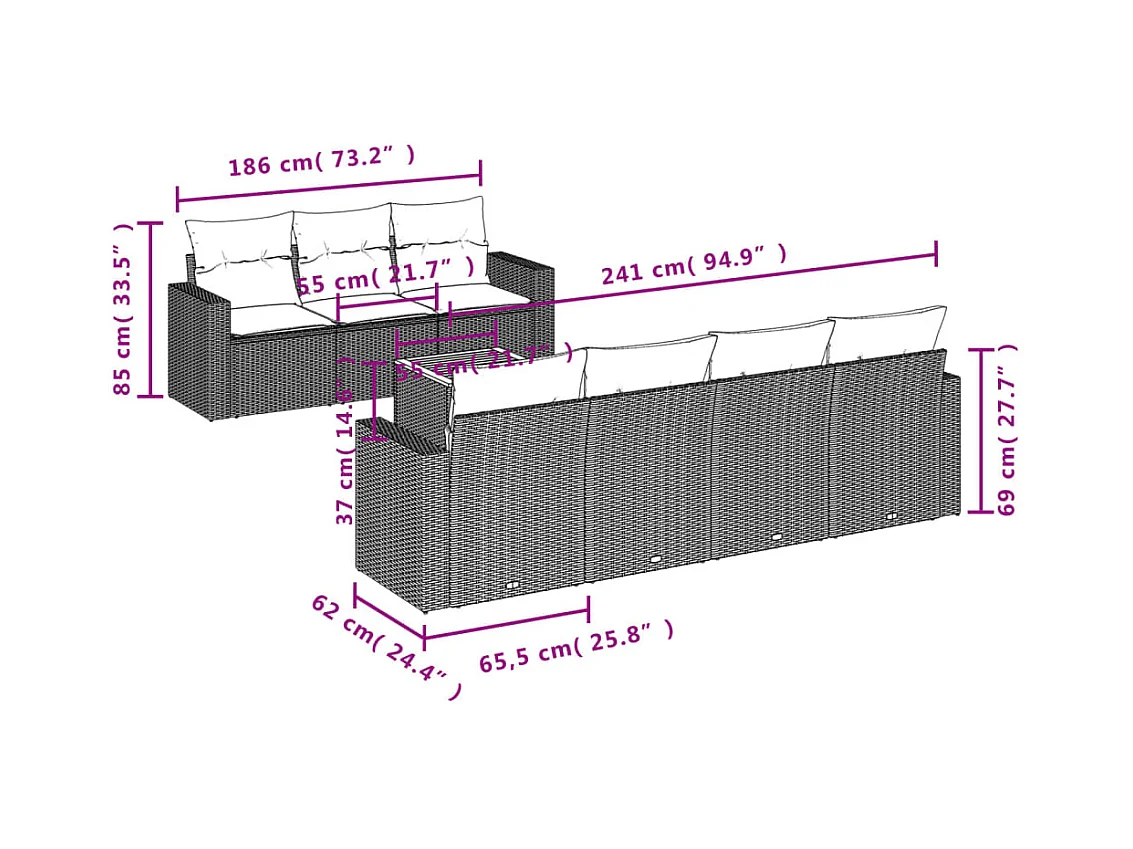 Set di mobili da giardino da 8 pezzi con cuscini in vimini di resina grigia