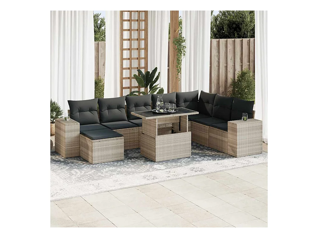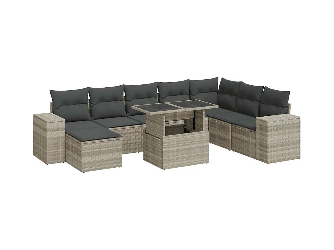Set di mobili da giardino da 9 pezzi con cuscini grigio chiaro in resina intrecciata