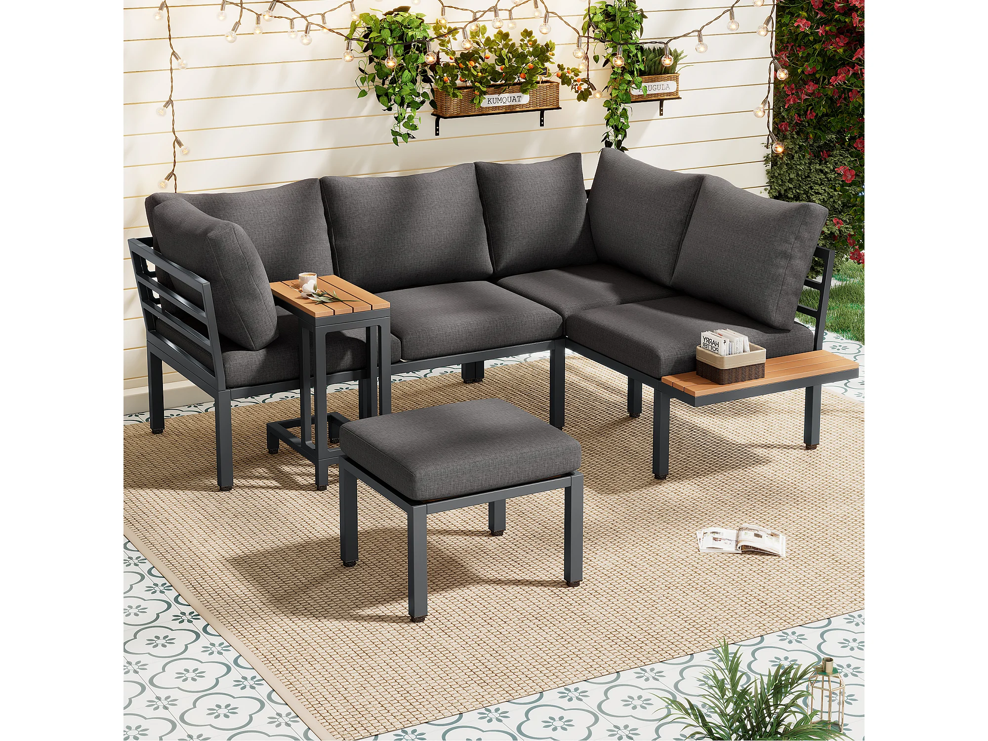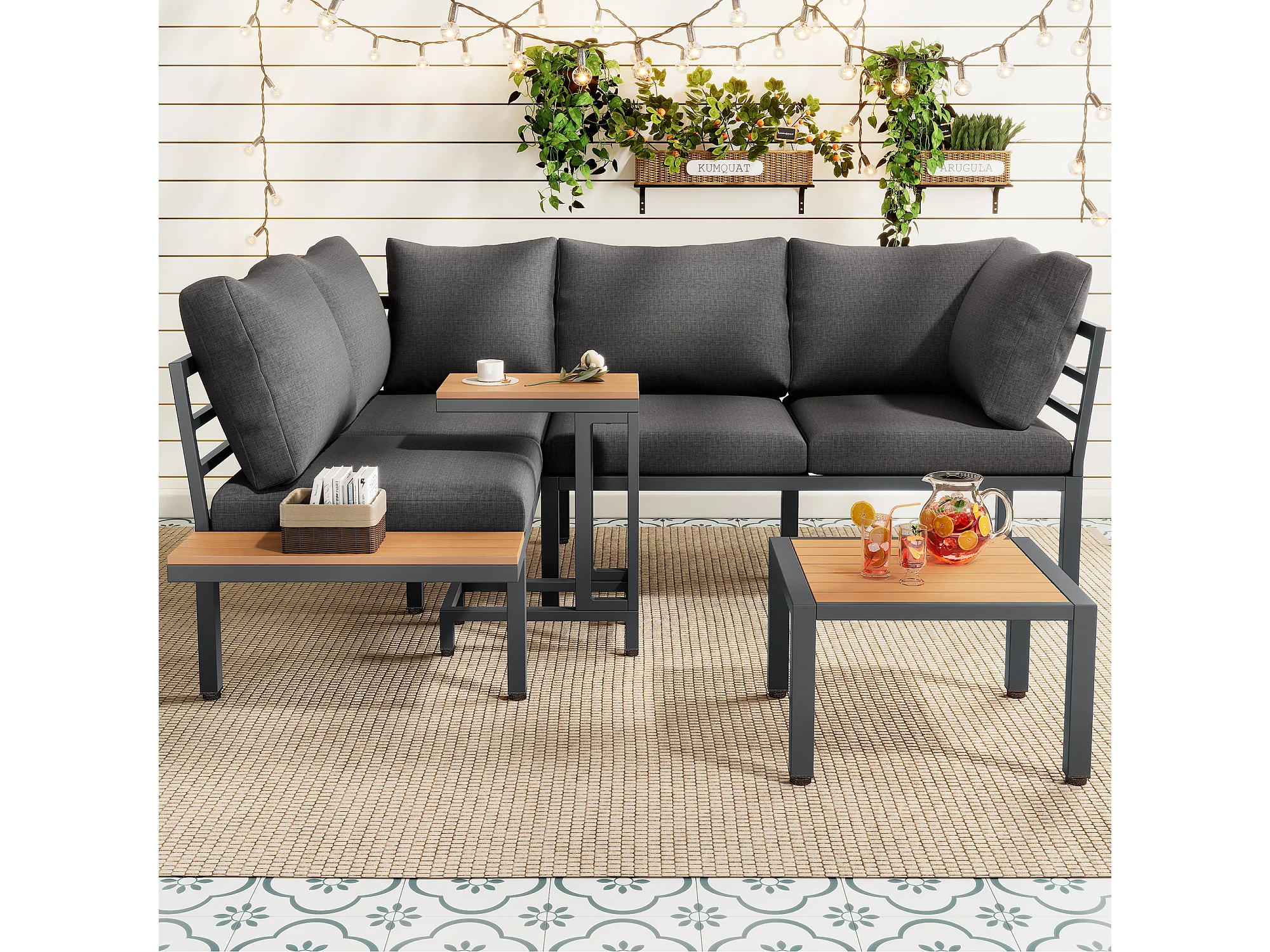 Set di mobili da giardino, divano + tavolino + tavolino, piano in legno plastico, grigio + nero