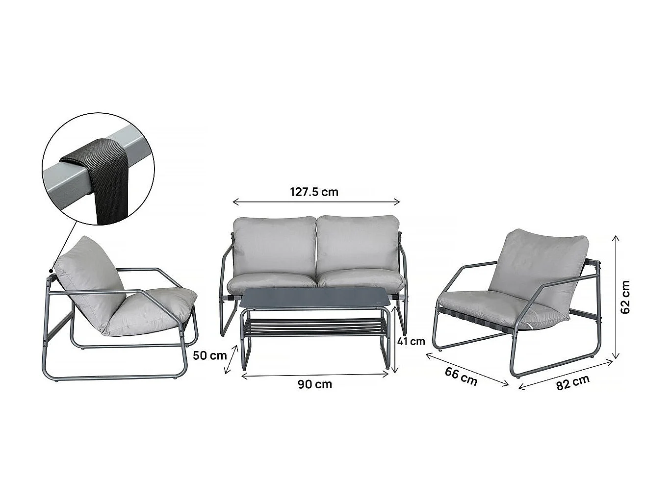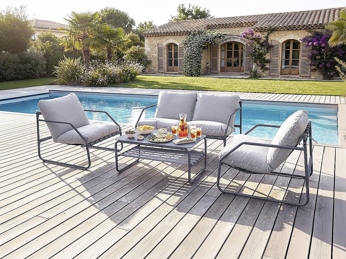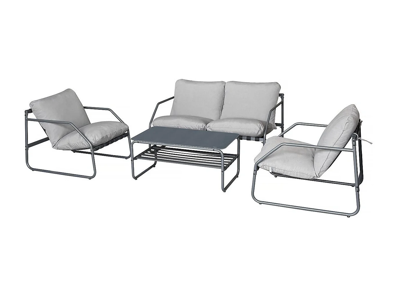 Salotto da giardino 4 posti "Sora" in metallo grigio con cuscini spessi e tavolino in vetro