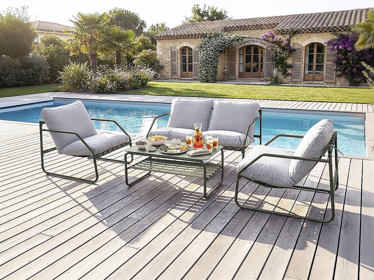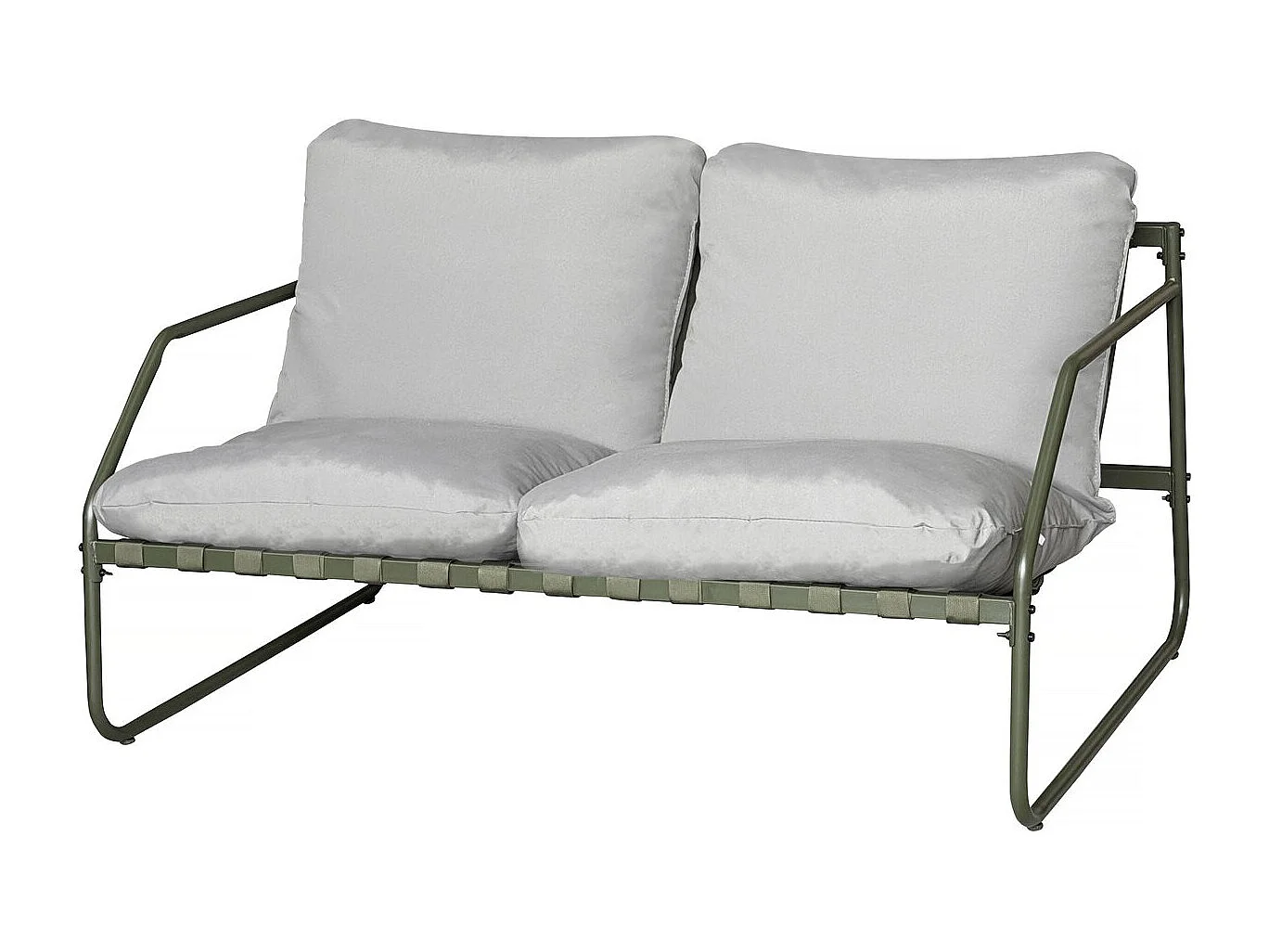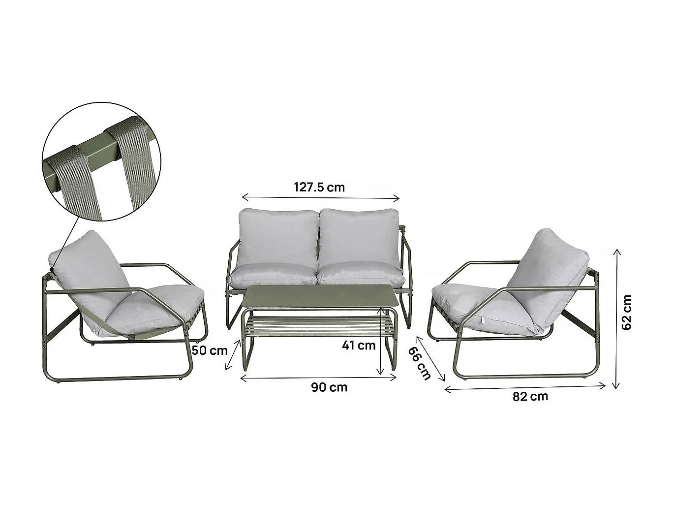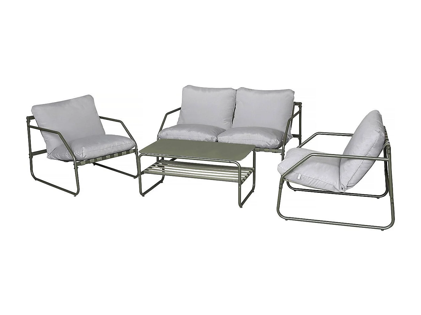 Salotto da giardino in metallo verde "Sora" per 4 persone con cuscini in poliestere e tavolino in vetro