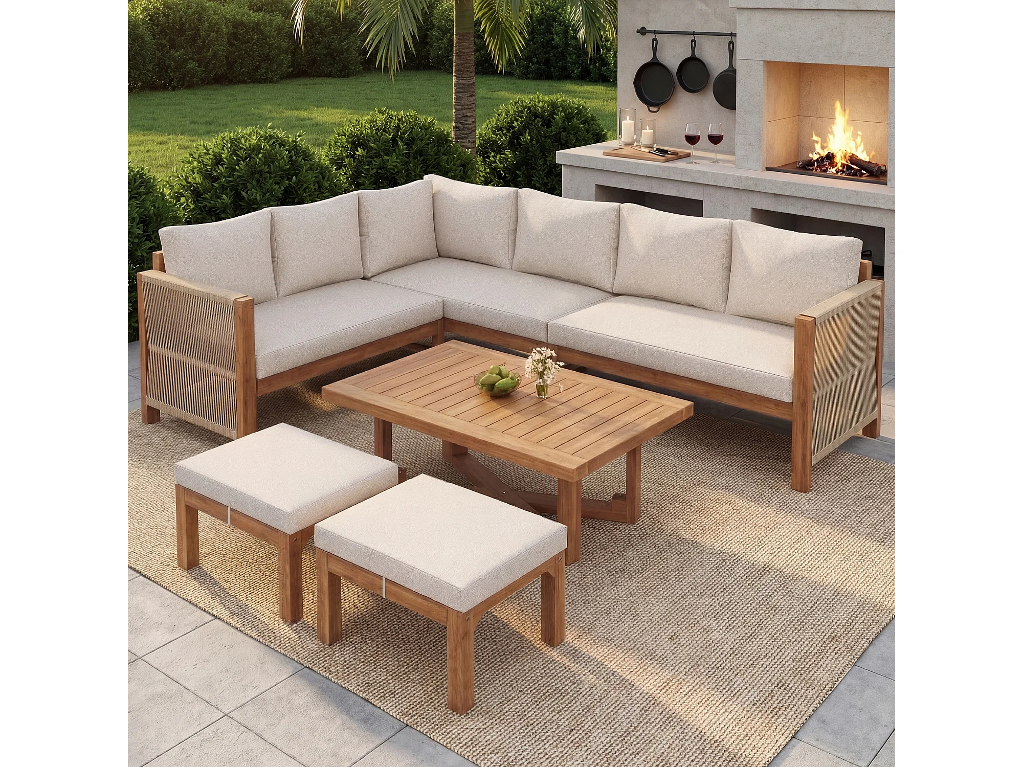 Set di mobili da giardino modulare a 6 posti - con divano + tavolo + cuscini + 2 sgabelli - legno di acacia - beige
