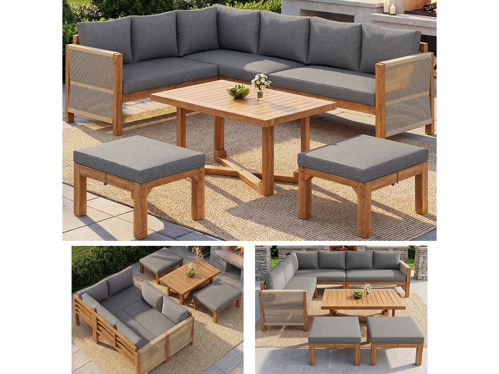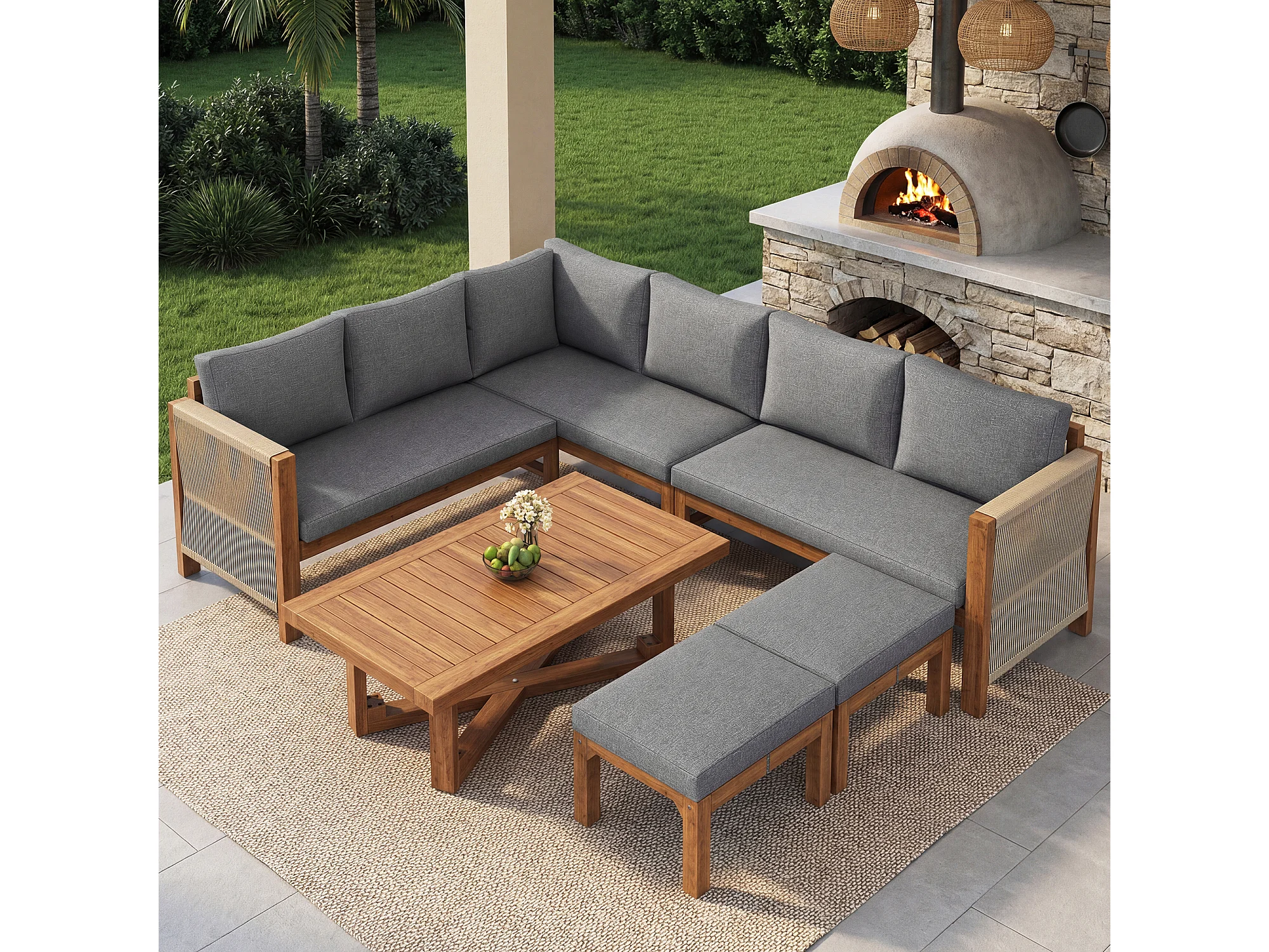 Set di mobili da giardino modulare a 6 posti - con divano + tavolo + cuscini + 2 sgabelli - legno di acacia - grigio