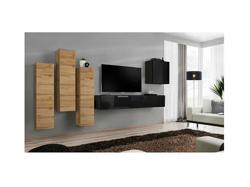 Set di mobili da soggiorno design collezione SWITCH III. Colori quercia wotan e nero lucido.