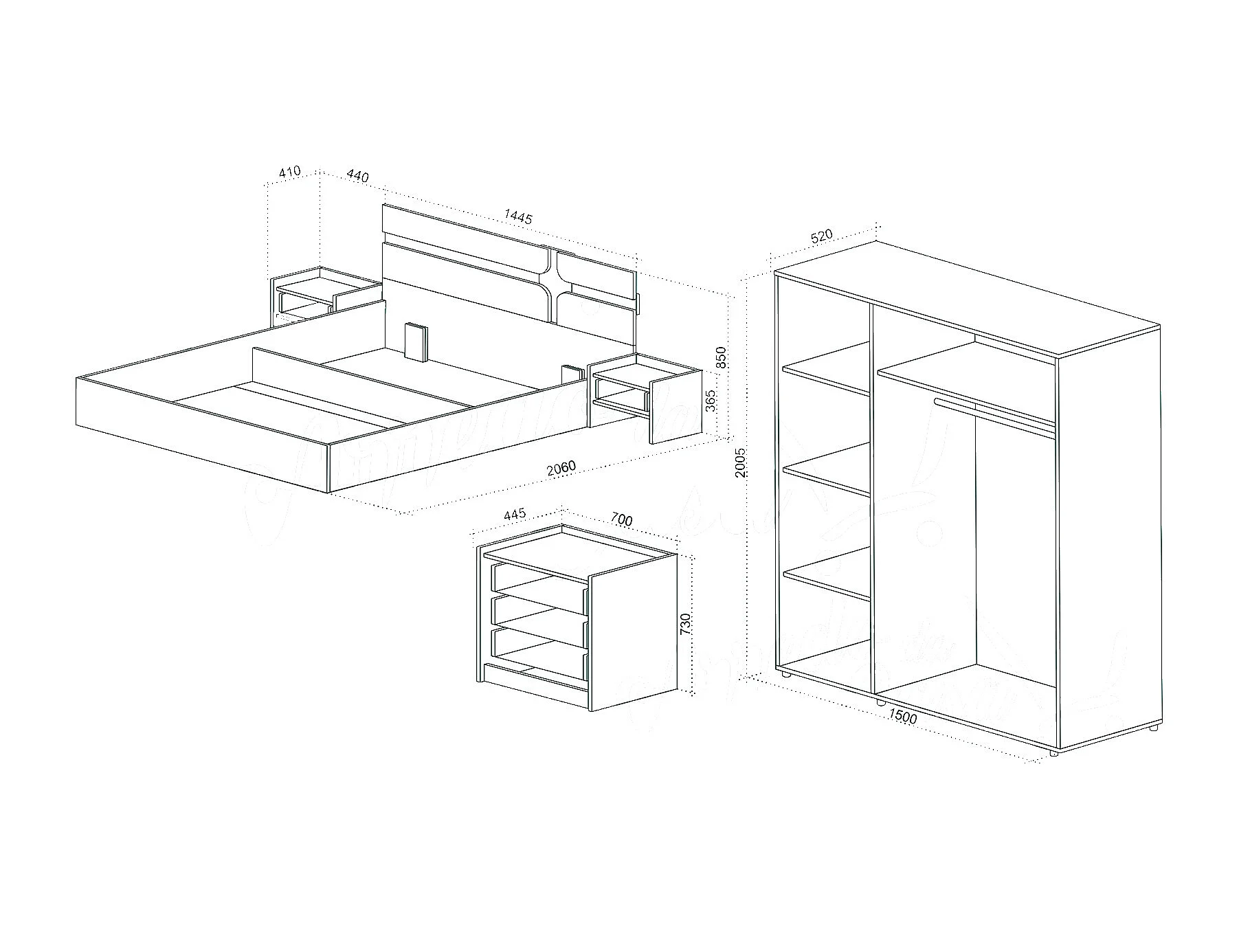 Camera da letto collezione MORGANE: armadio 250 cm, letto con applique 140x200, cassettiera, comodini, rovere dorato e nero.