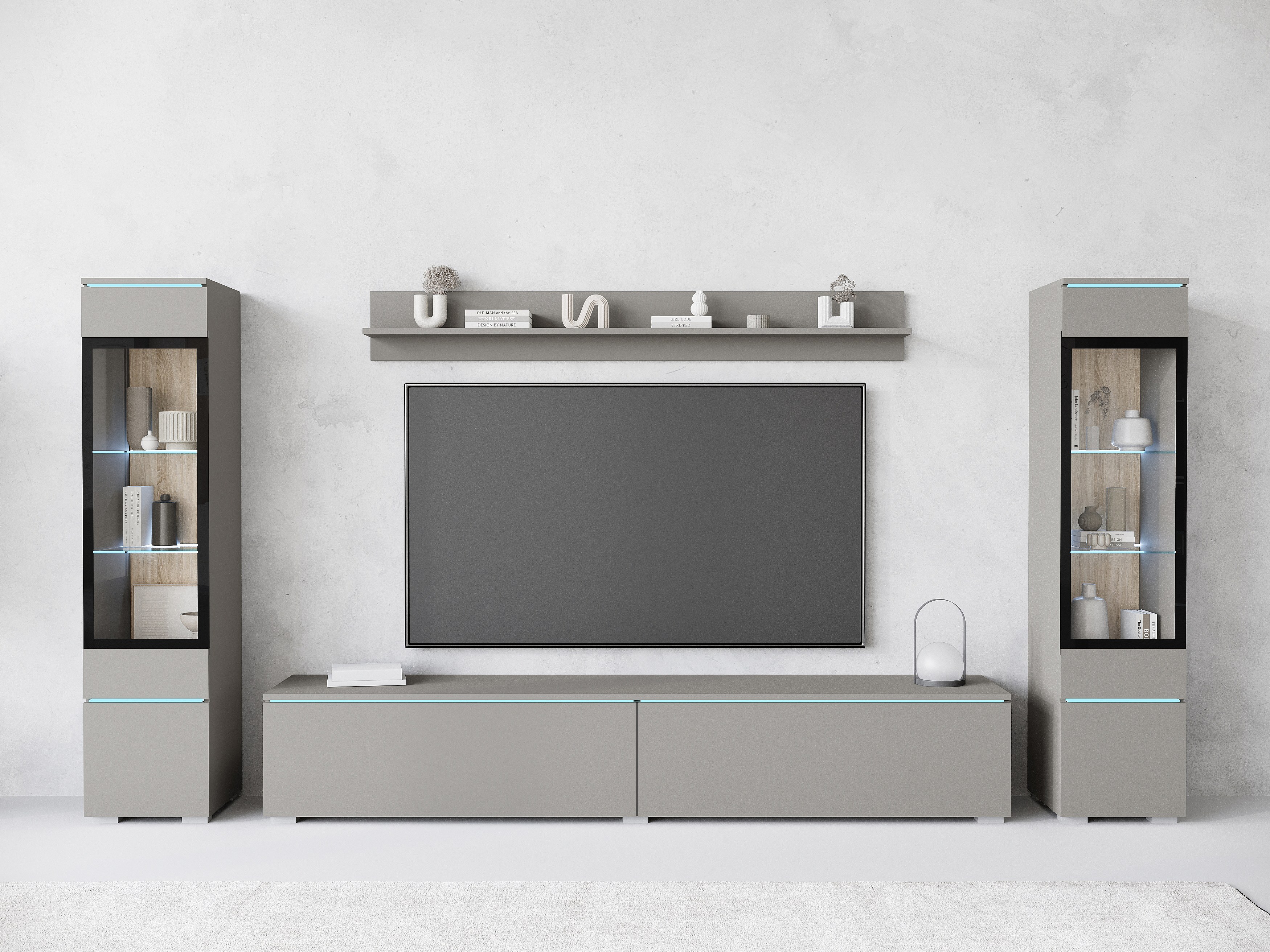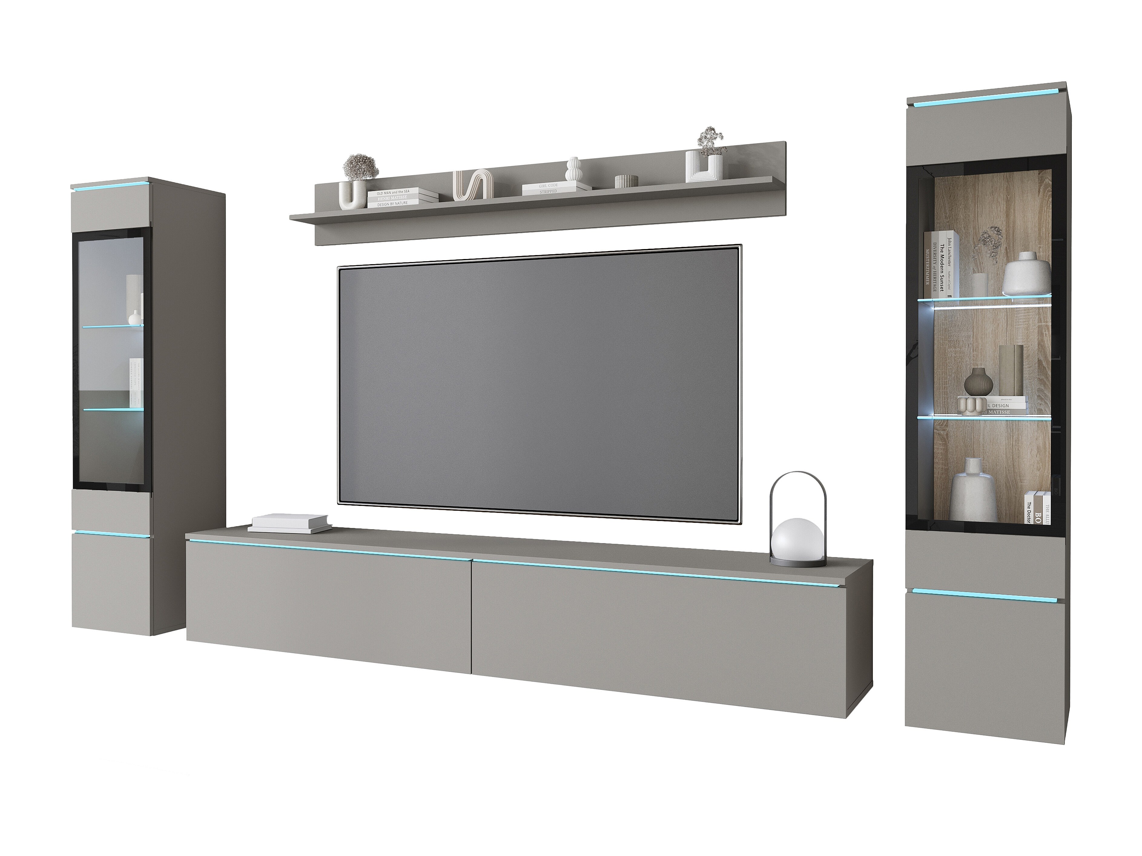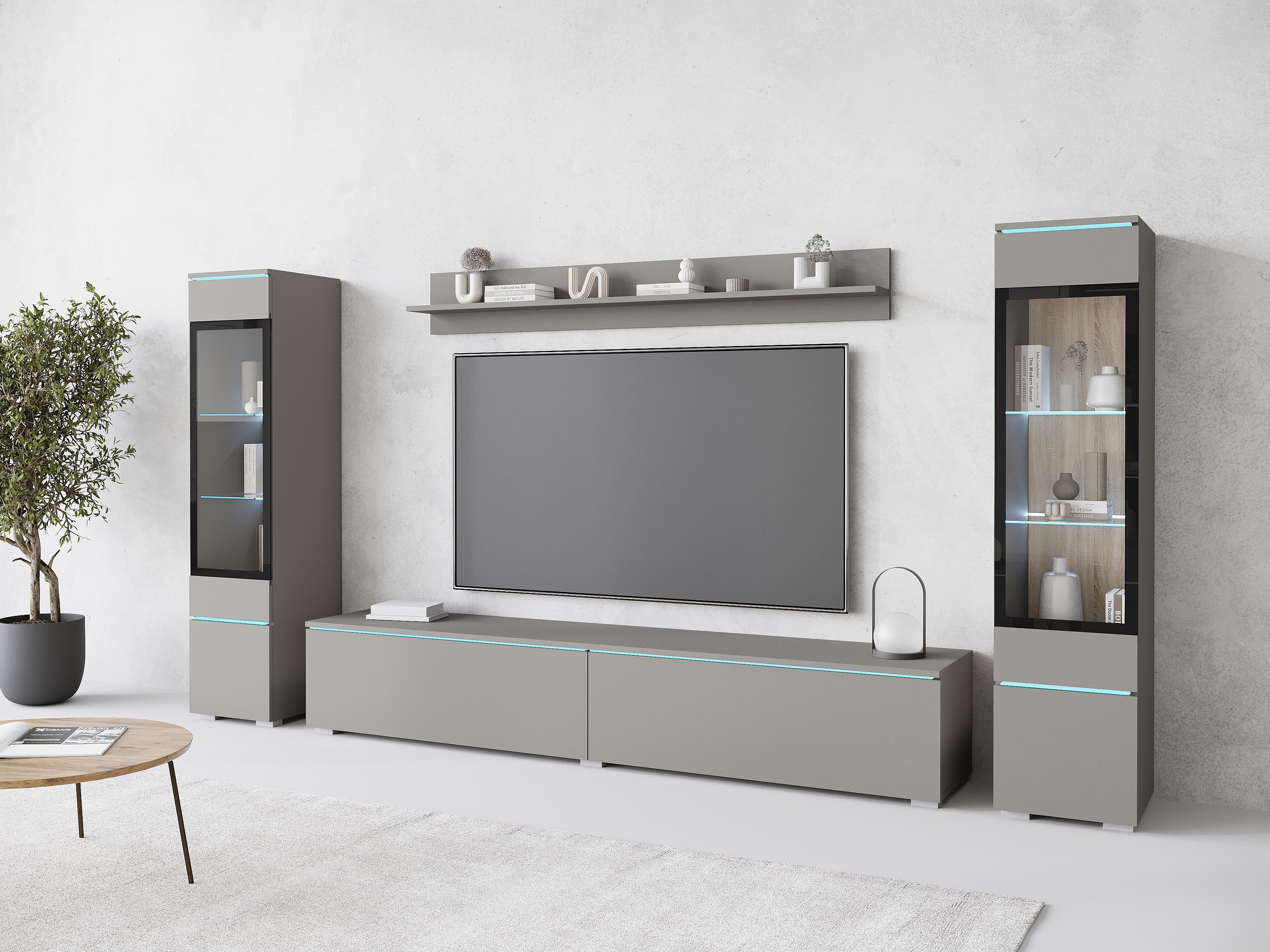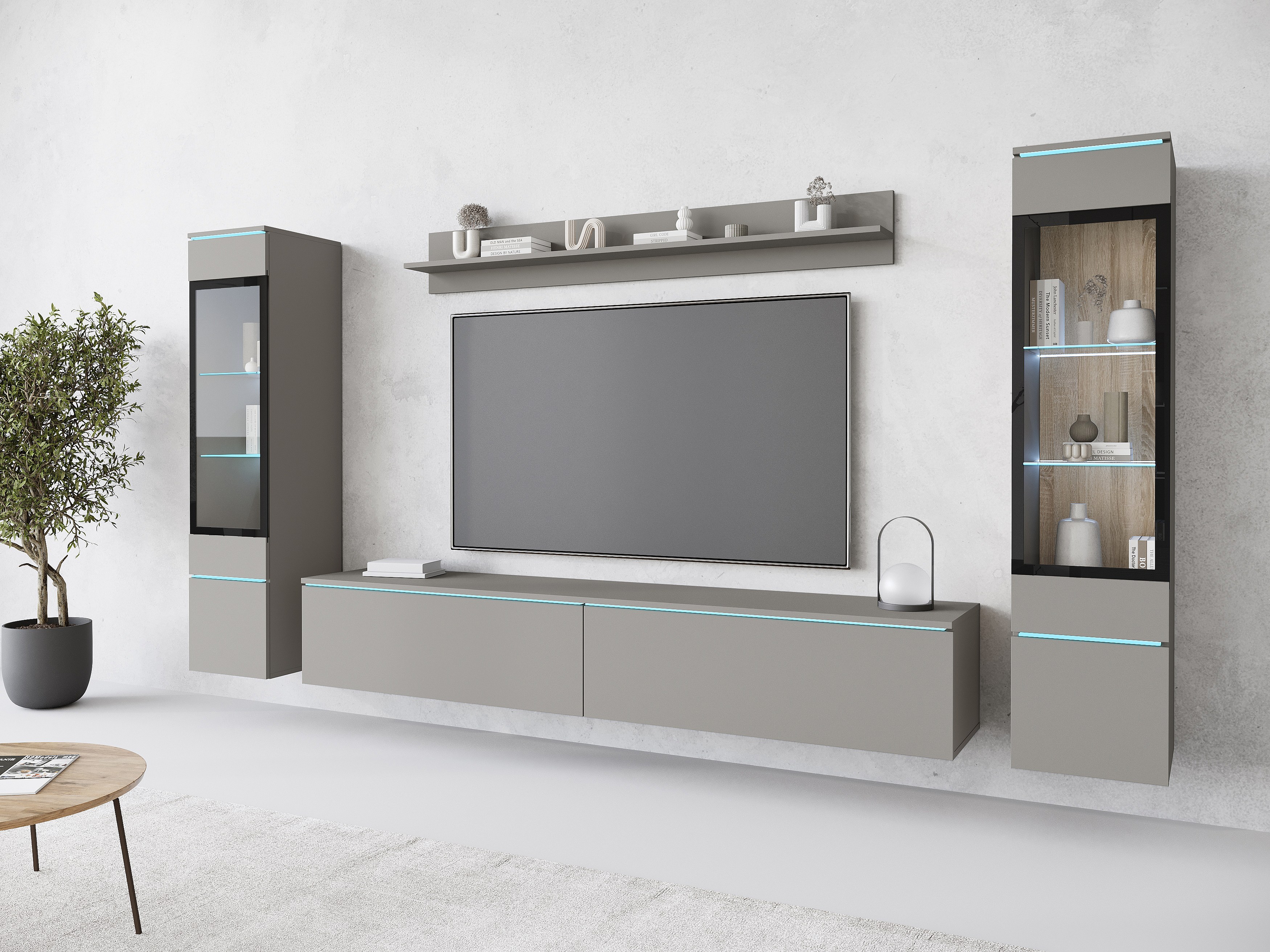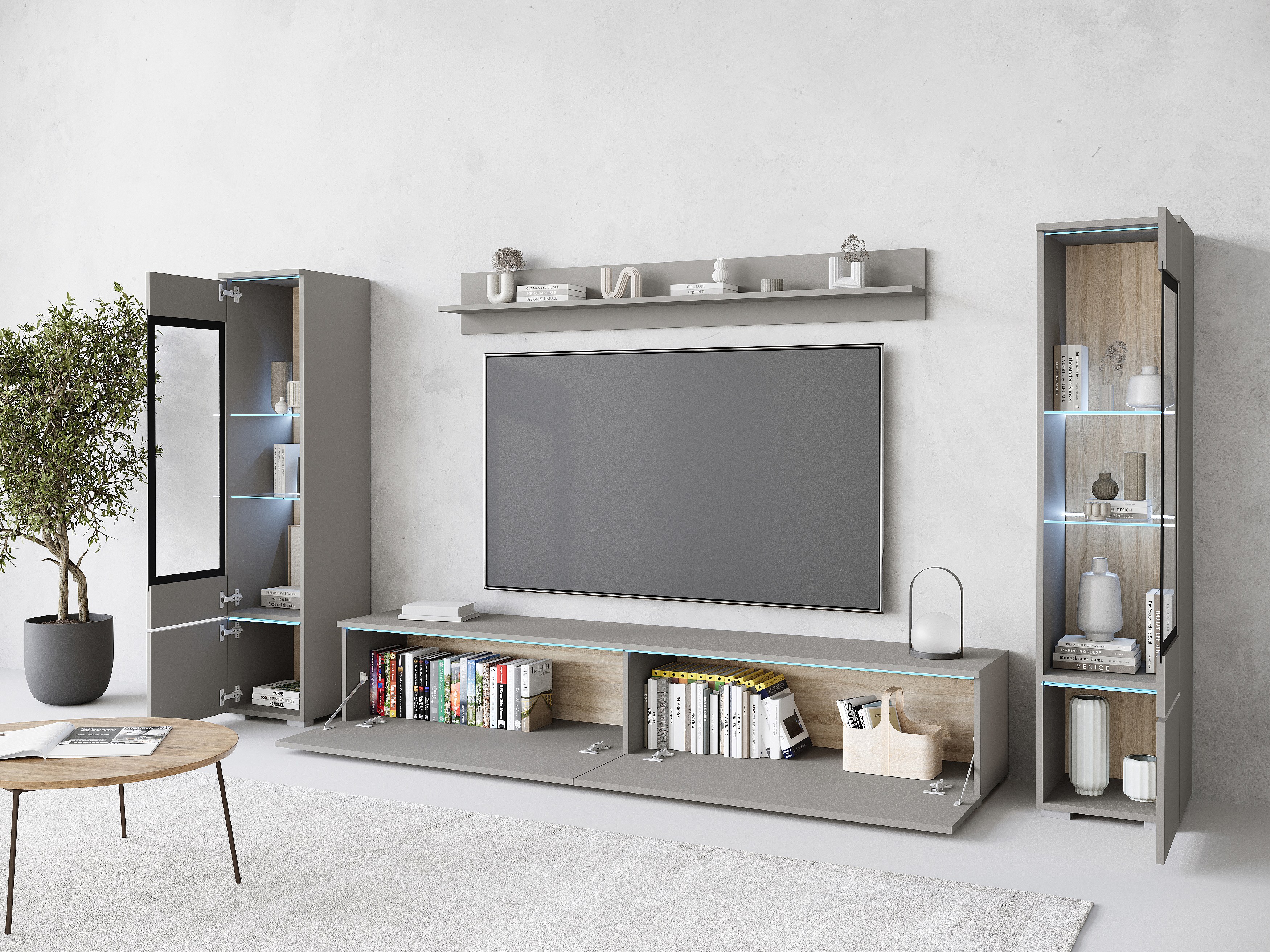 Set di mobili per soggiorno con LED 4 elementi – mobile TV 180 cm, 2 vetrine i mensola, composizione modulare da terra o sospesa, grigio Pallad