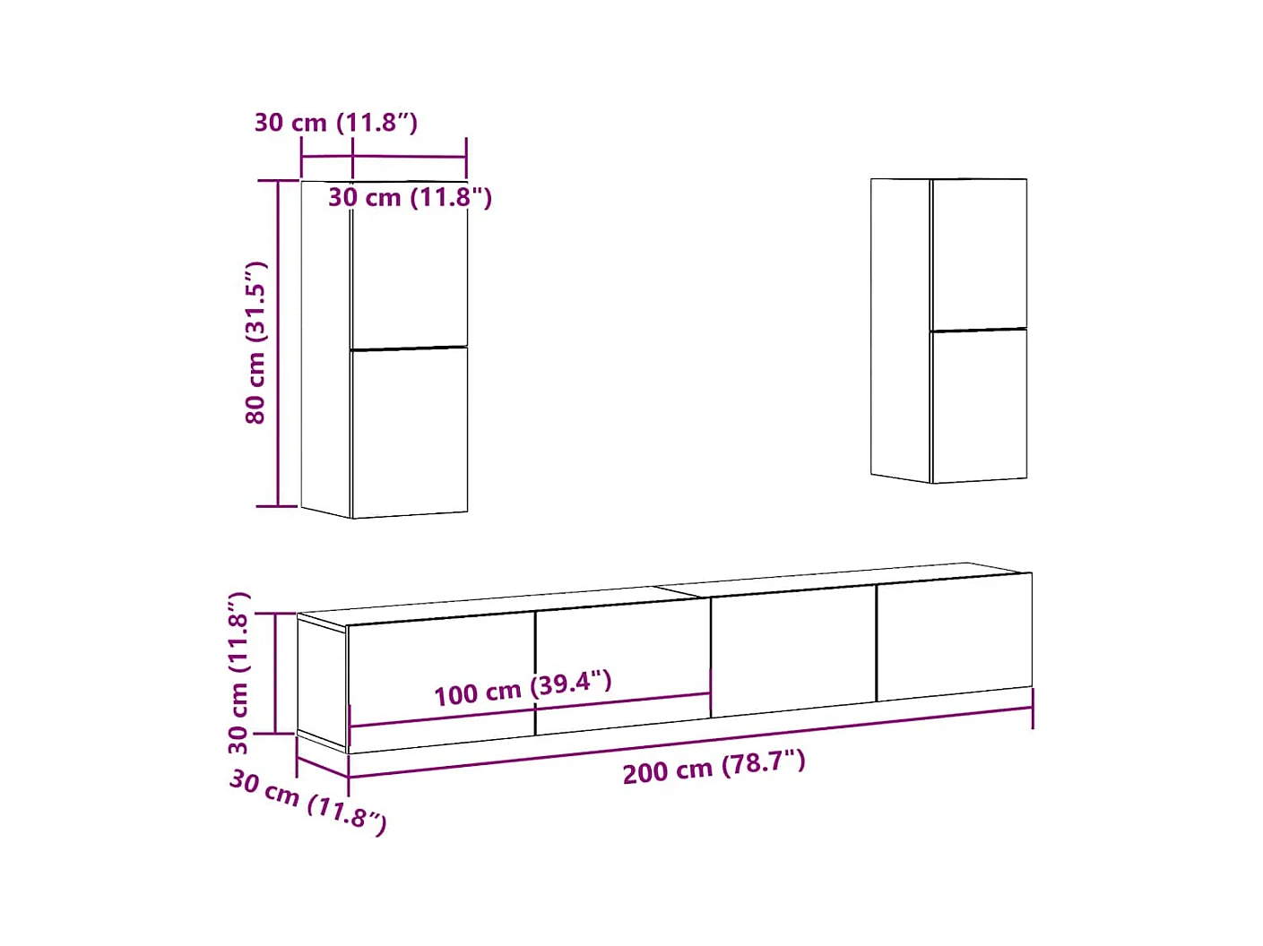 Set di mobili porta TV da 4 pezzi in rovere affumicato, legno ingegnerizzato