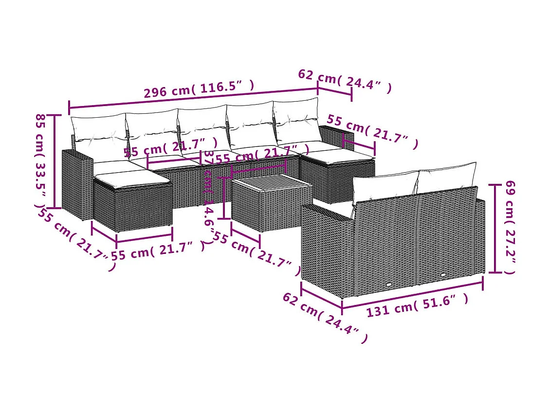 Mobili da giardino 10 pezzi con cuscini in resina intrecciata nera