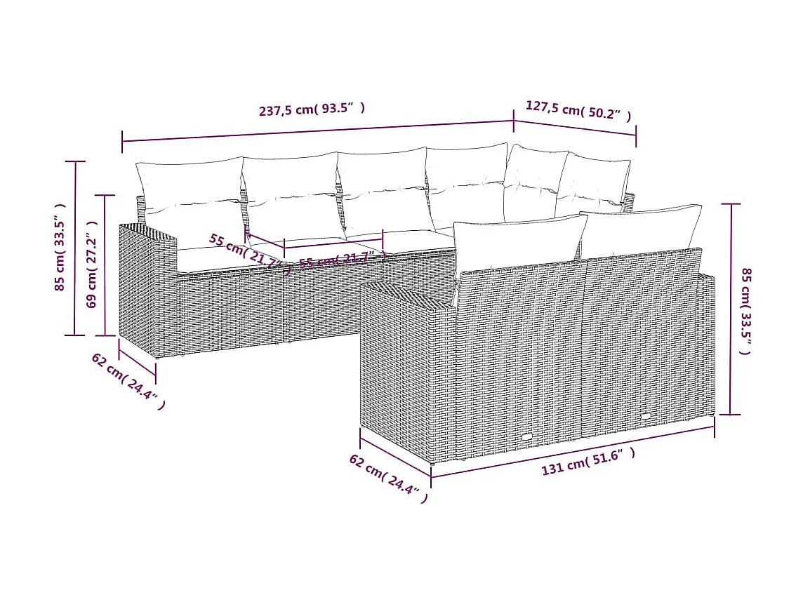 Mobile da giardino con cuscini 7 pz in resina intrecciata marrone