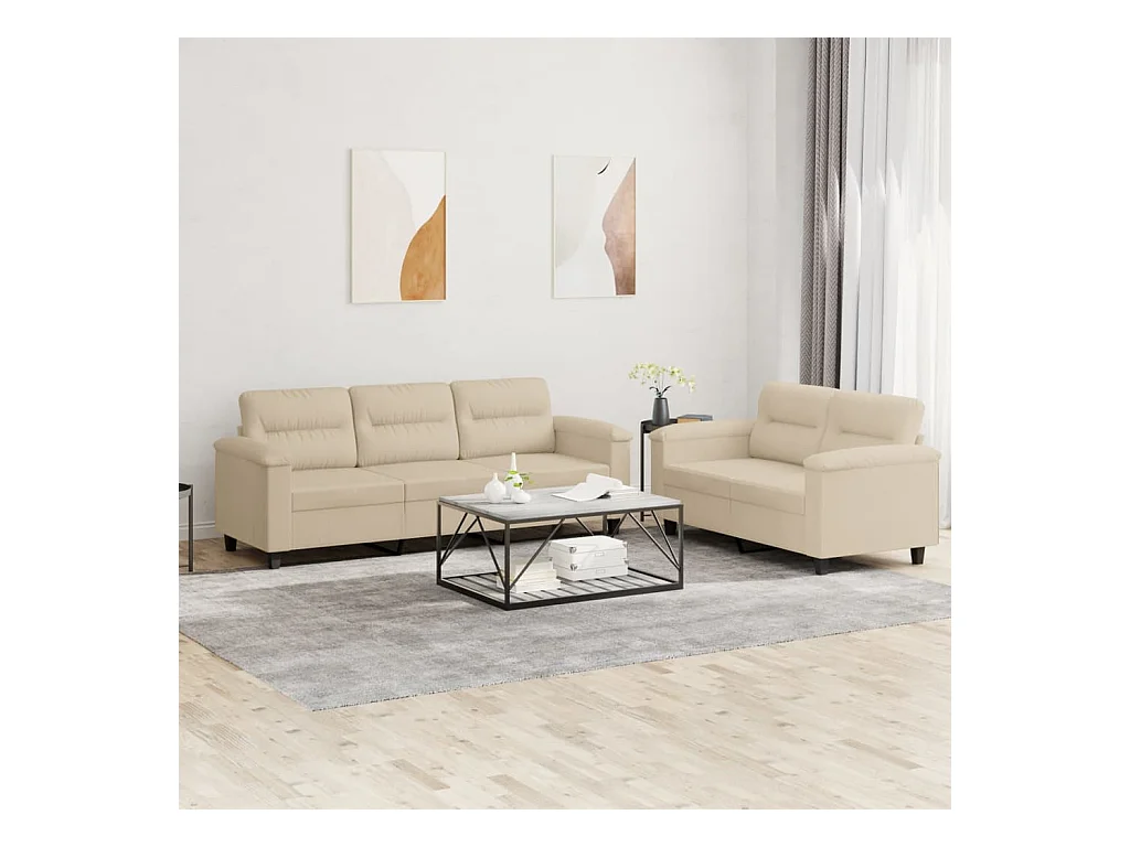 Set divano 2 pezzi con cuscini in tessuto microfibra color crema