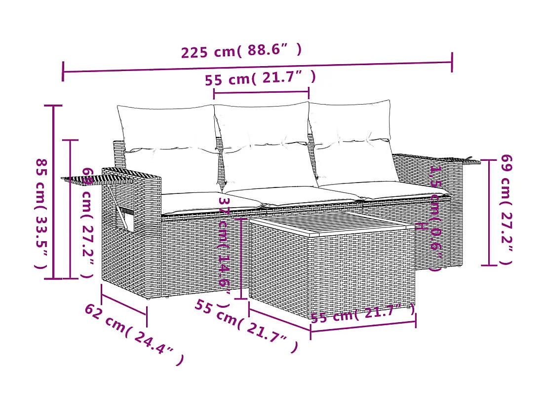 Mobile da giardino con cuscini 4 pz in resina intrecciata beige