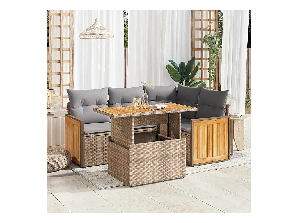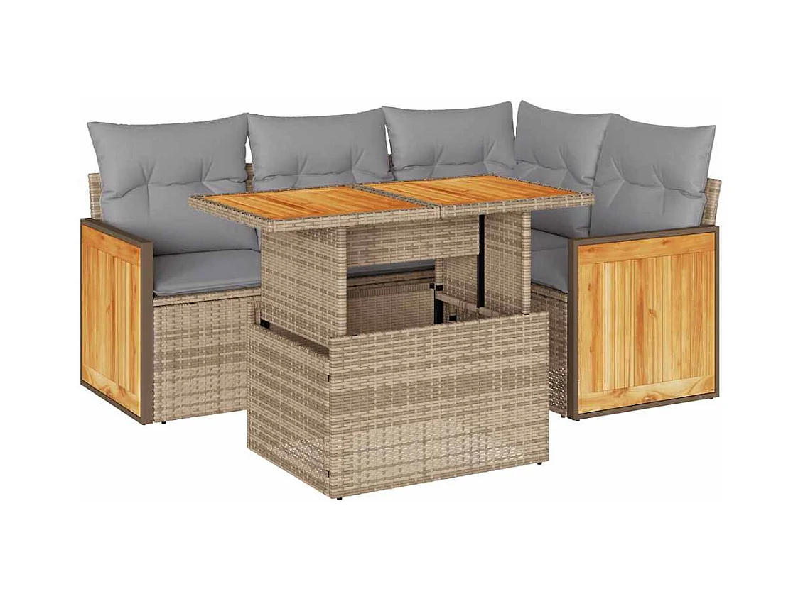 Set Divano da Giardino 5 pz con Cuscini Beige Polyrattan Acacia