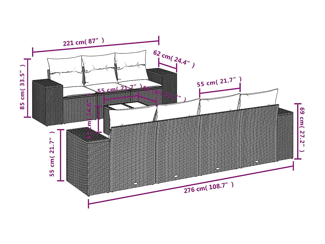 Mobile da giardino con cuscini 7 pezzi in resina intrecciata grigia