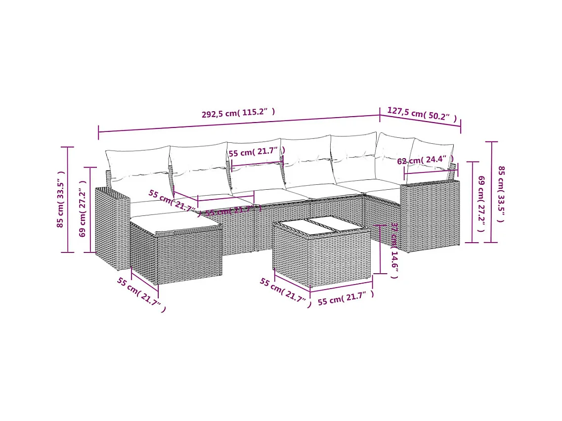 Mobile da giardino con cuscini 7 pezzi in resina intrecciata grigia