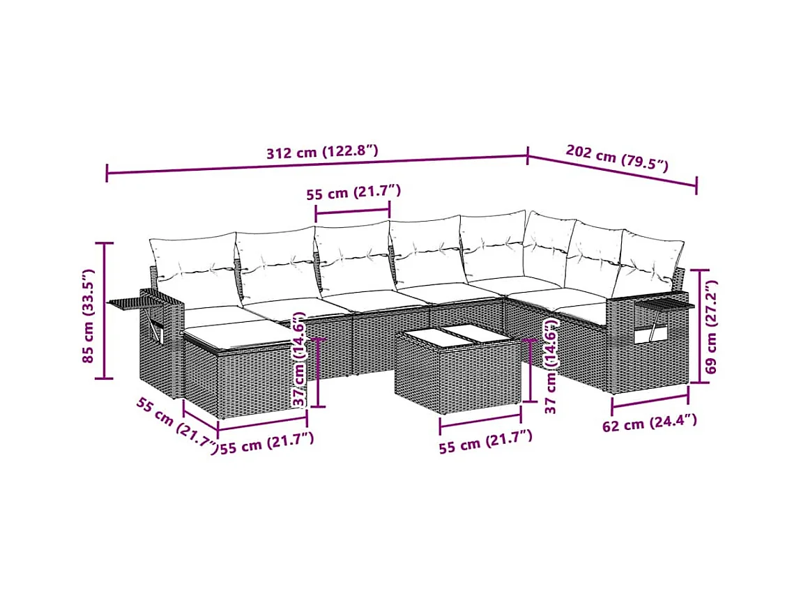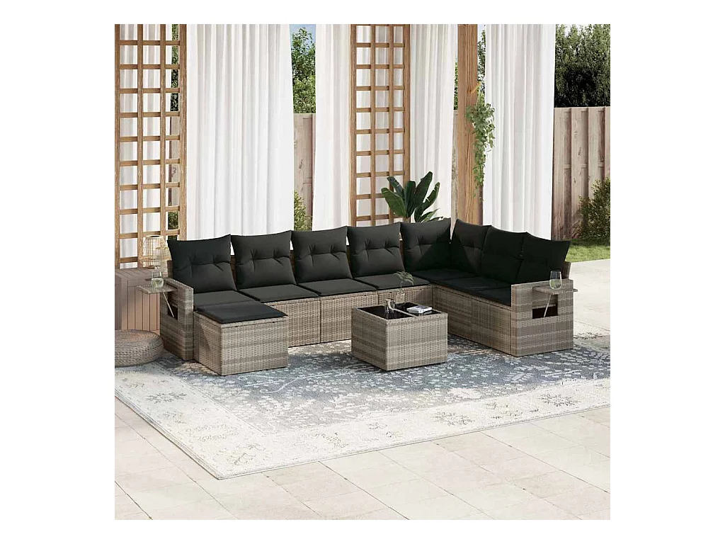 Set Divano da Giardino 9pz con Cuscini Grigio Chiaro Polyrattan
