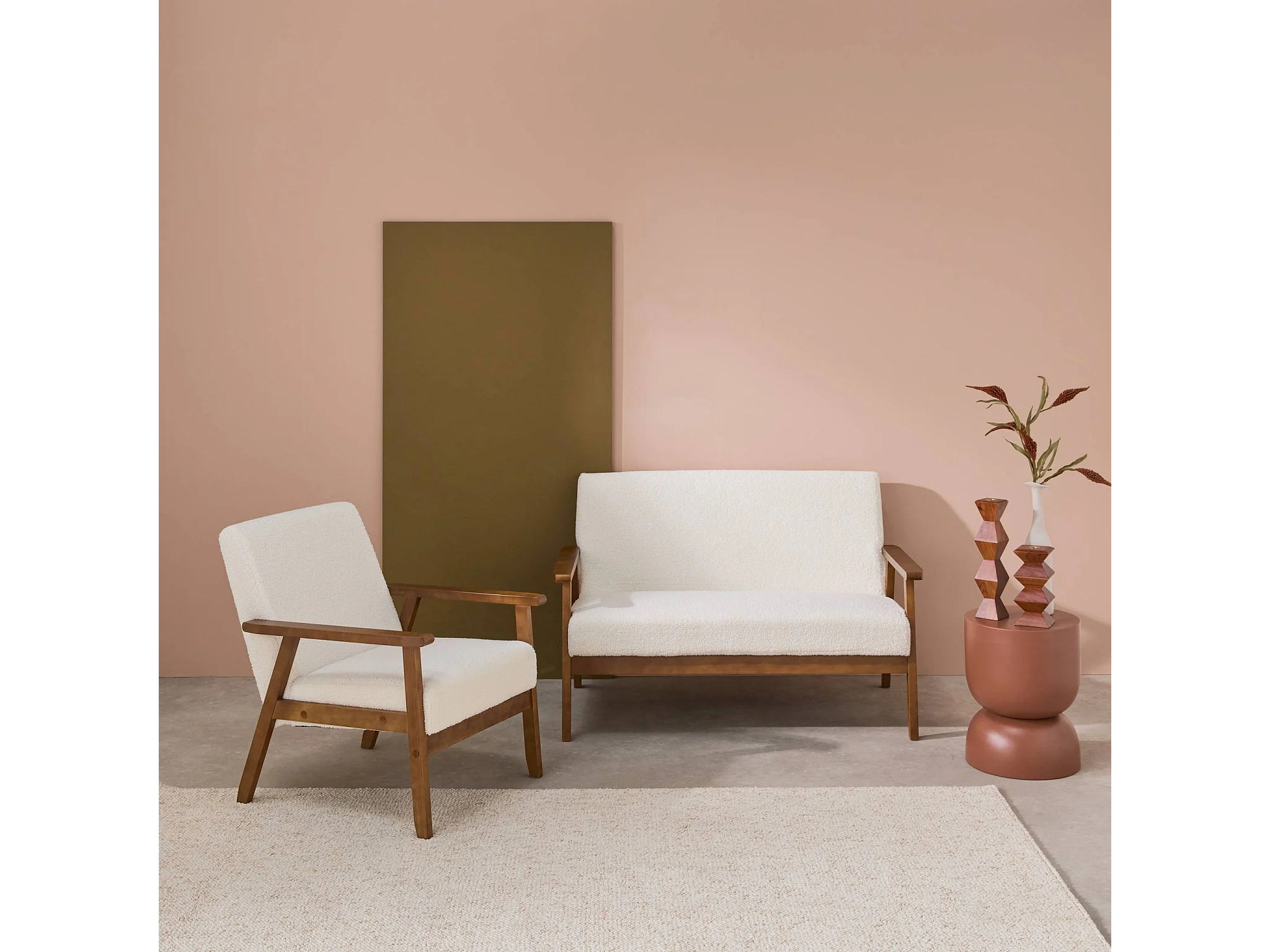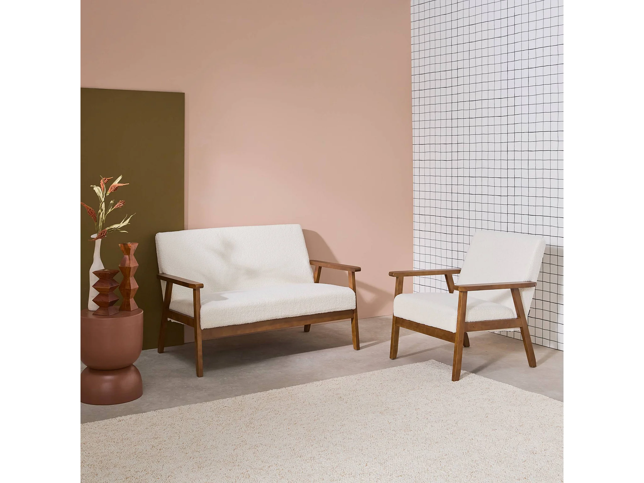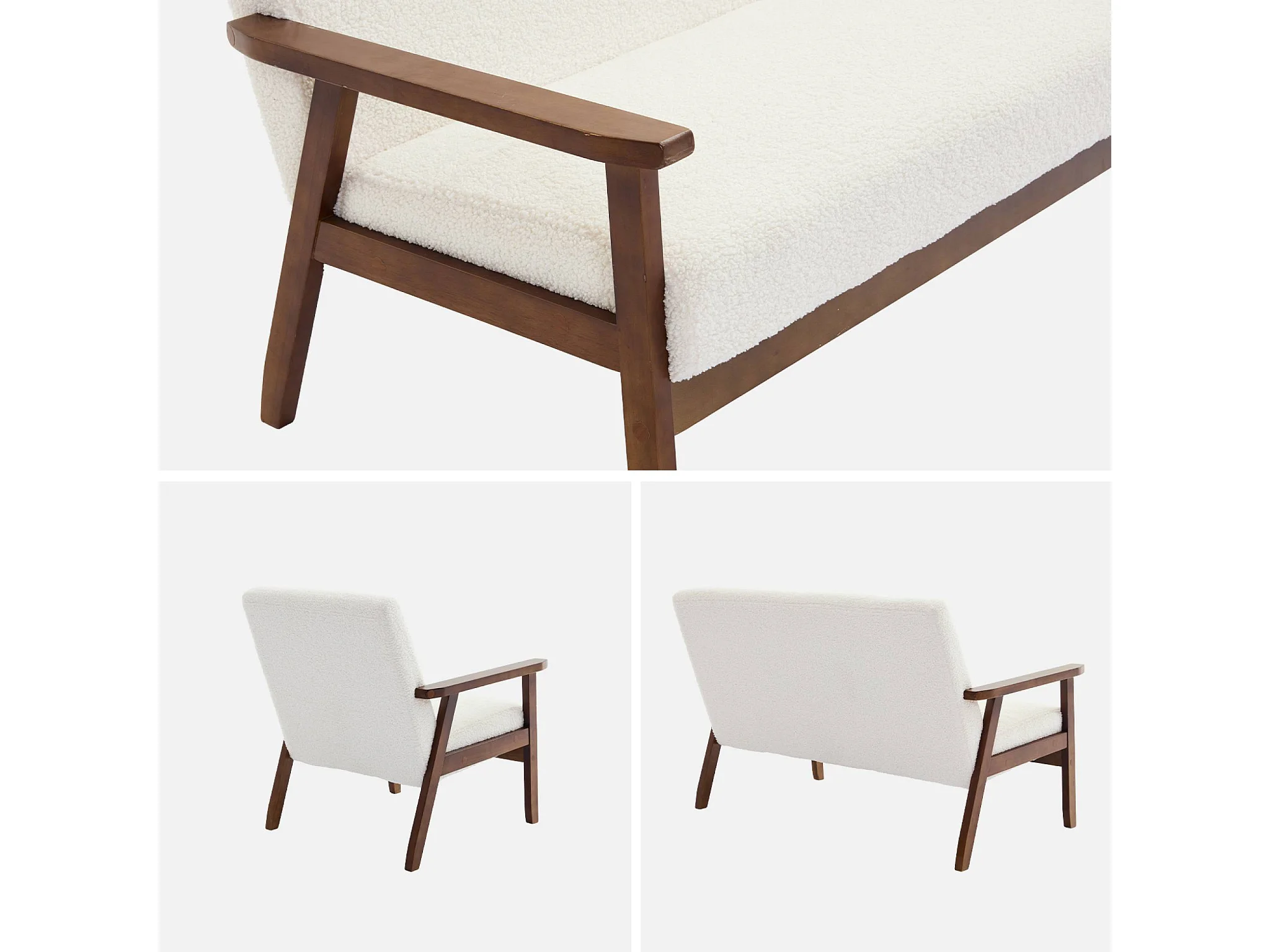 Set panca e poltrona in tessuto bouclé, 3 posti, bouclé bianco