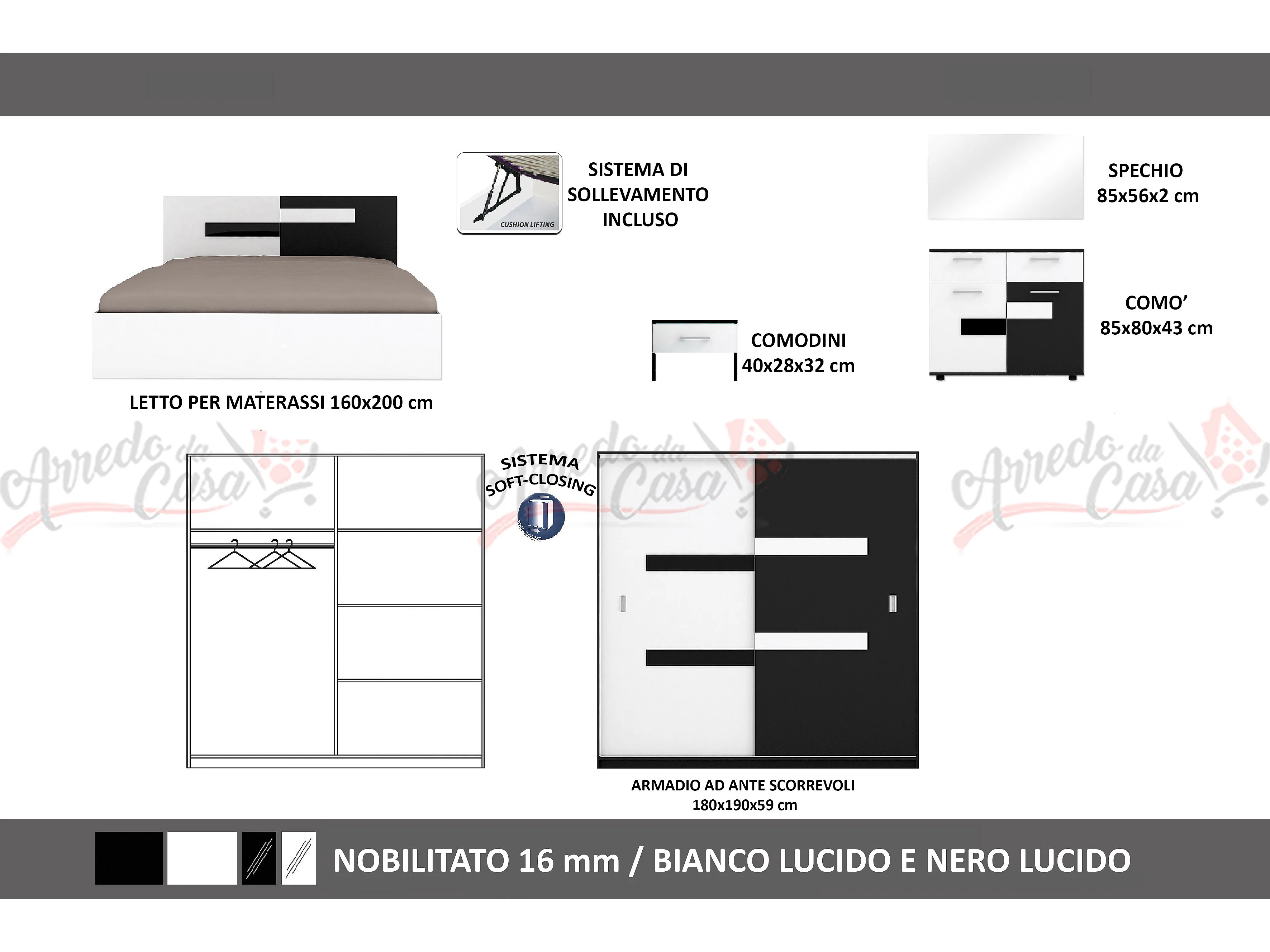 Camera da letto completa moderna 160x200 cm bianco lucido e nero lucido CMG12