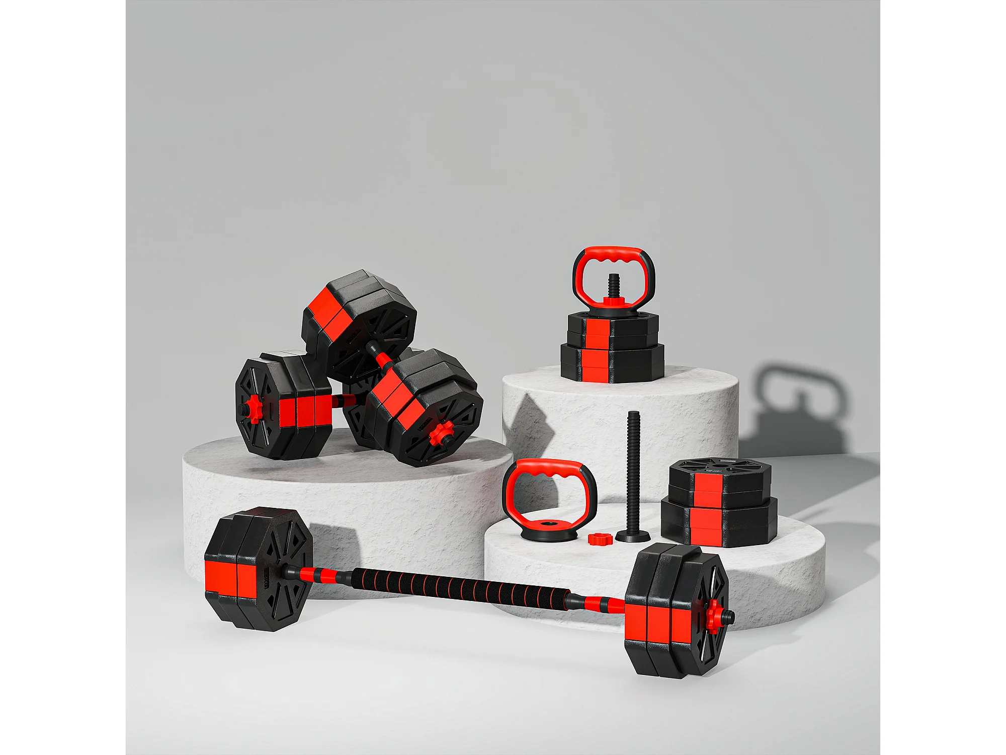 Set pesi 4 in 1 da 20kg con kettlebell manubri e bilanciere rosso
