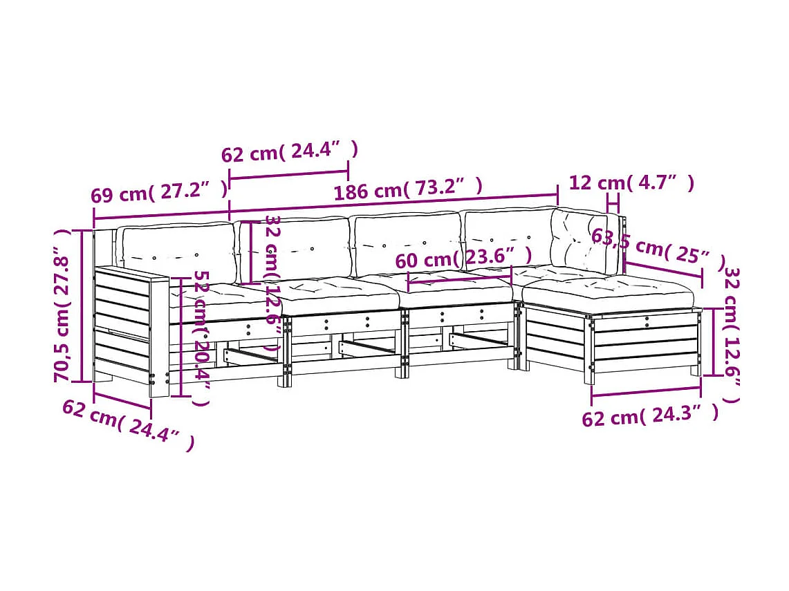 Set Salotto Giardino 5pz con Cuscini Bianco Legno Massello Pino