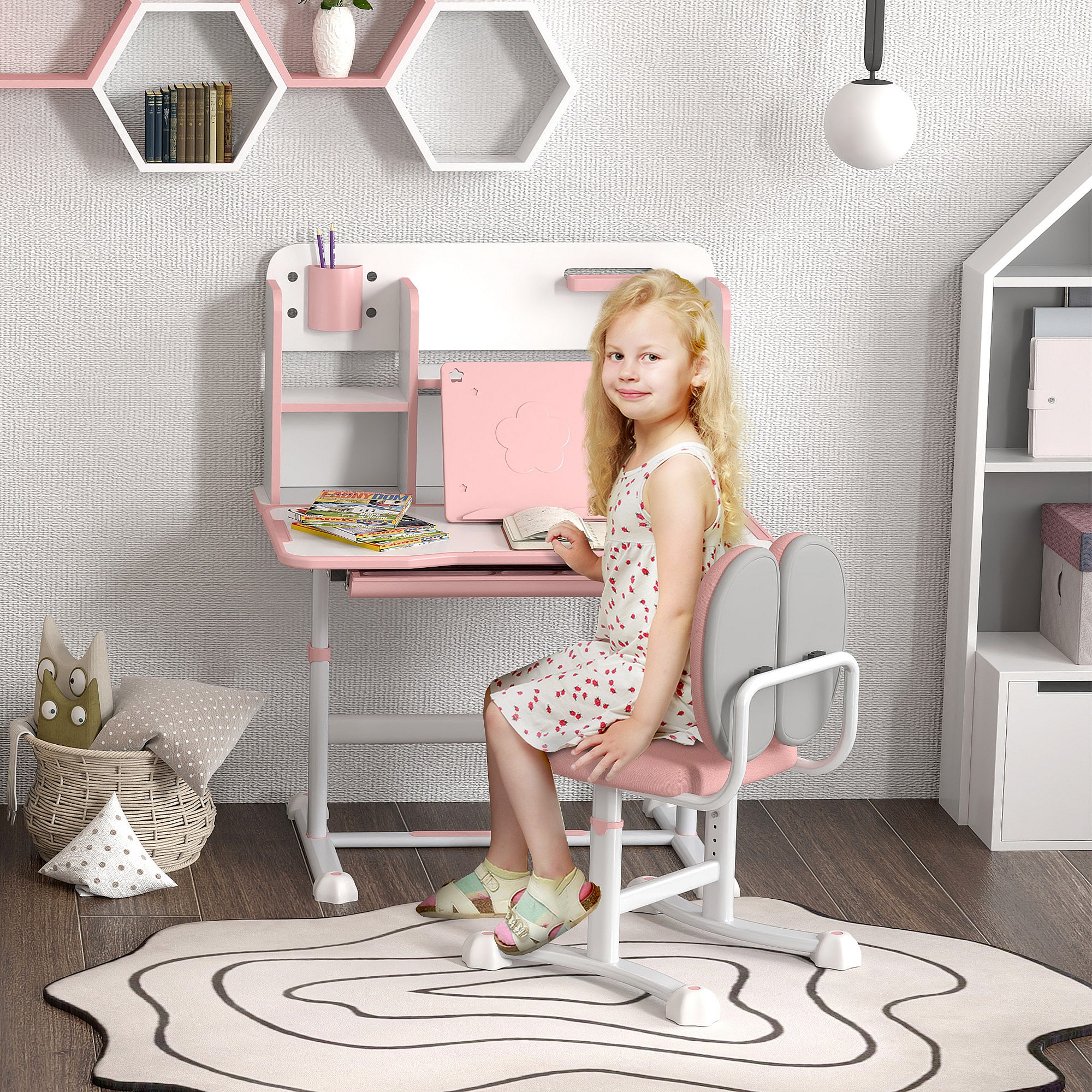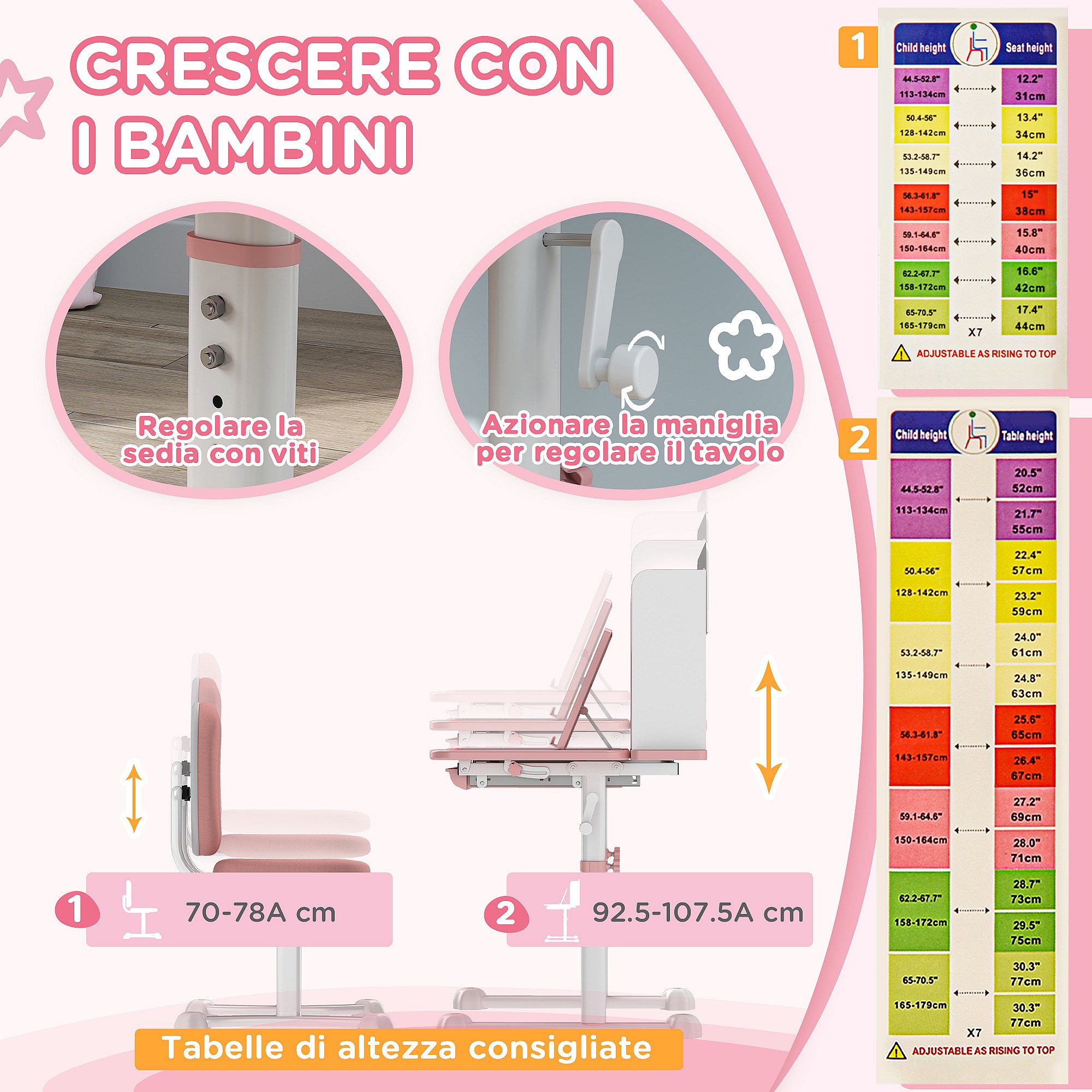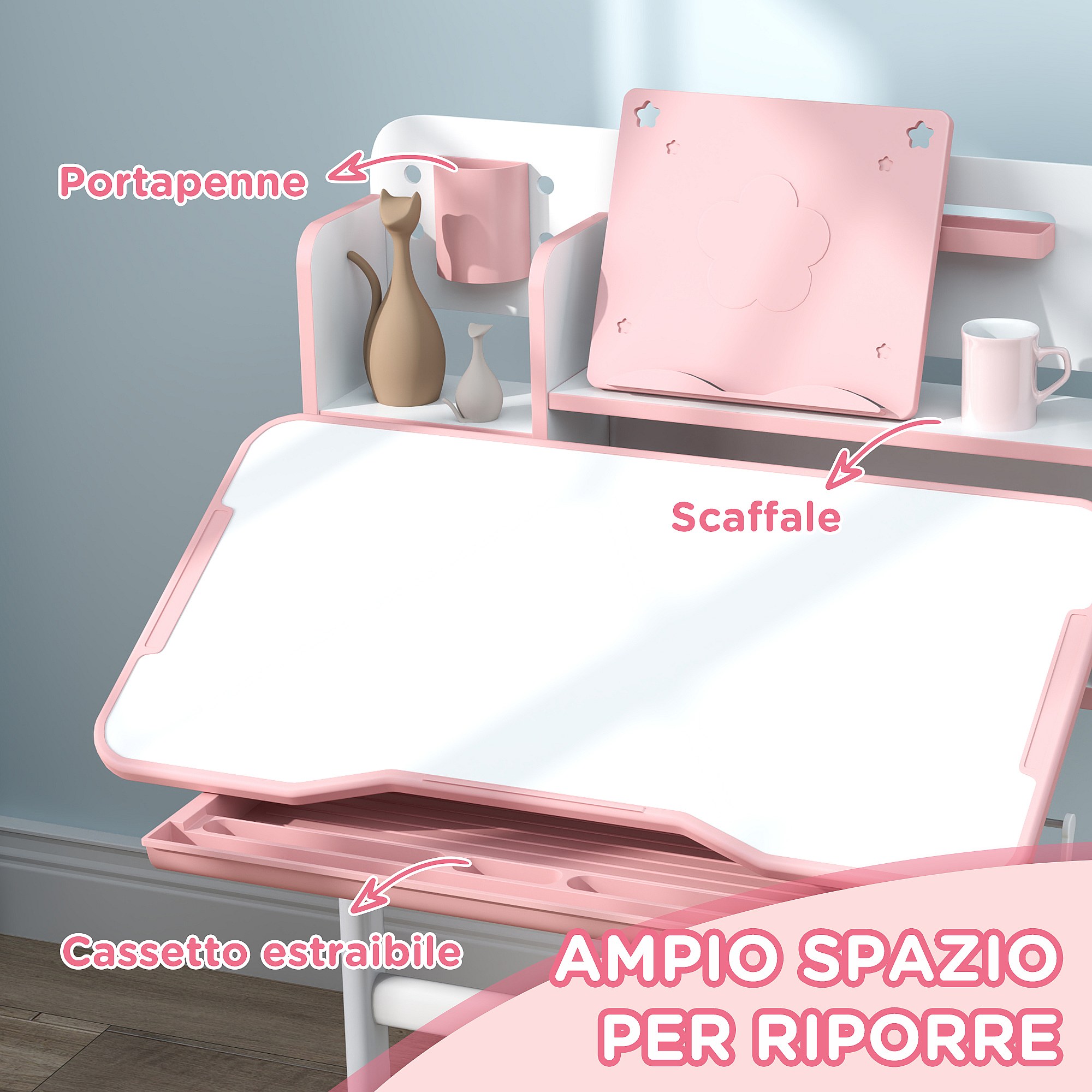 Set scrivania e sedia per bambini regolabili con scaffale rosa
