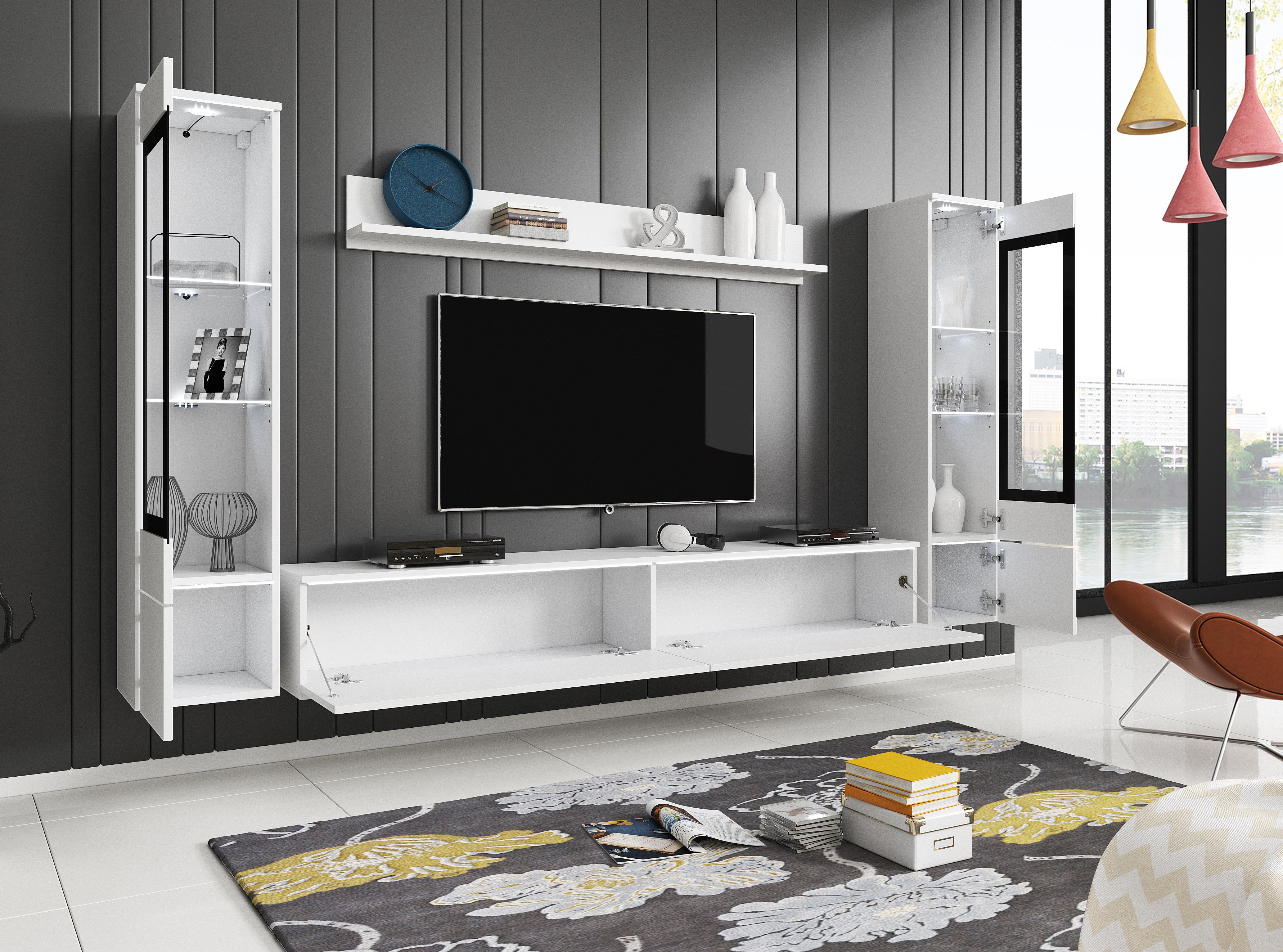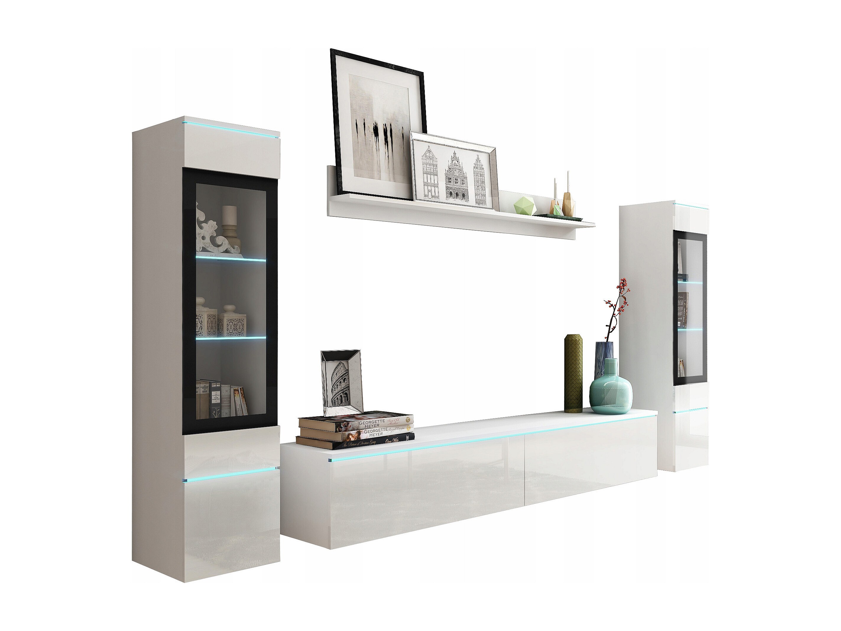 Set soggiorno con LED 4 elementi – mobile TV 180 cm, 2 vetrine e mensola, a pavimento o sospeso, corpo bianco opaco, frontali bianco lucido