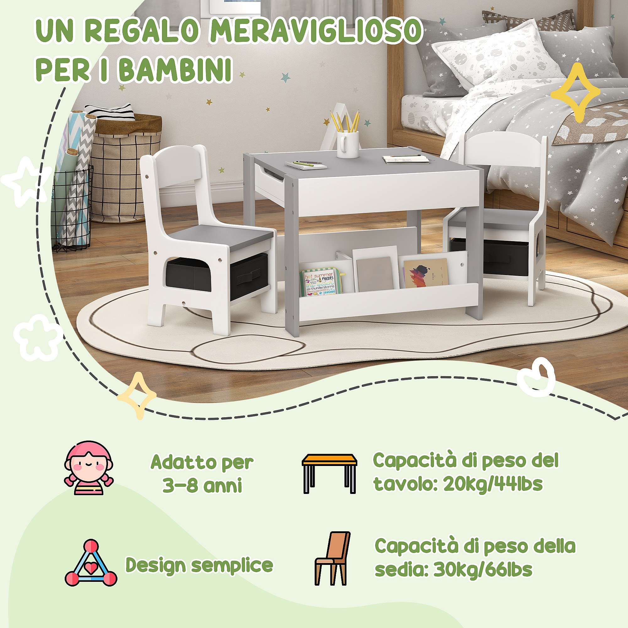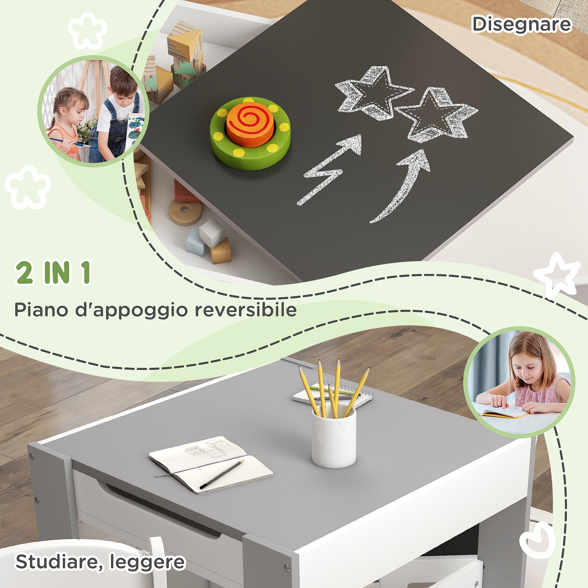 Set tavolino e 2 sedie per bambini con lavagna e contenitori grigio