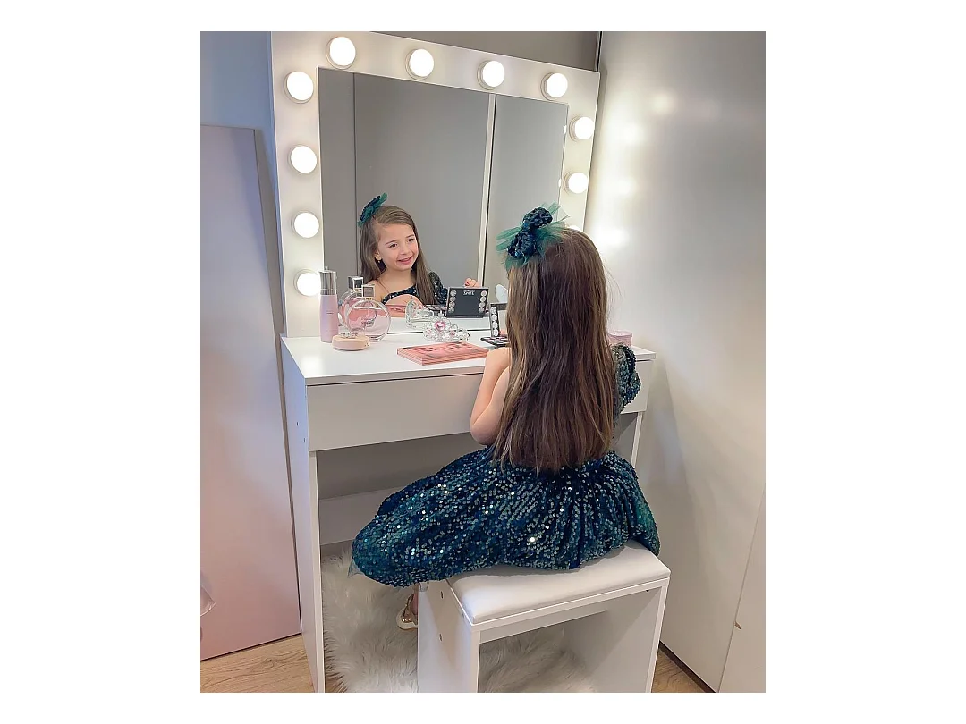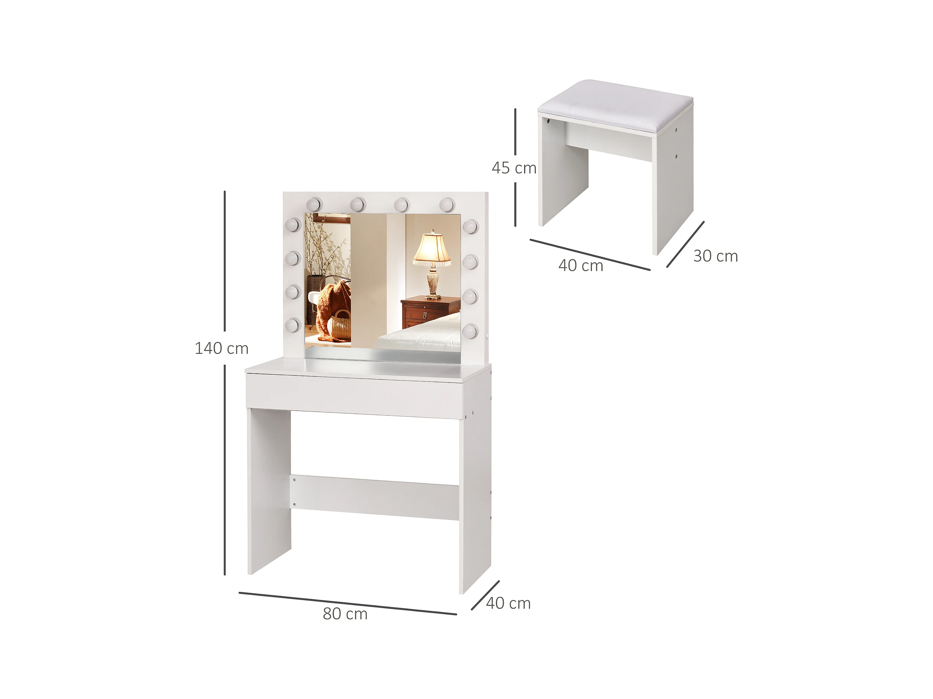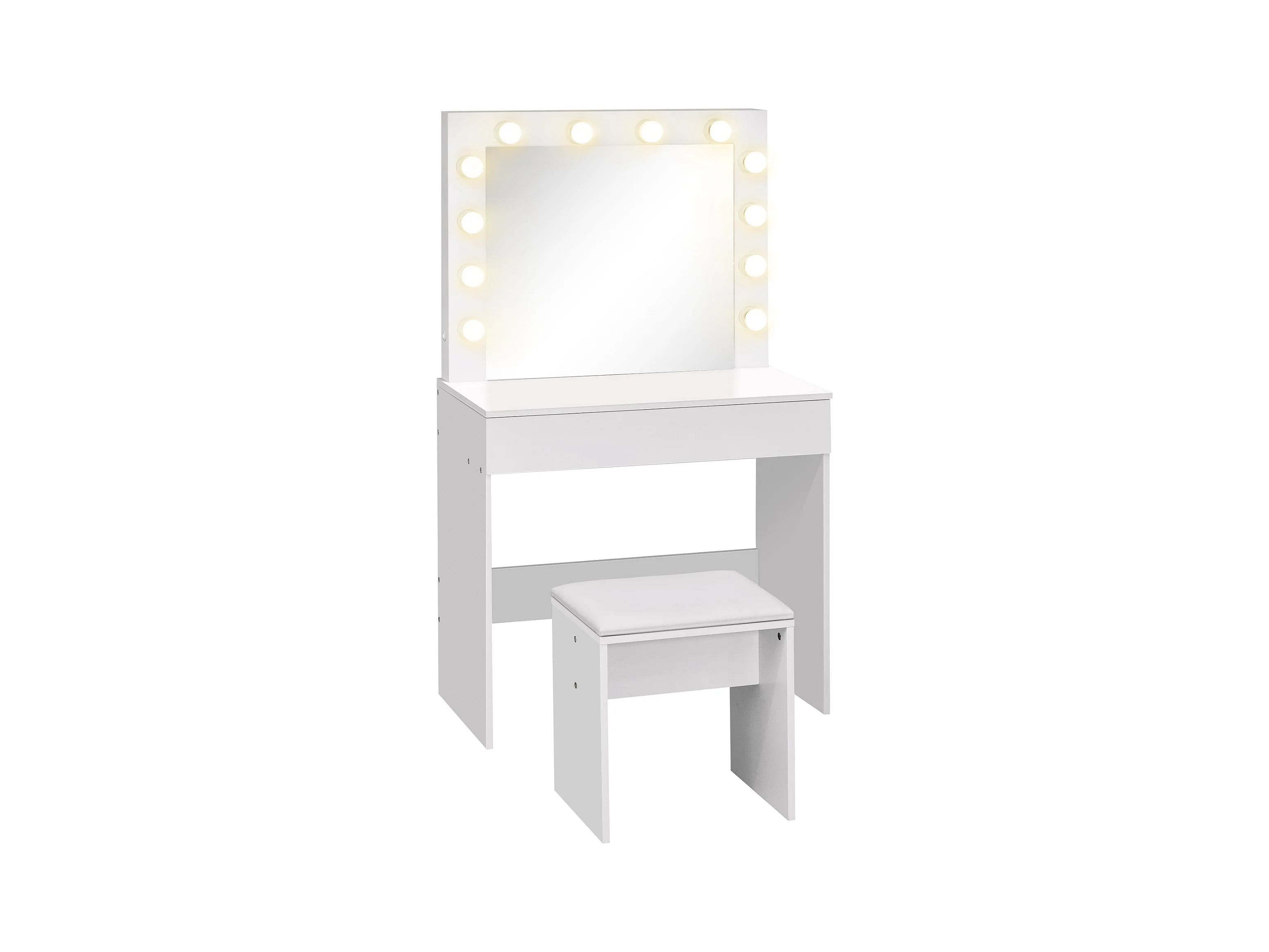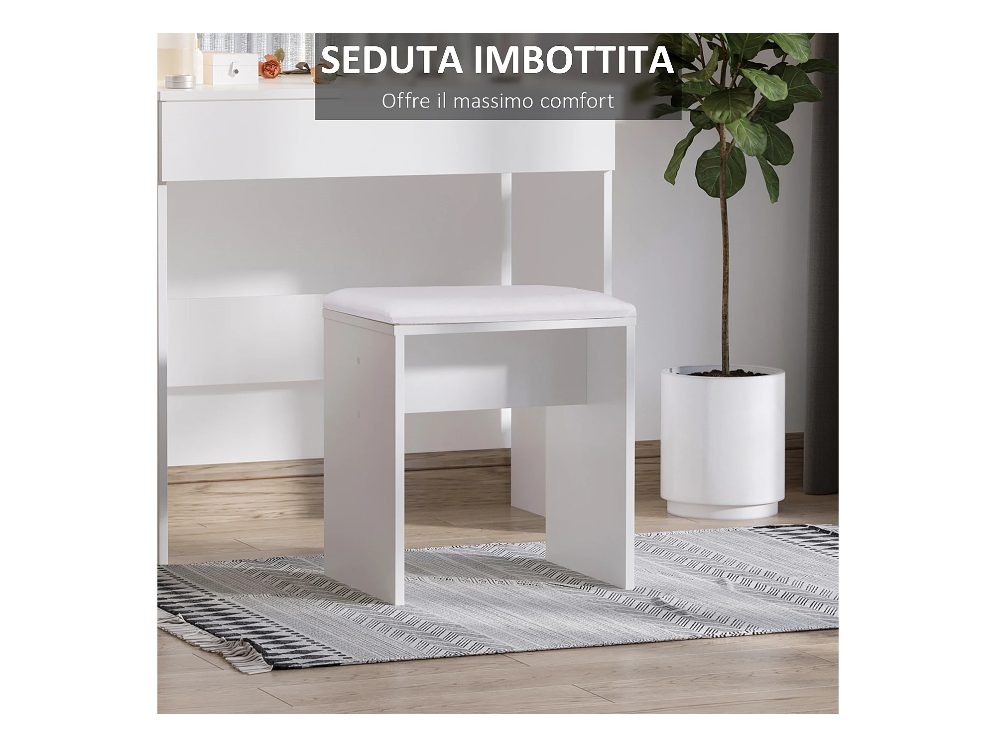 Set tavolo da trucco con specchio a led e sgabello in legno bianco