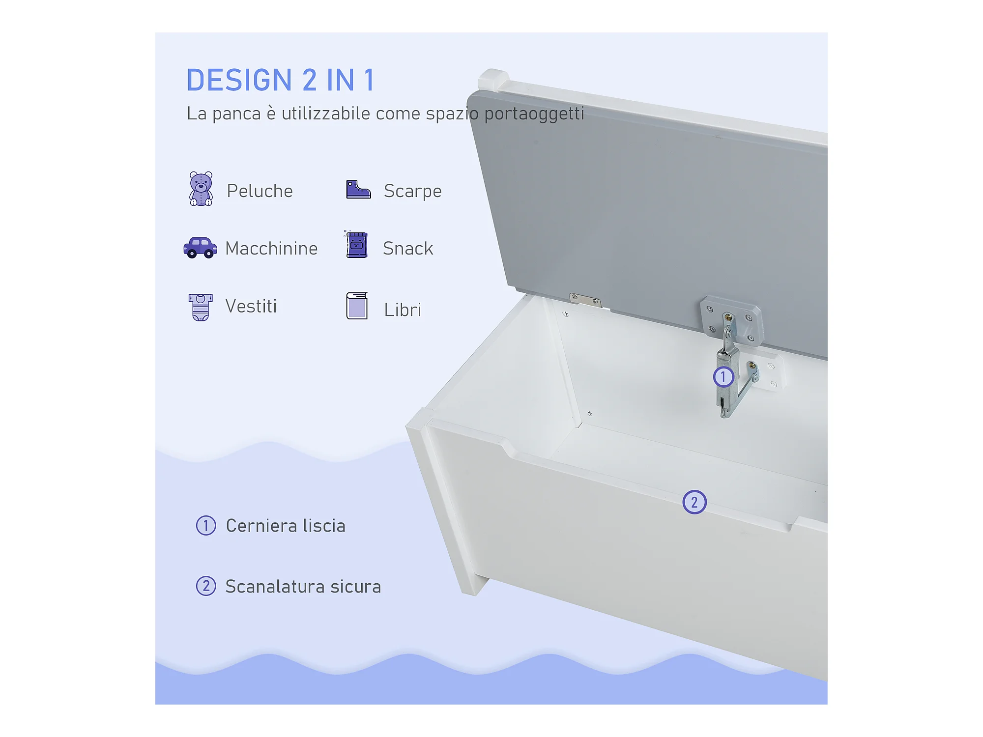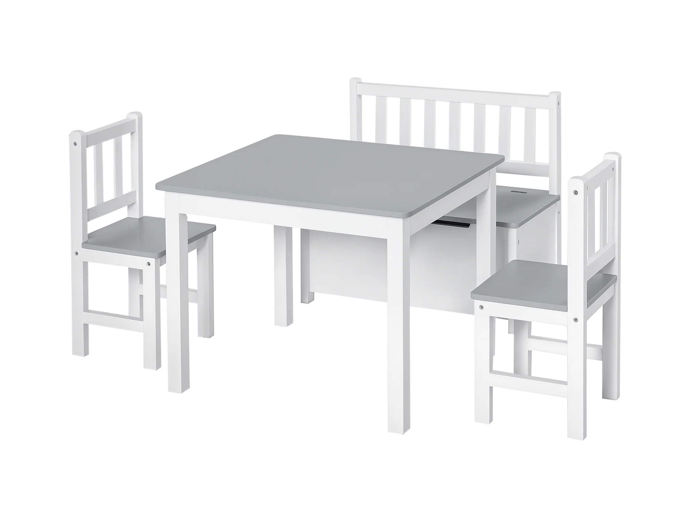 Set tavolo per bambini 2 sedie e cassapanca in legno bianco e grigio