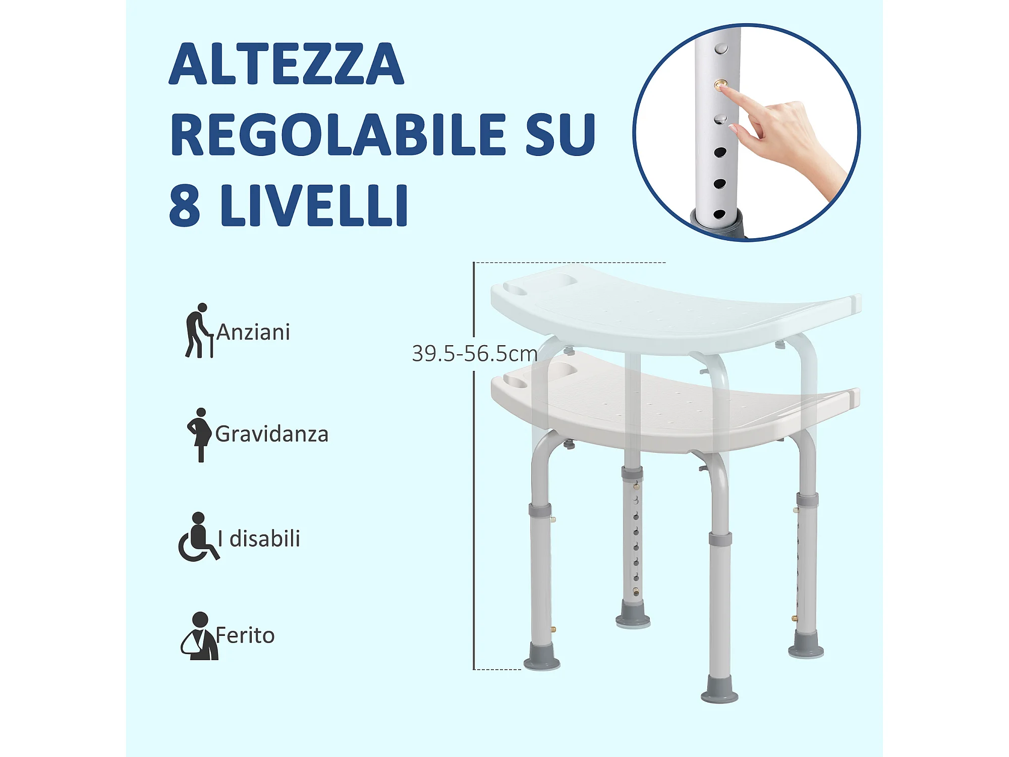 Sedia doccia regolabile su 8 livelli in alluminio e pe bianco argento