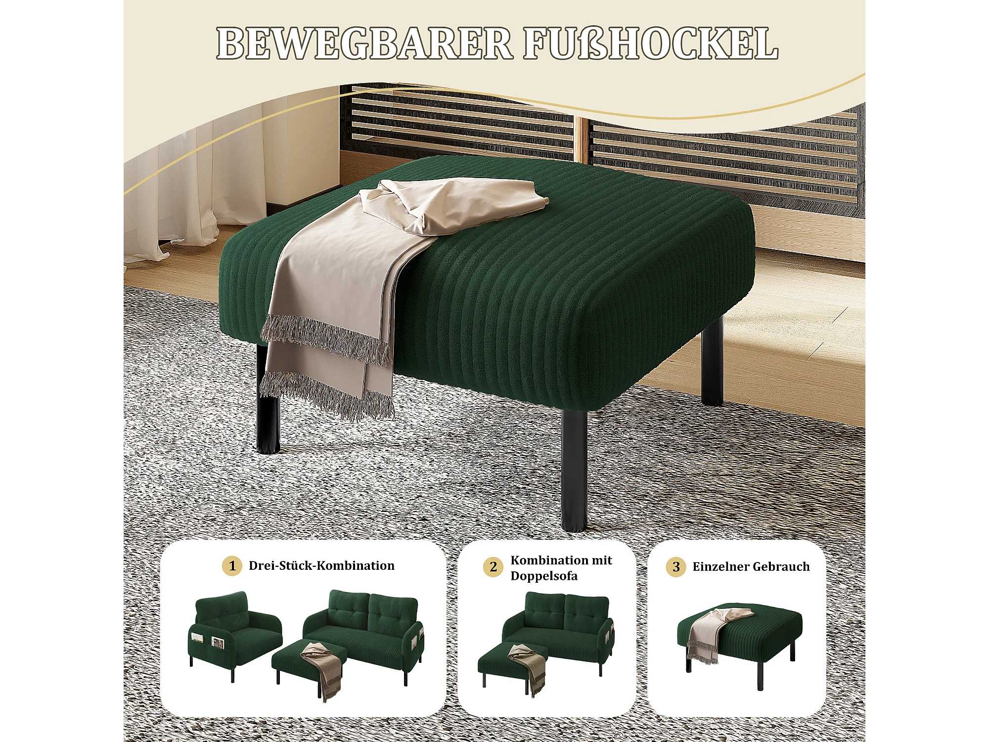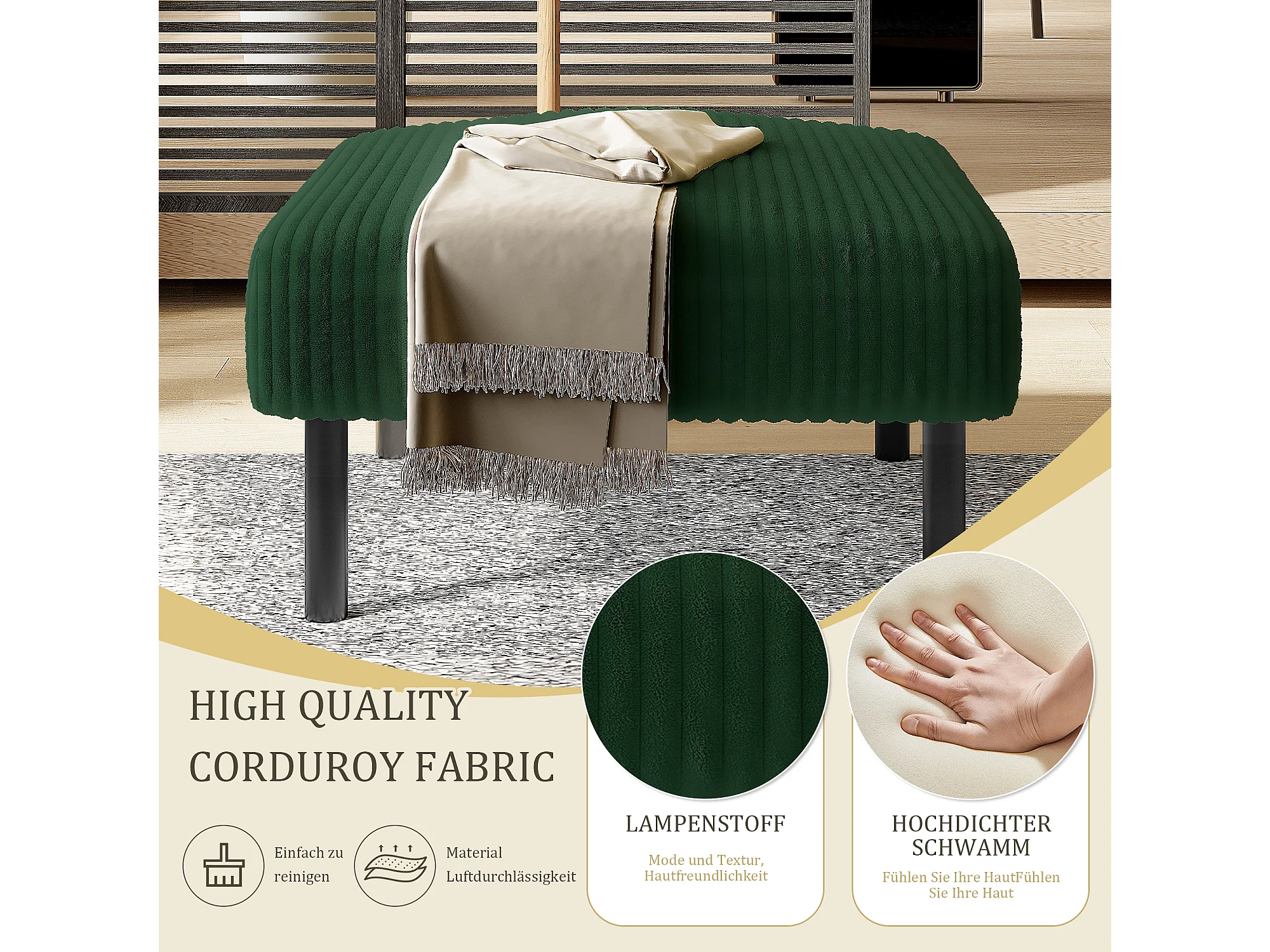 Sgabello in velluto a coste di alta qualità, design contemporaneo, metallo e schiuma, smeraldo (60x56x18 cm)