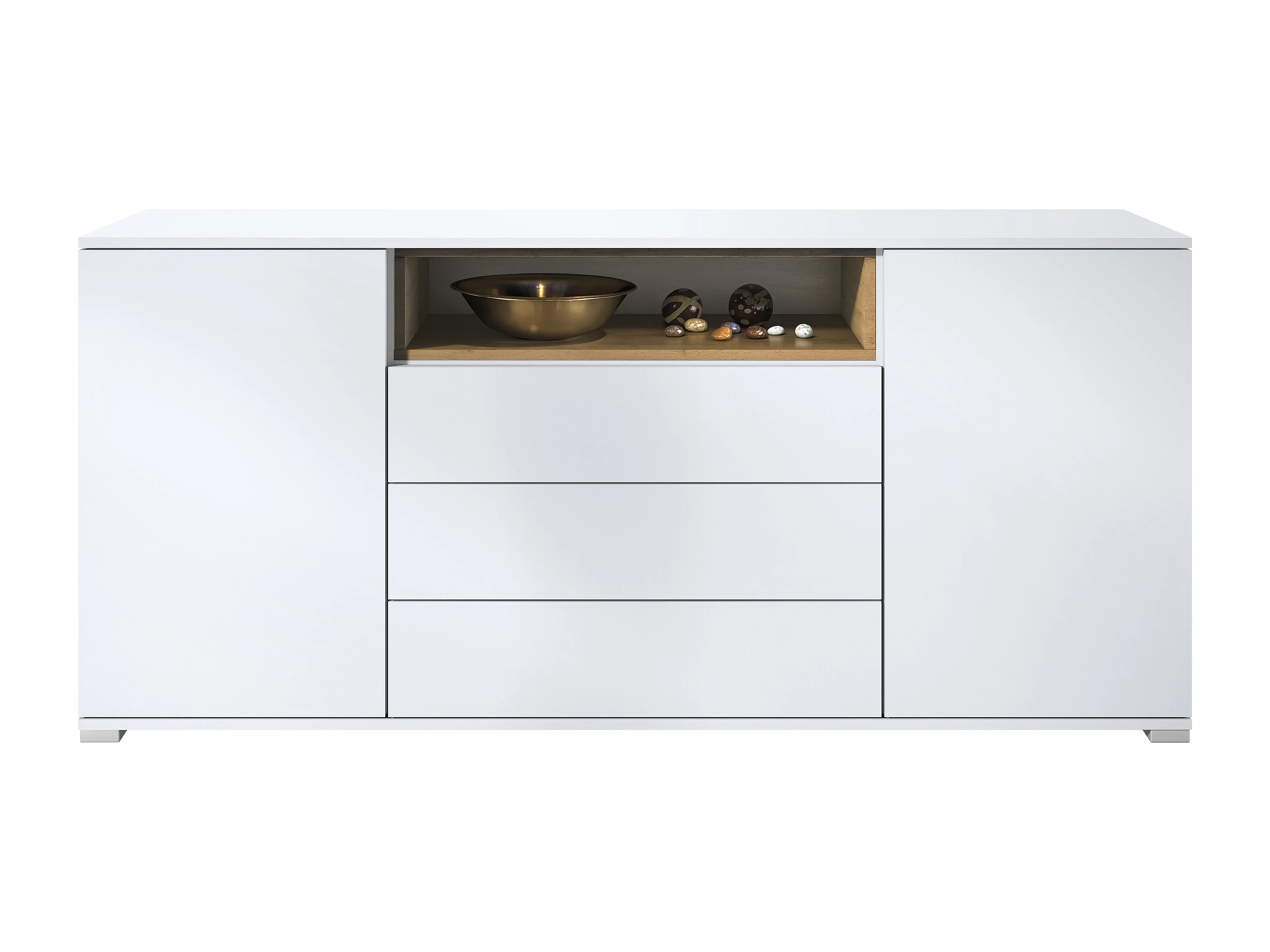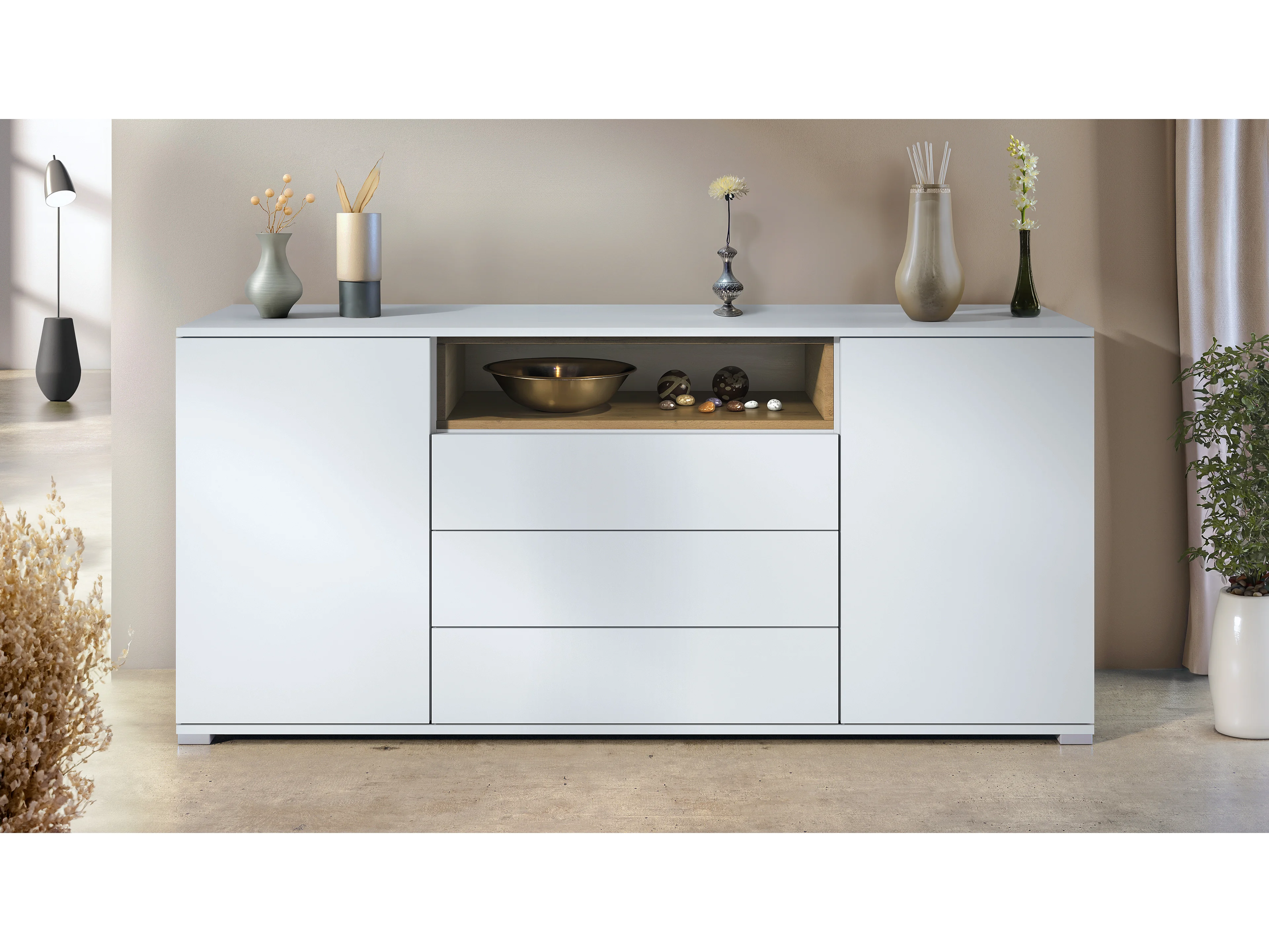 Skadu V4 Credenza, mobile con 2 ante, 3 cassetti e 1 scomparto a giorno, bianco opaco/Quercia Evoca (166,5 x 75,5 x 35 cm)