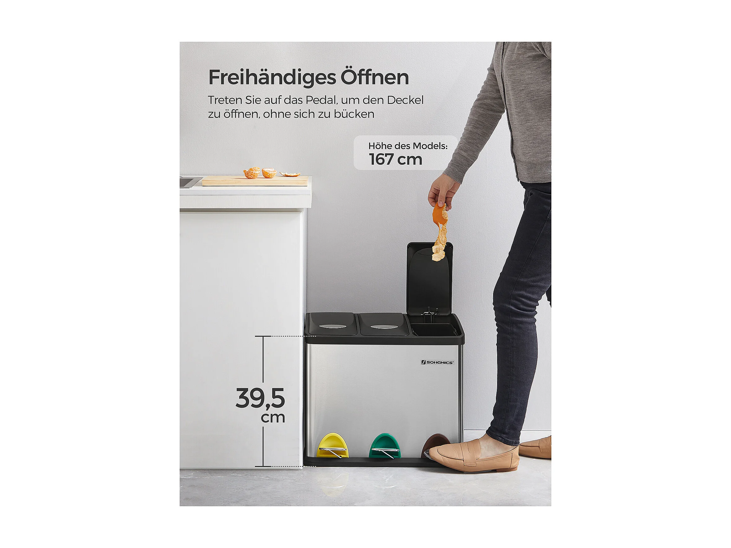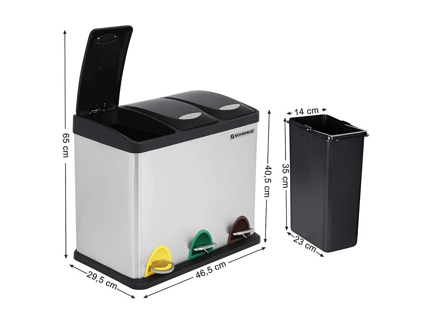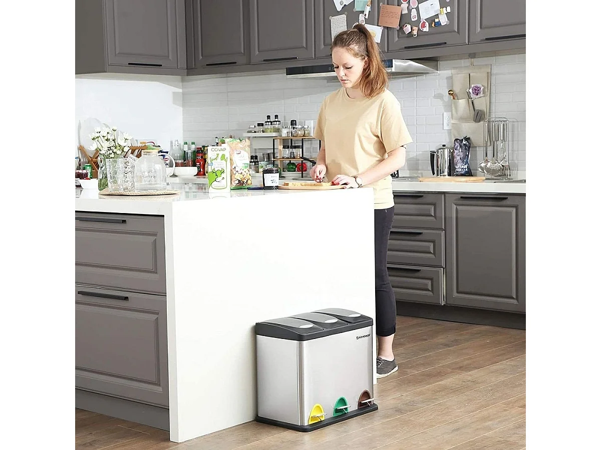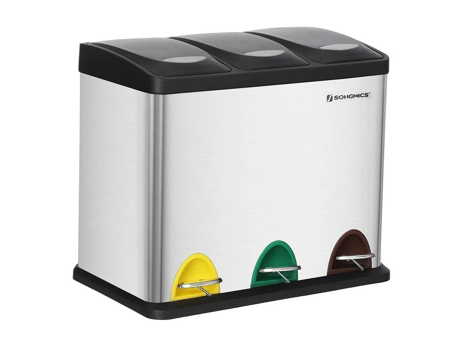 SONGMICS Pattumiera per il riciclaggio, pattumiera a pedale 3 in 1, pattumiera in metallo da 24 litri, pattumiera per la separazione dei rifiuti in cucina, facile
