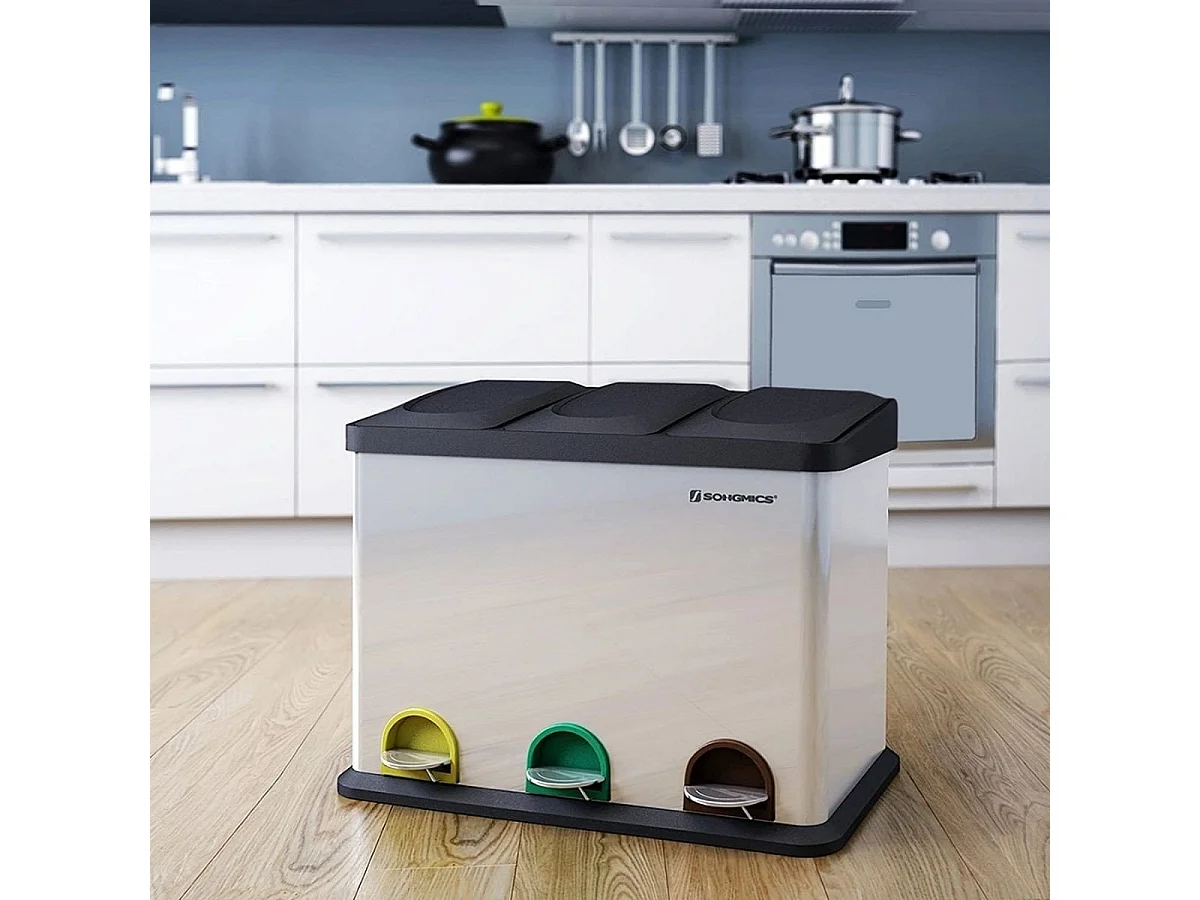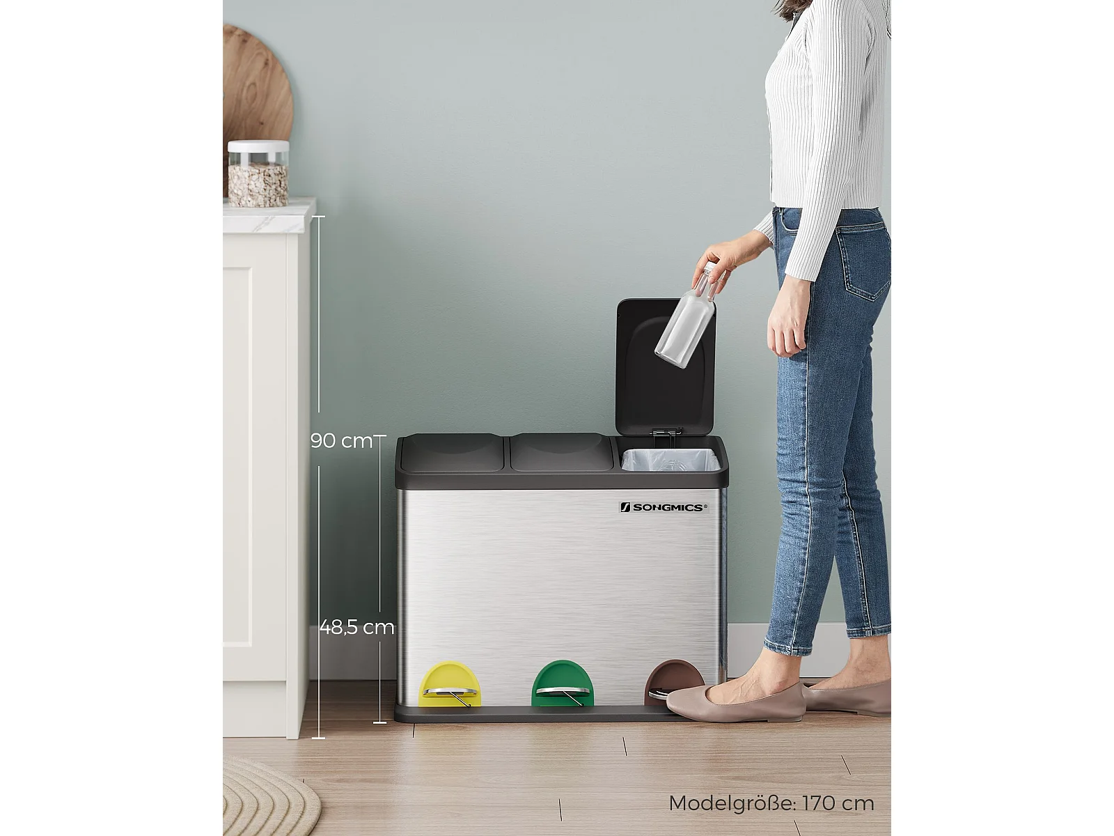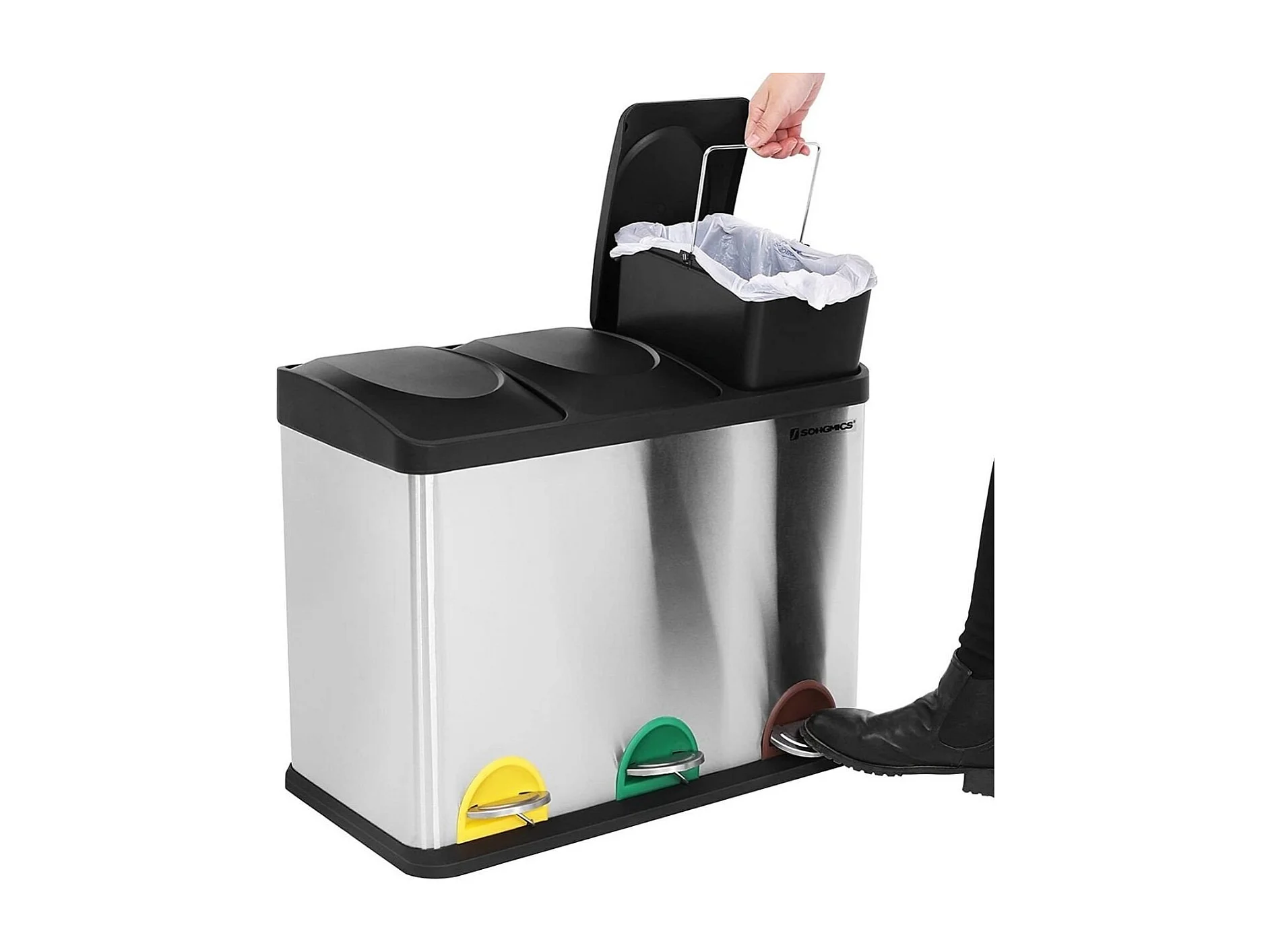 SONGMICS Pattumiera per il riciclaggio, pattumiera a pedale, pattumiera in metallo da 45 litri, pattumiera per la separazione dei rifiuti in cucina, resistente, 3