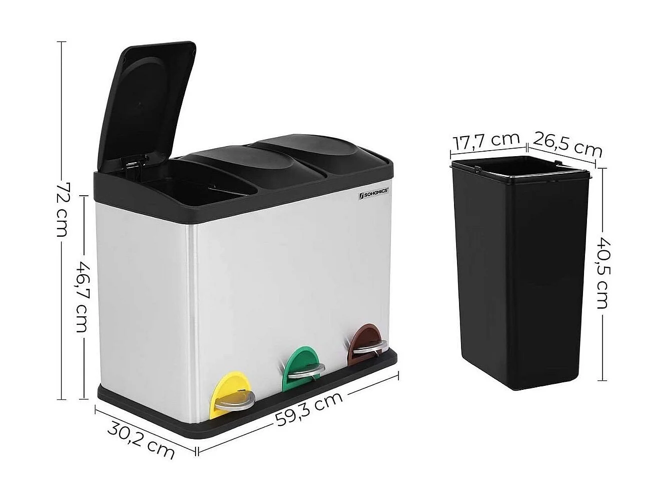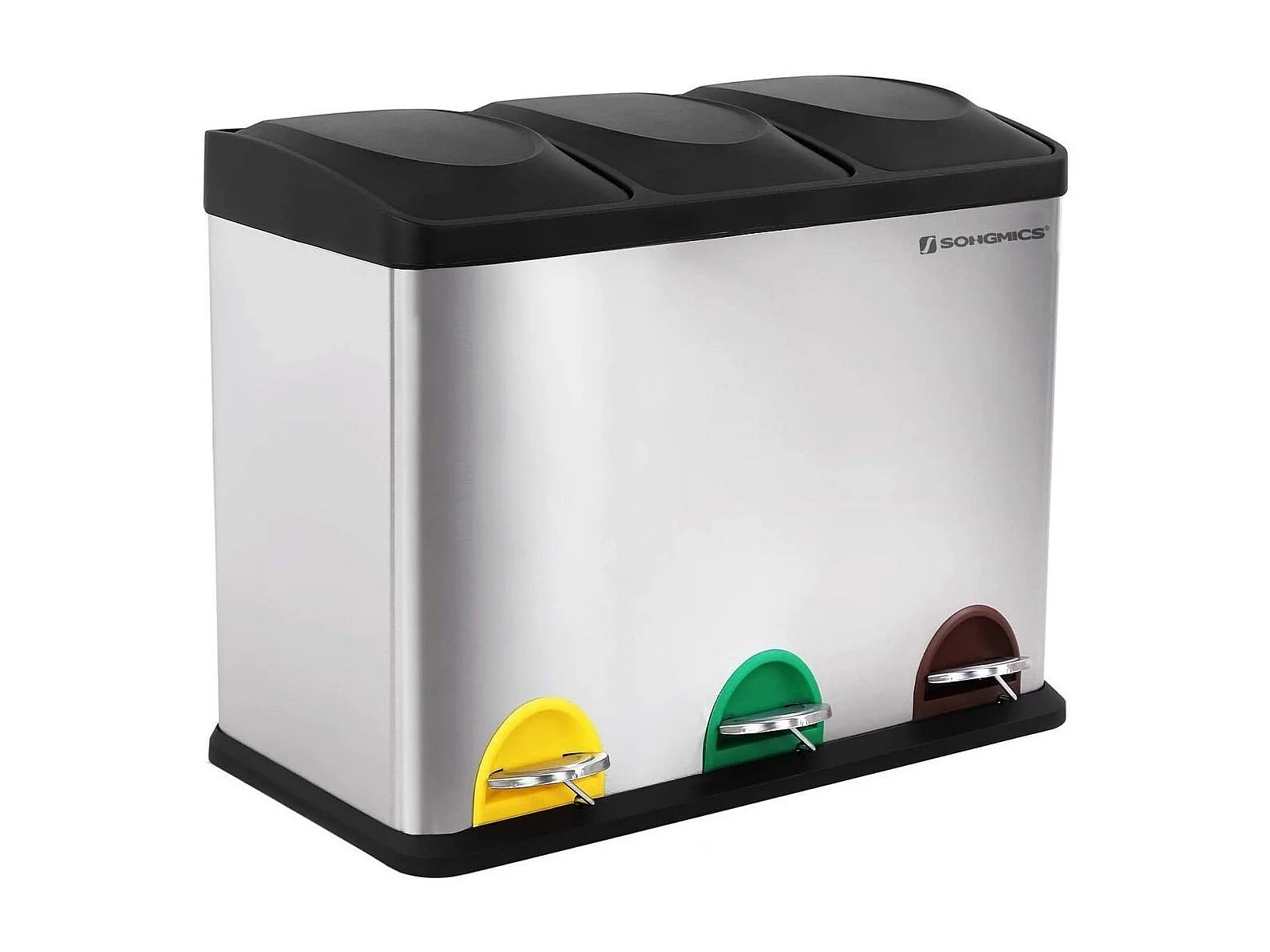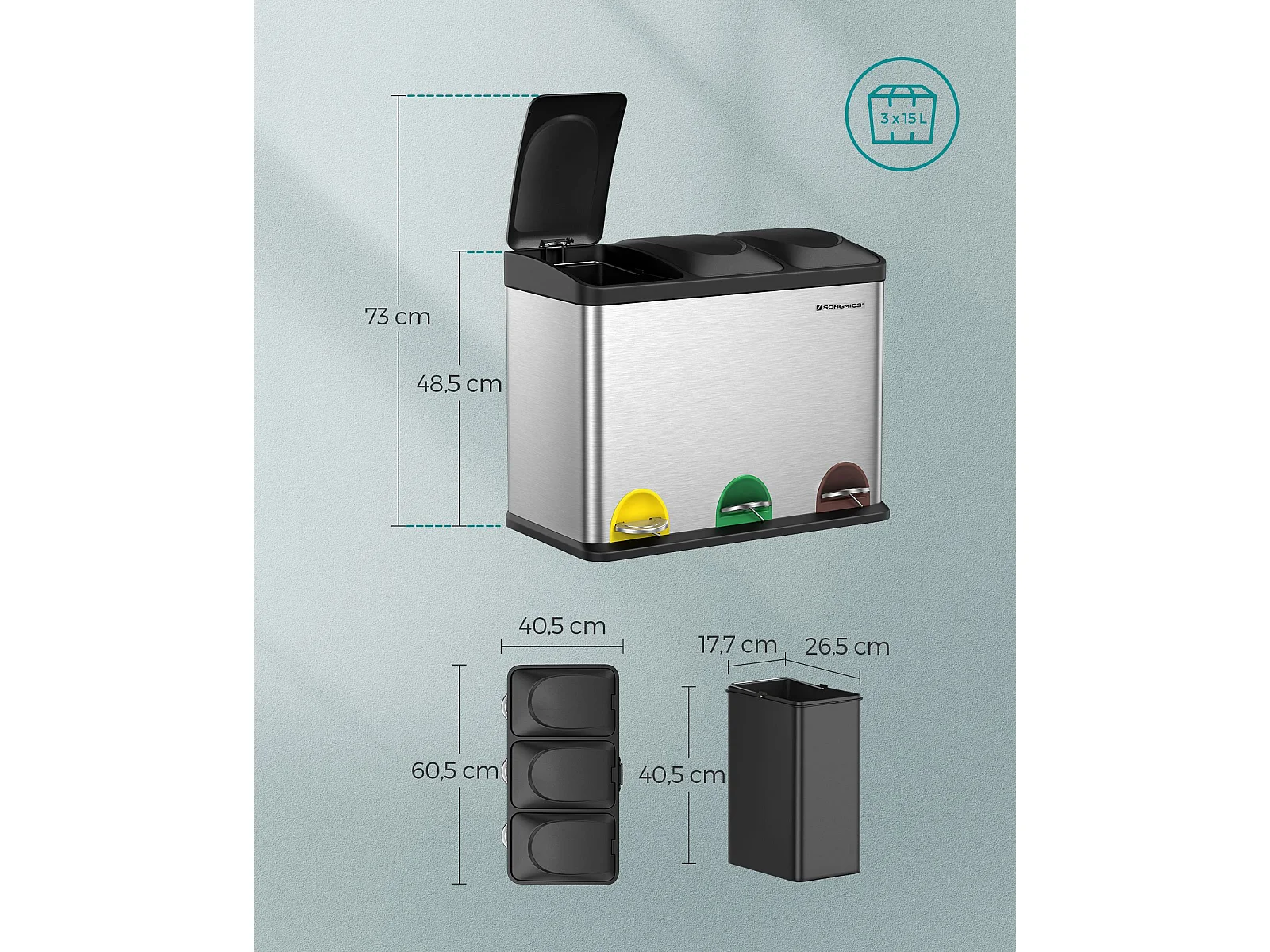 SONGMICS Pattumiera per il riciclaggio, pattumiera a pedale, pattumiera in metallo da 45 litri, pattumiera per la separazione dei rifiuti in cucina, resistente, 3