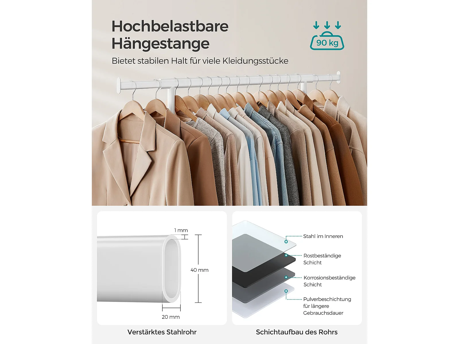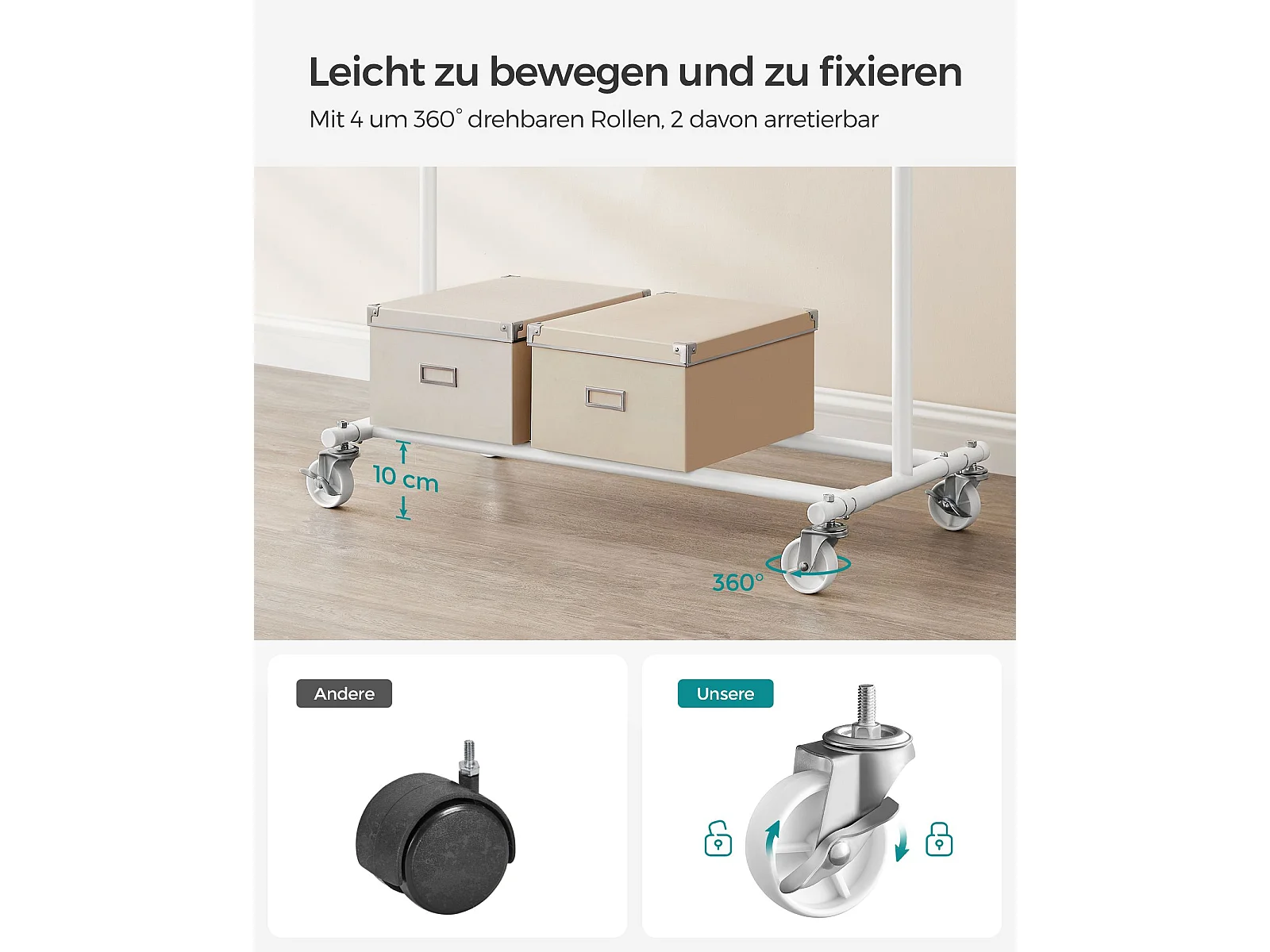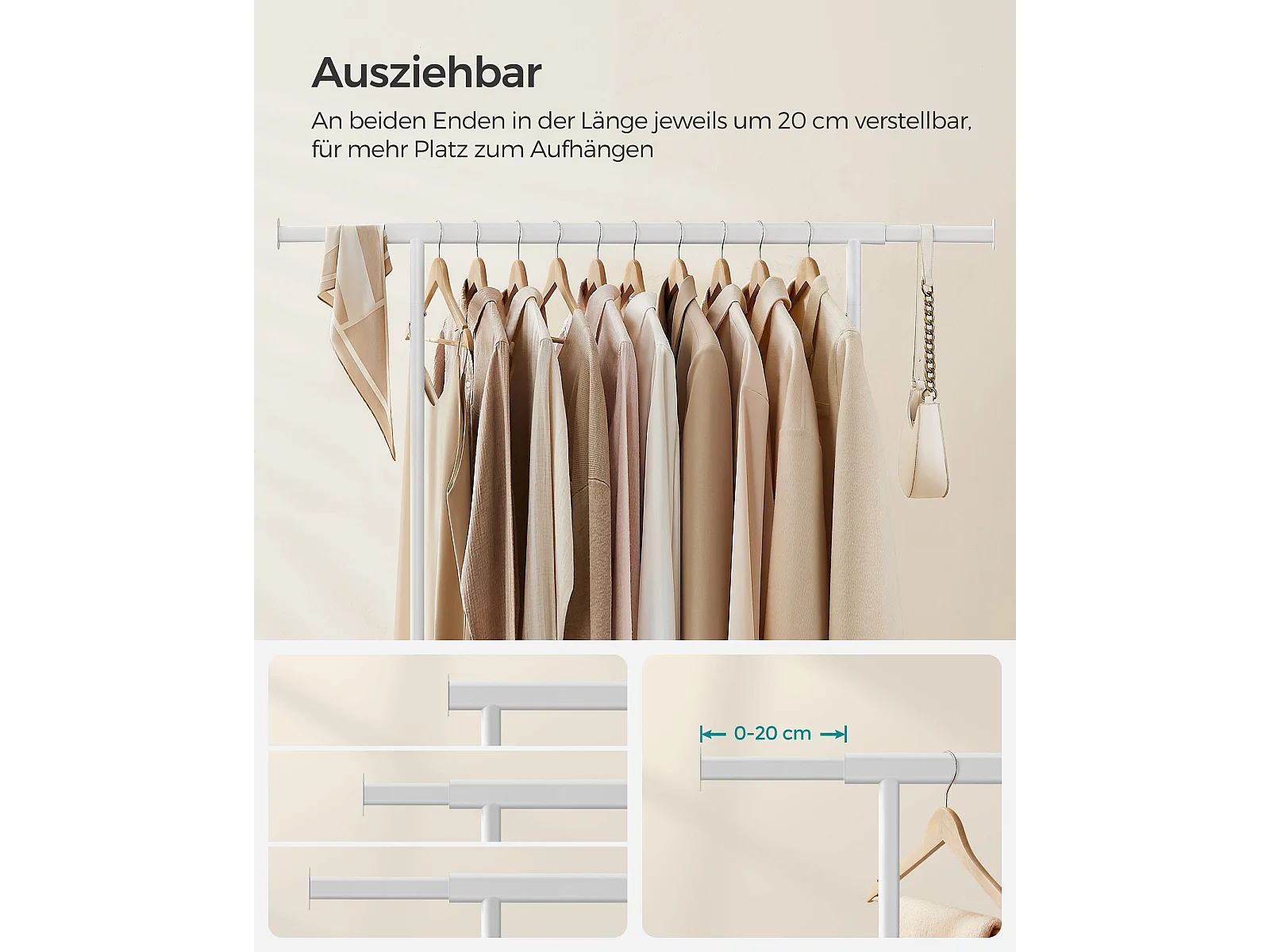 SONGMICS Stendibiancheria su rotelle, asta appendiabiti per impieghi gravosi, con asta appendiabiti estensibile, capacità di carico di 90 kg, facile da montare,
