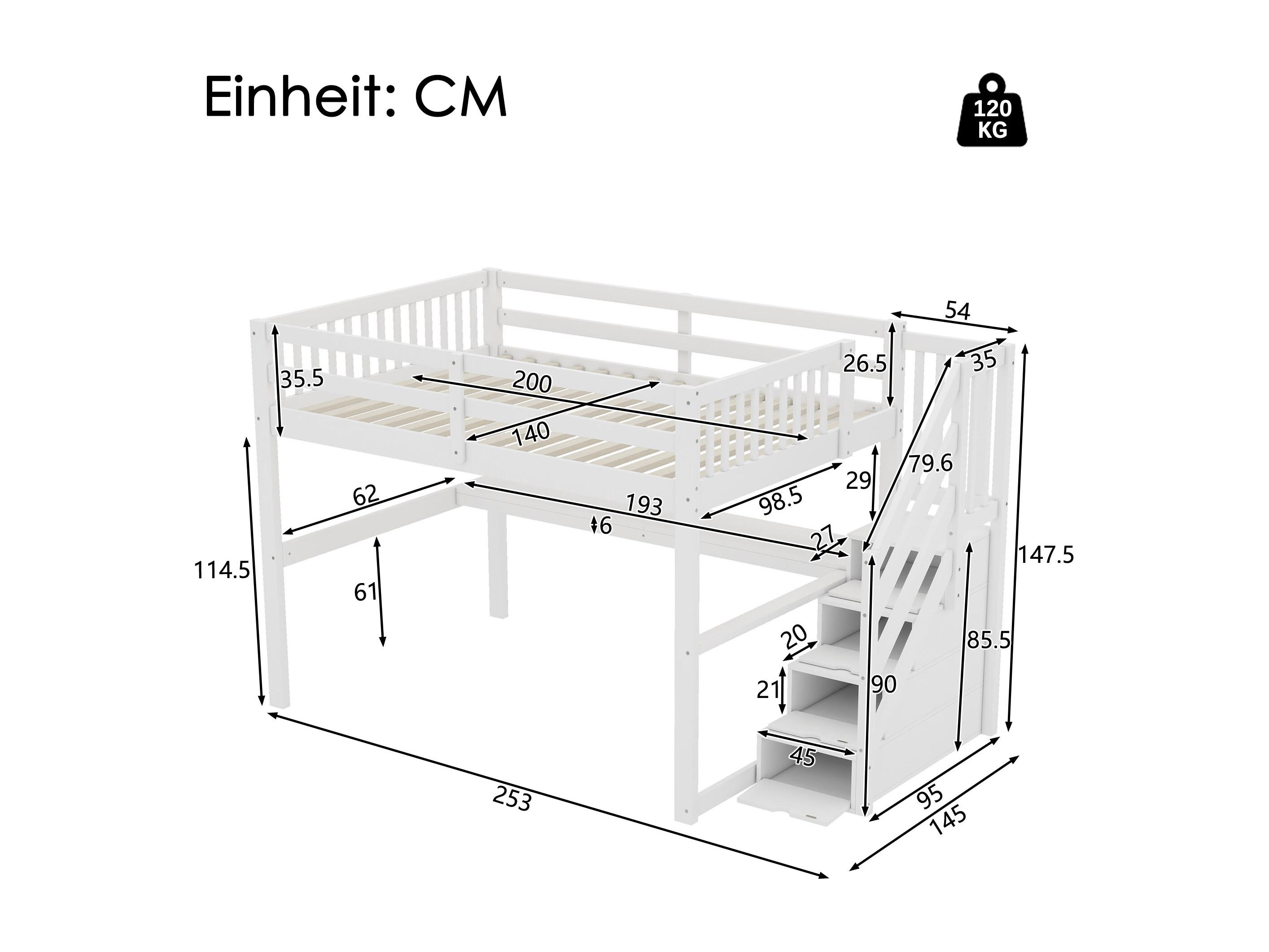 Letto a soppalco 140x200cm - letto per bambini con scaletta con armadio, rete a doghe, protezione anticaduta - bianco