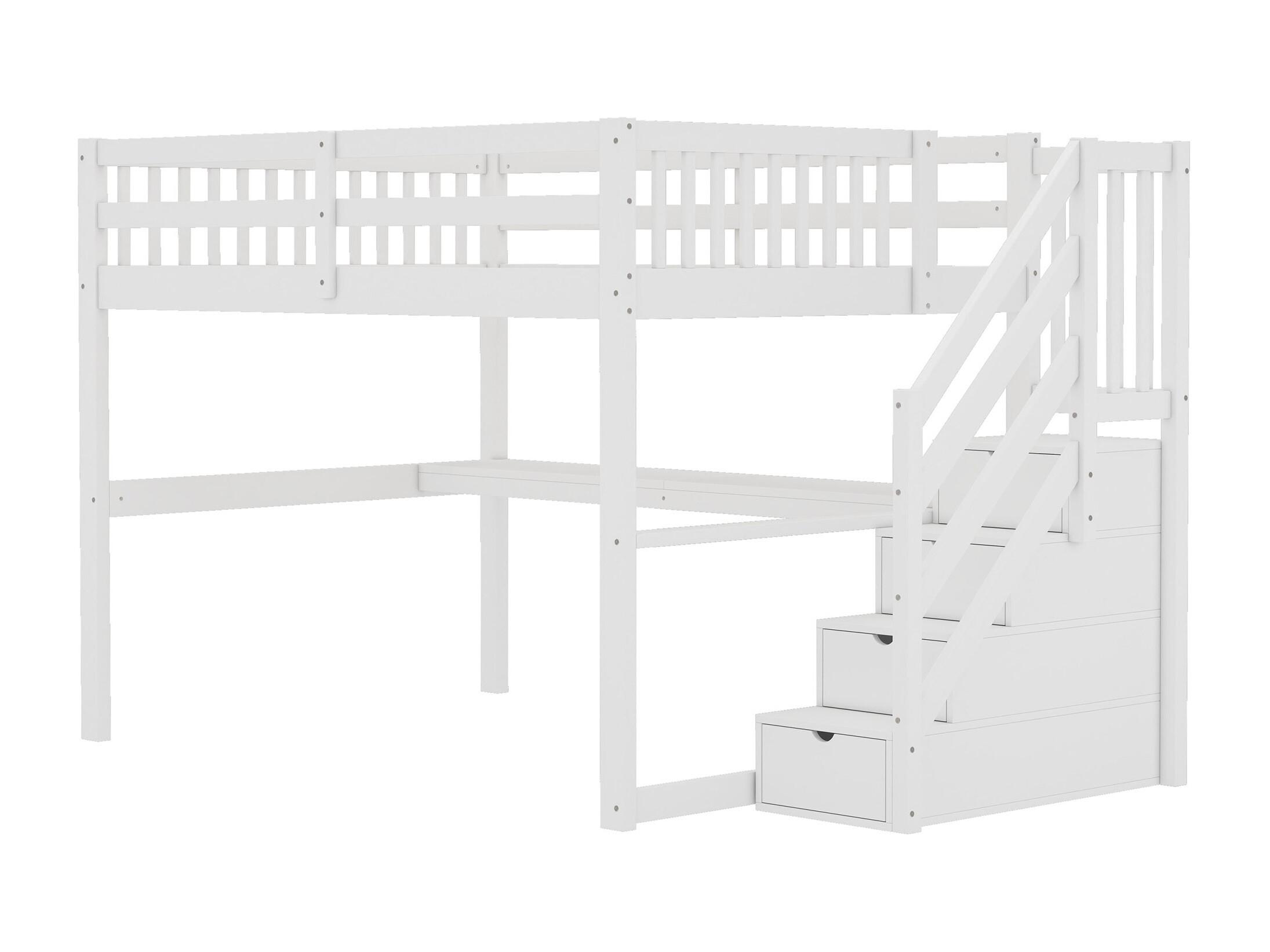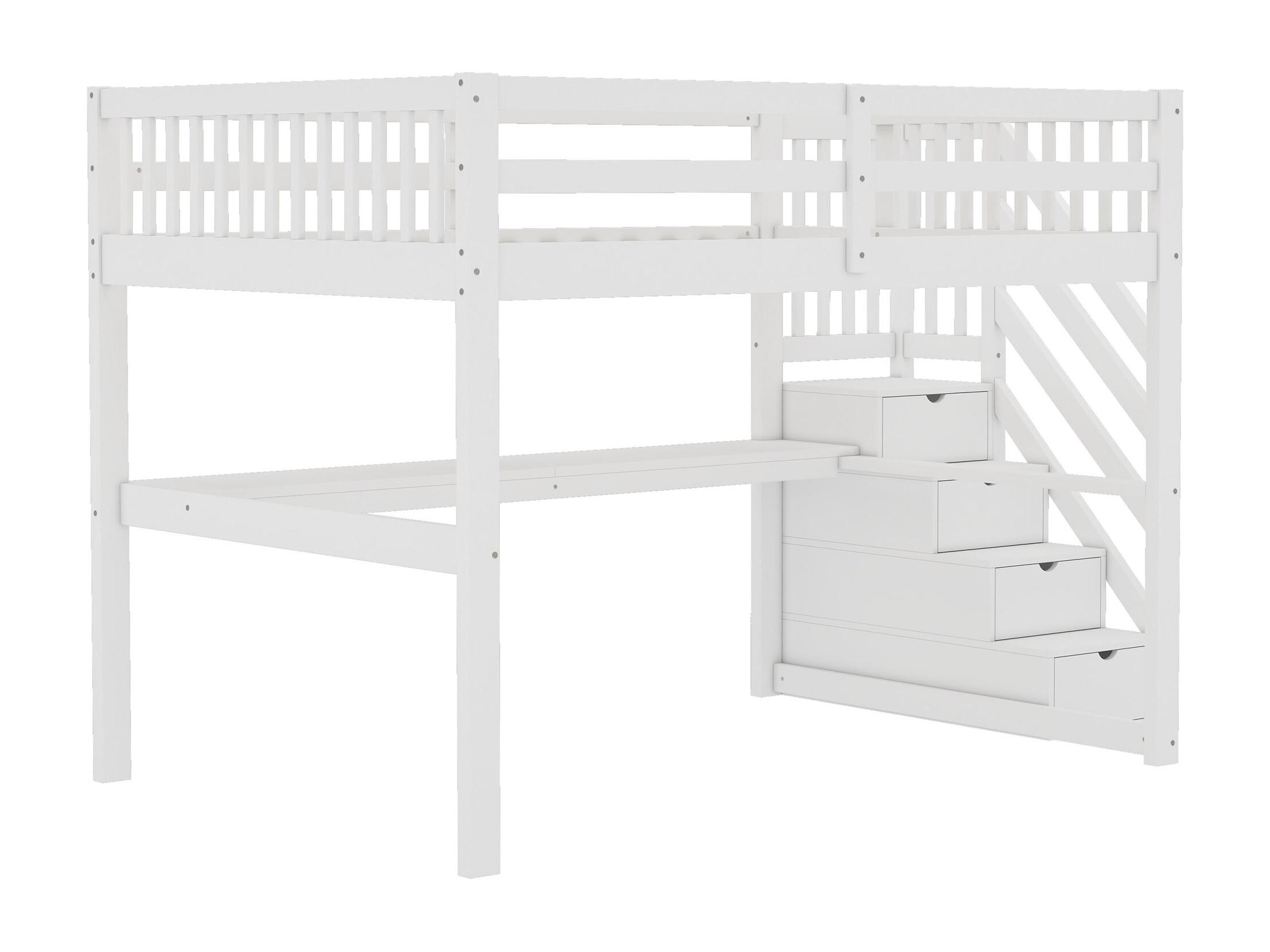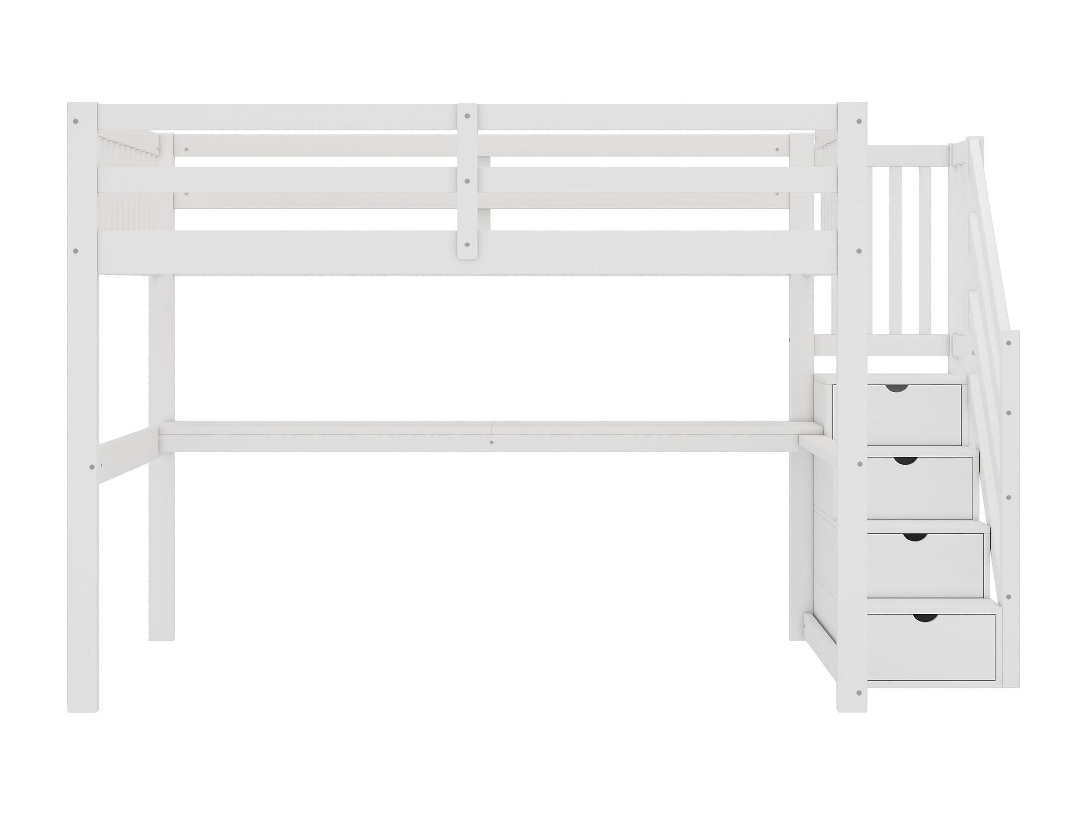 Letto a soppalco con scrivania, 140x200 cm, legno di pino, bianco, con scala e contenitore integrato